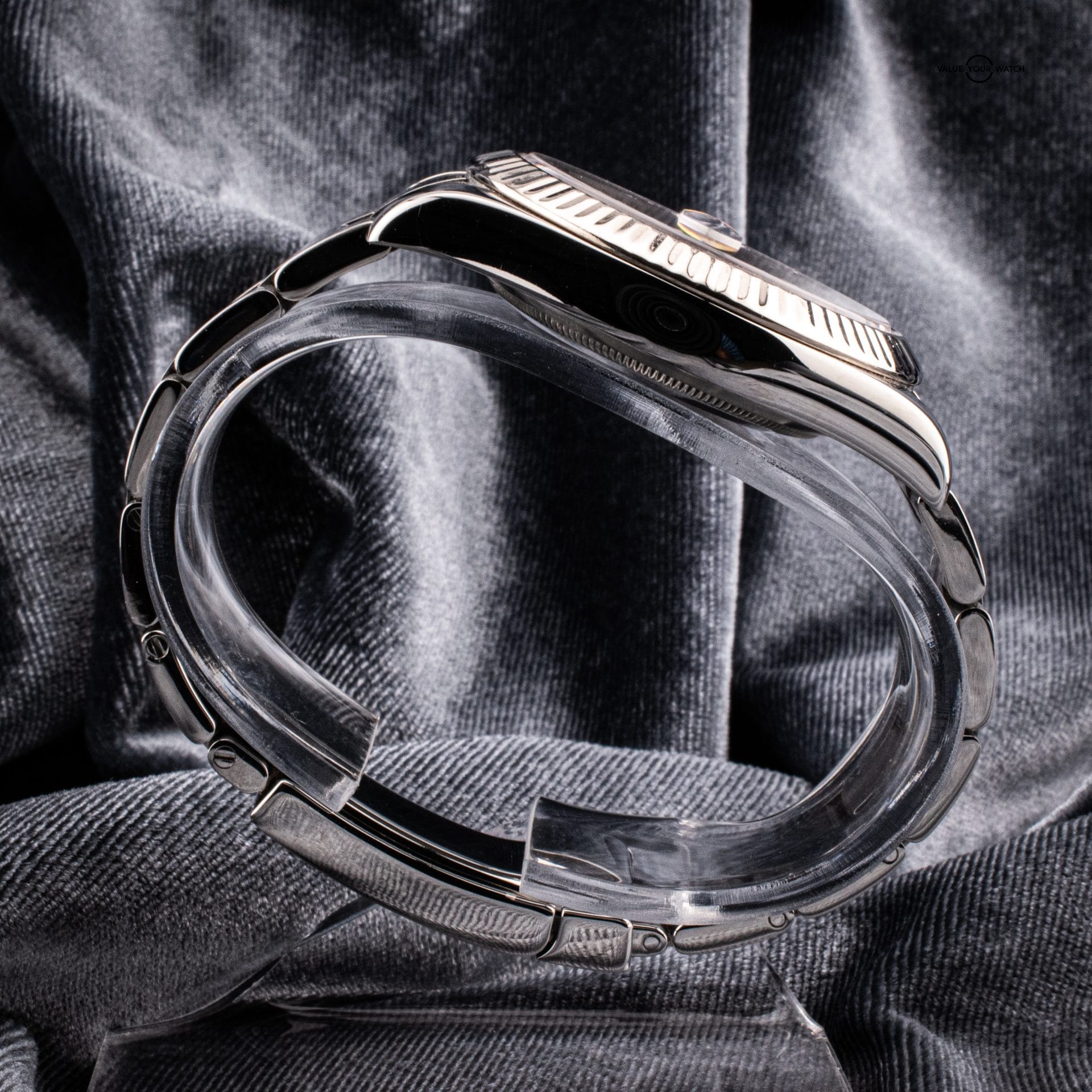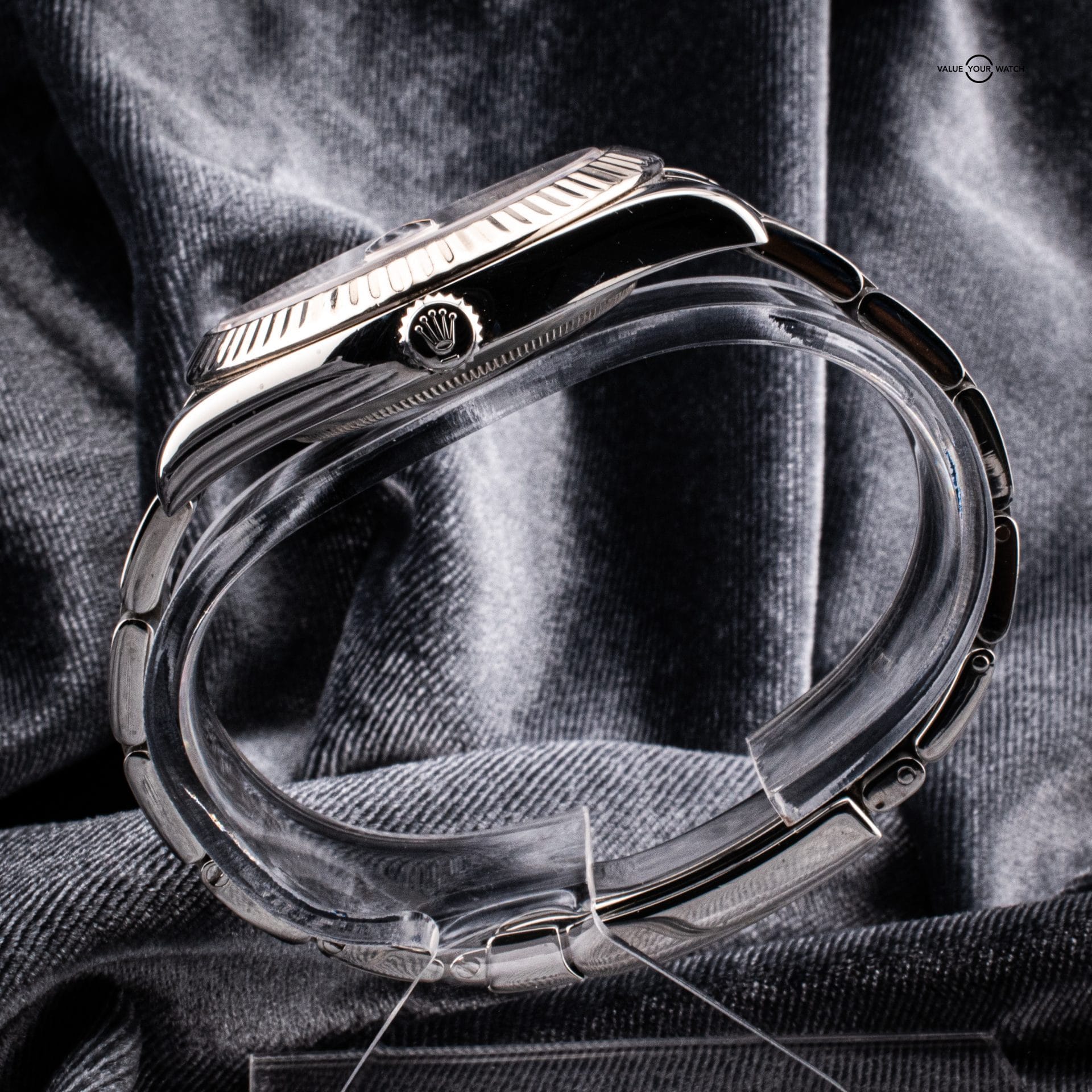 Contents: Rolex Box, Tourneau warranty card, hang tag and Watch with twelve full links