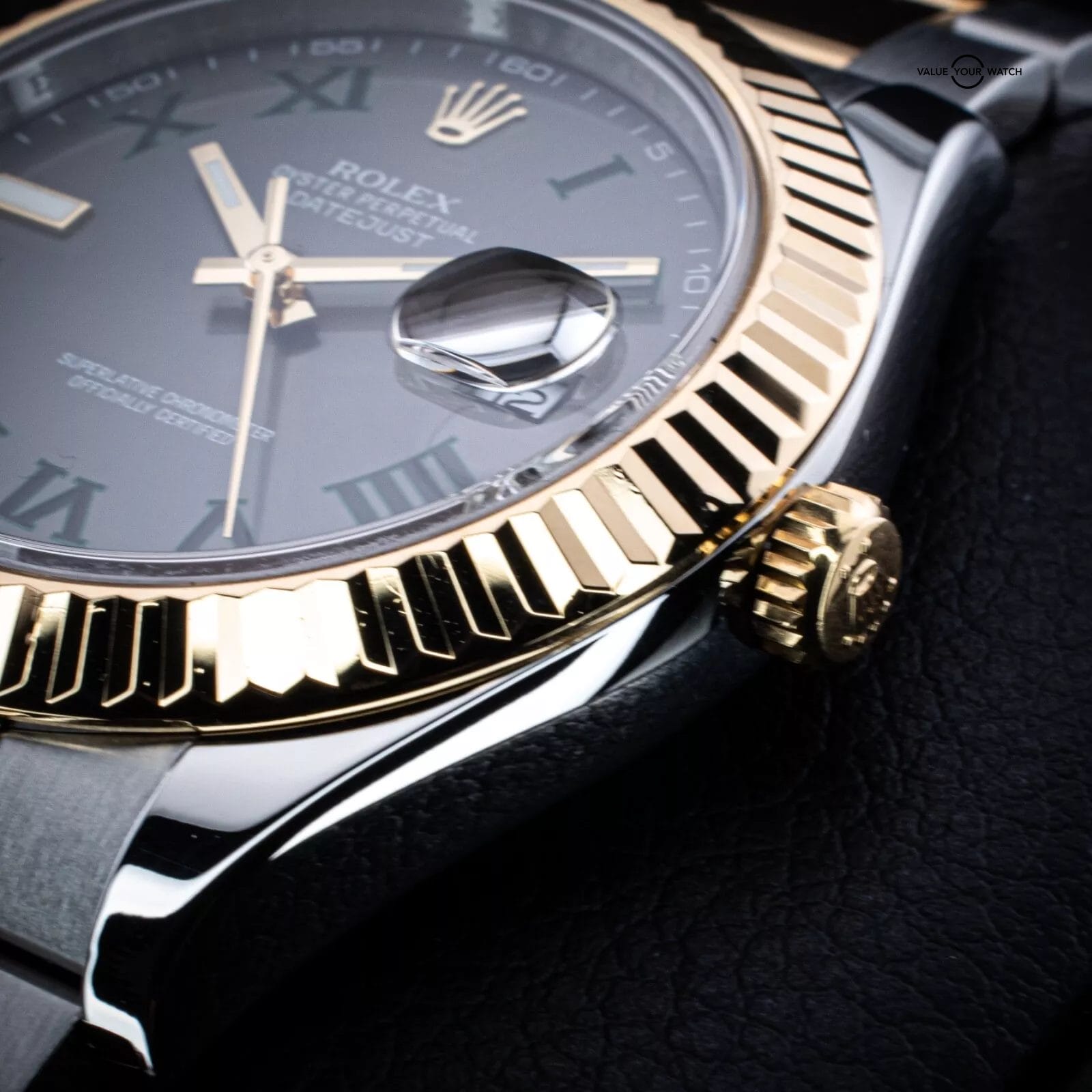 Dial: Silver sunburst dial with green Roman numeral hour markers, date window at 3 o’clock
