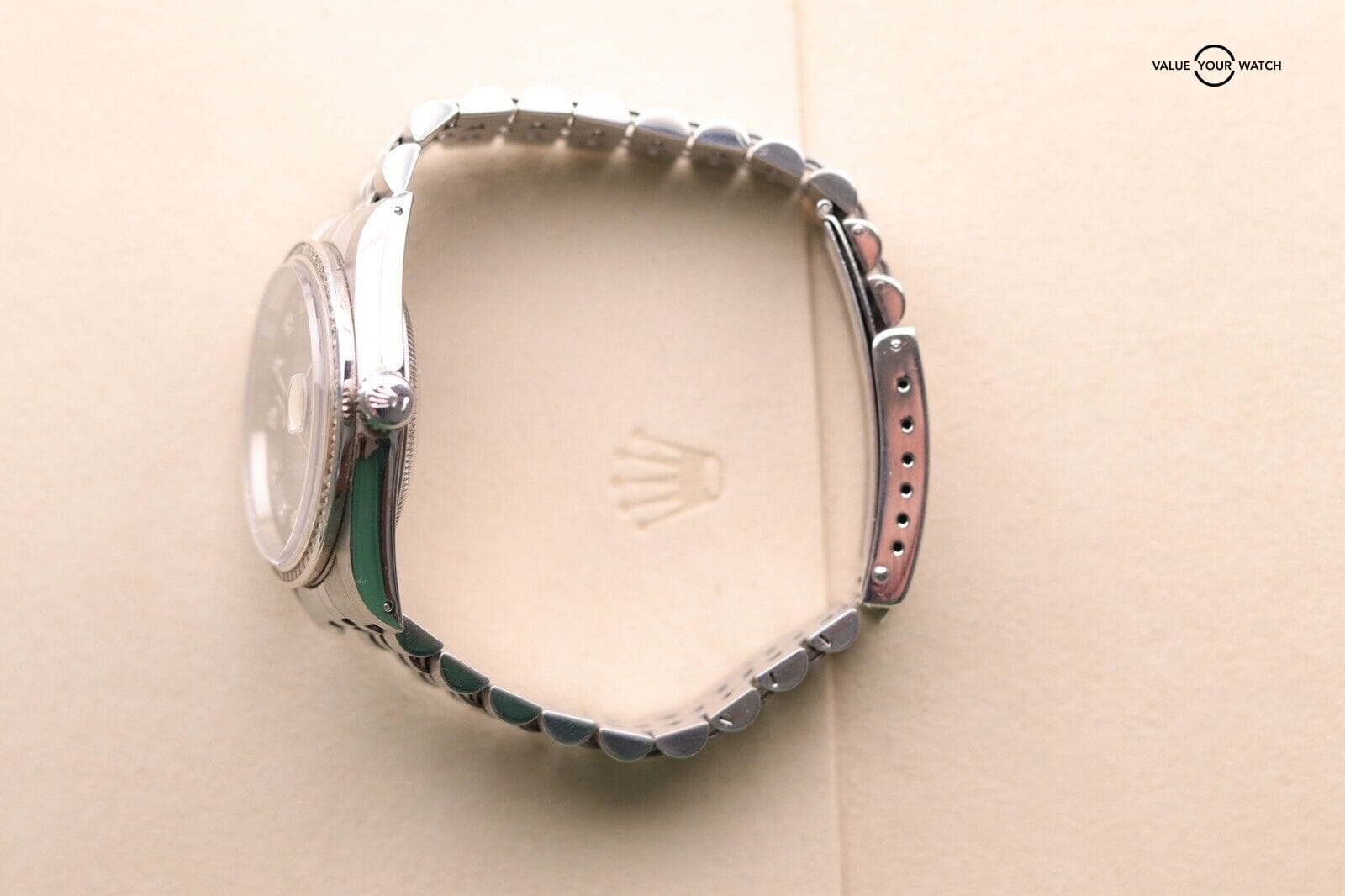 Diamond Dial and Bezel: One of the standout features of this vintage Datejust is its diamond-adorned dial and bezel. The dial features diamond hour markers that add a touch of luxury and sophistication. The diamond-set white gold bezel complements the dial, creating a harmonious and eye-catching appearance.
