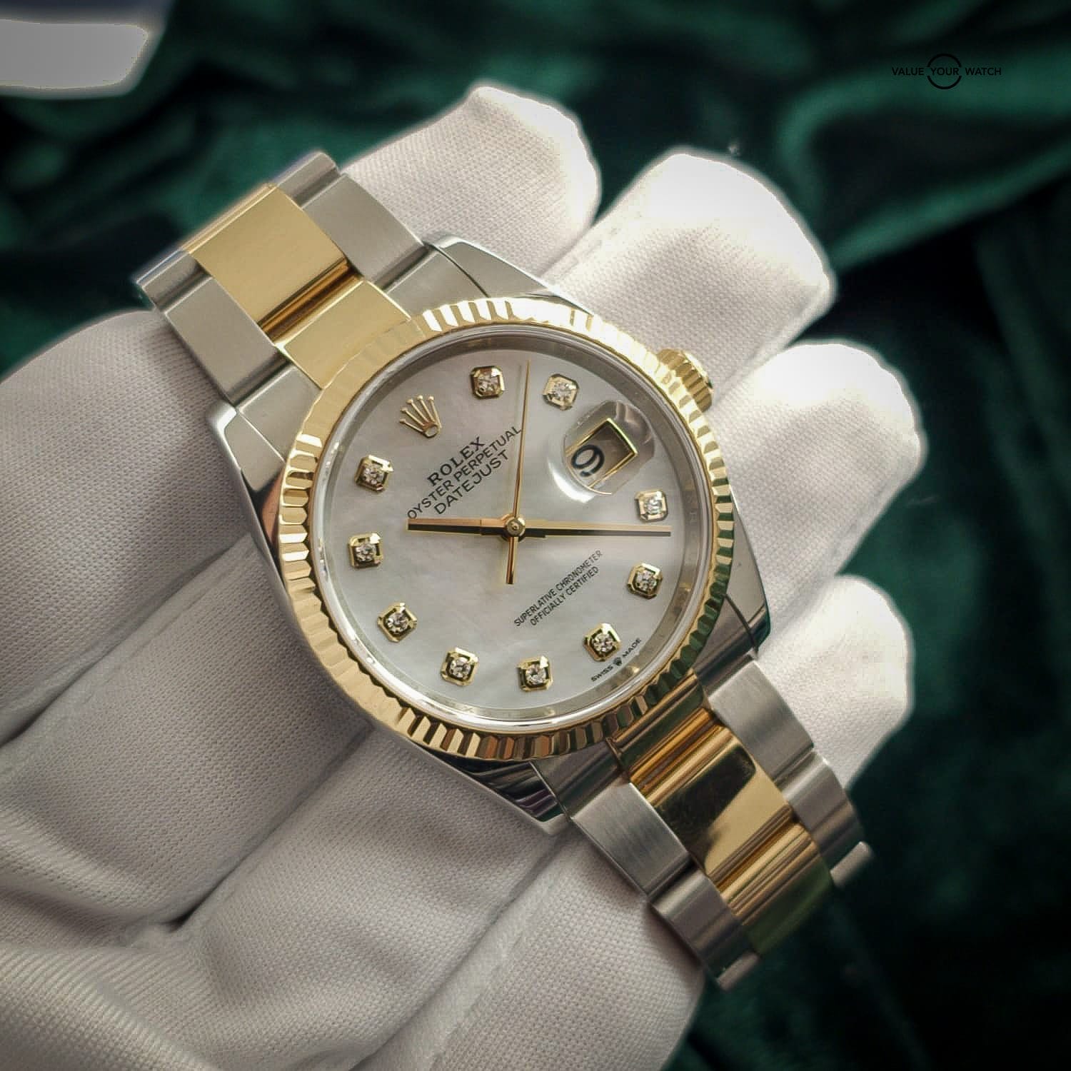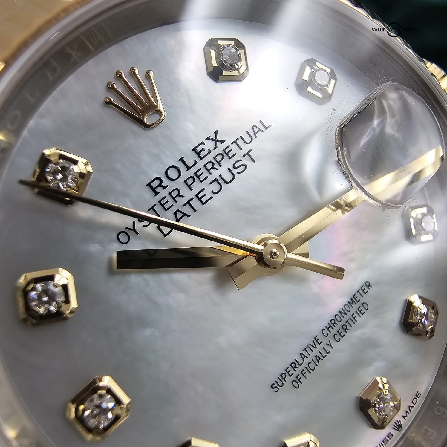Dial: Mother of pearl dial with diamond numerals