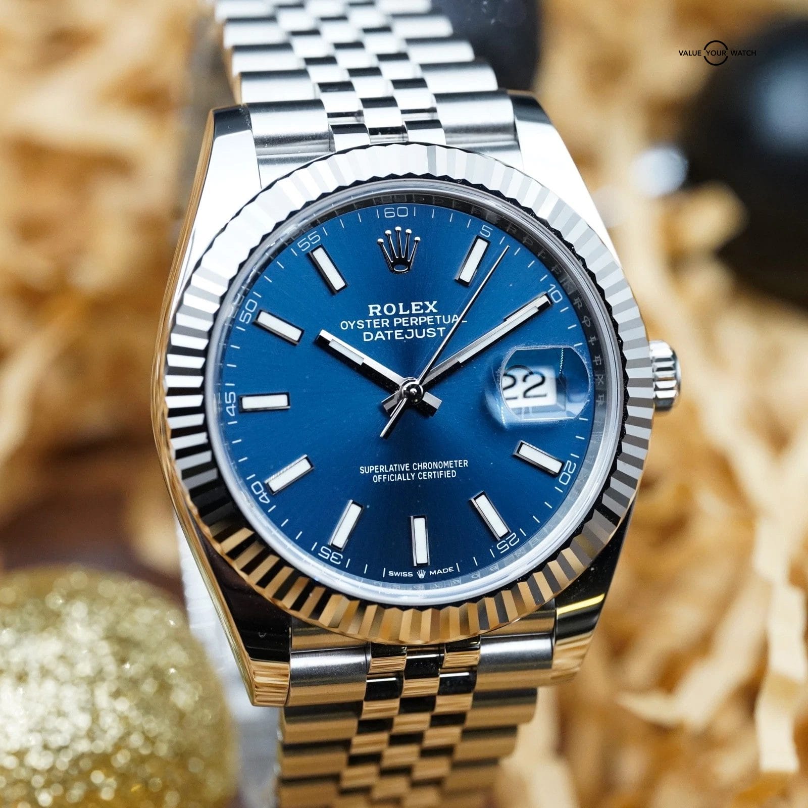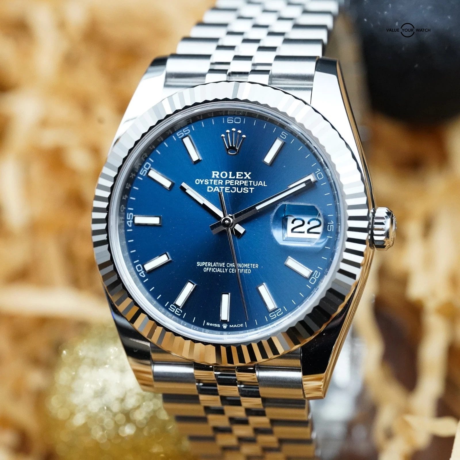 The most light-conic configuration in the catalogue: jubilee bracelet, fluted bezel, and a mesmerizing sunburst blue dial.