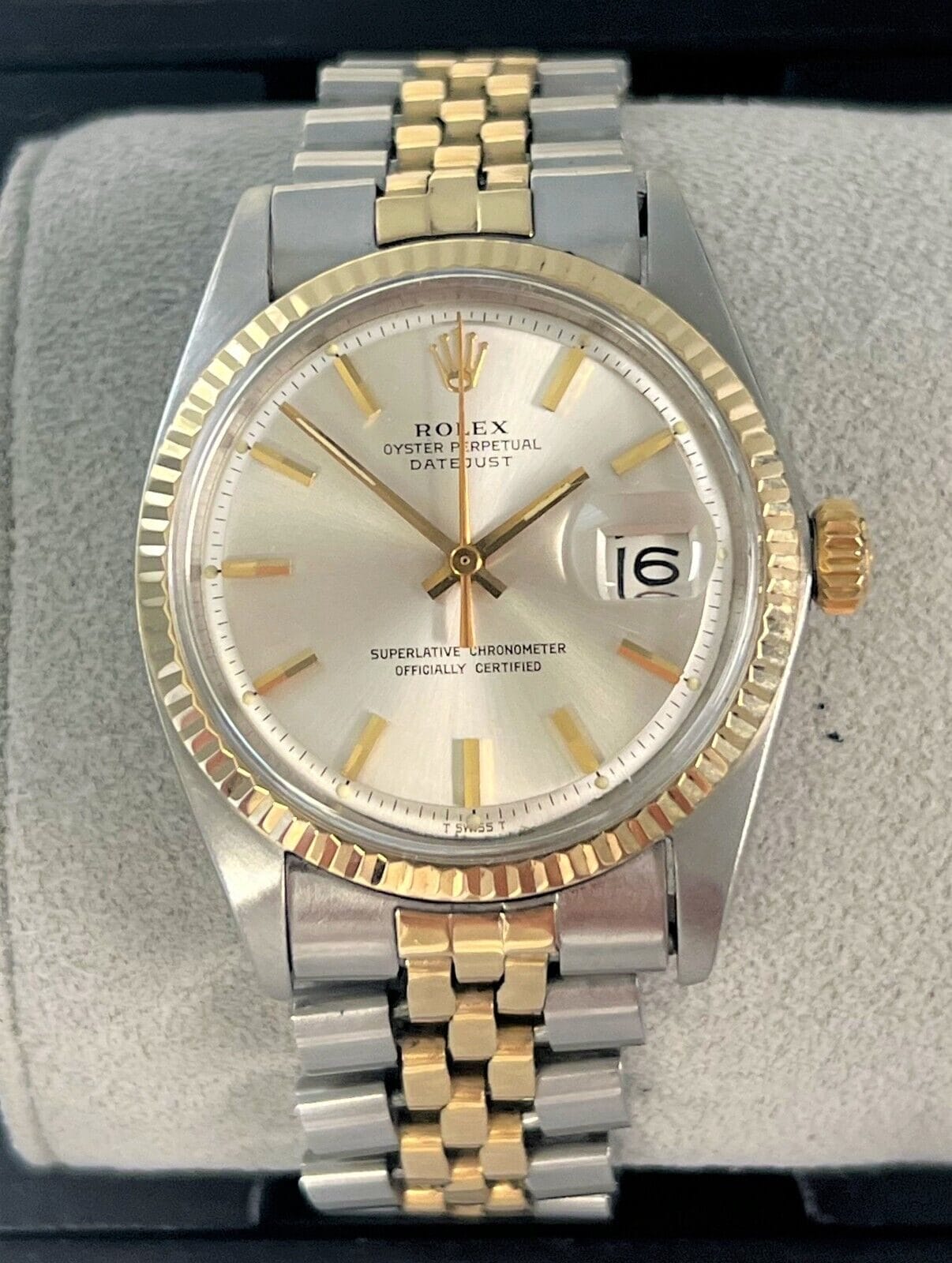 The Rolex Datejust 1601 features a 36mm stainless steel case, a size that’s comfortable for most wrist sizes and can be worn on a variety of occasions. Its case is complemented by a 14K yellow gold fluted bezel, adding an elegant contrast to the cool sheen of stainless steel.