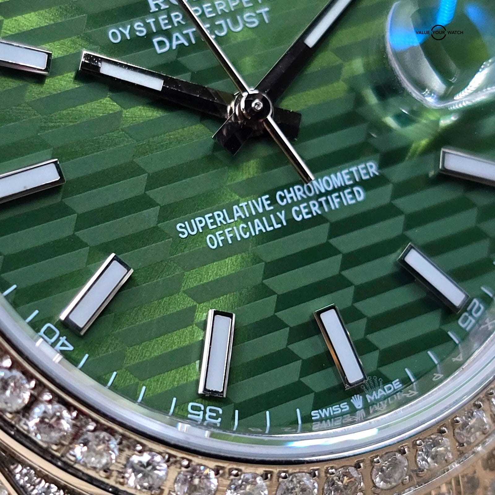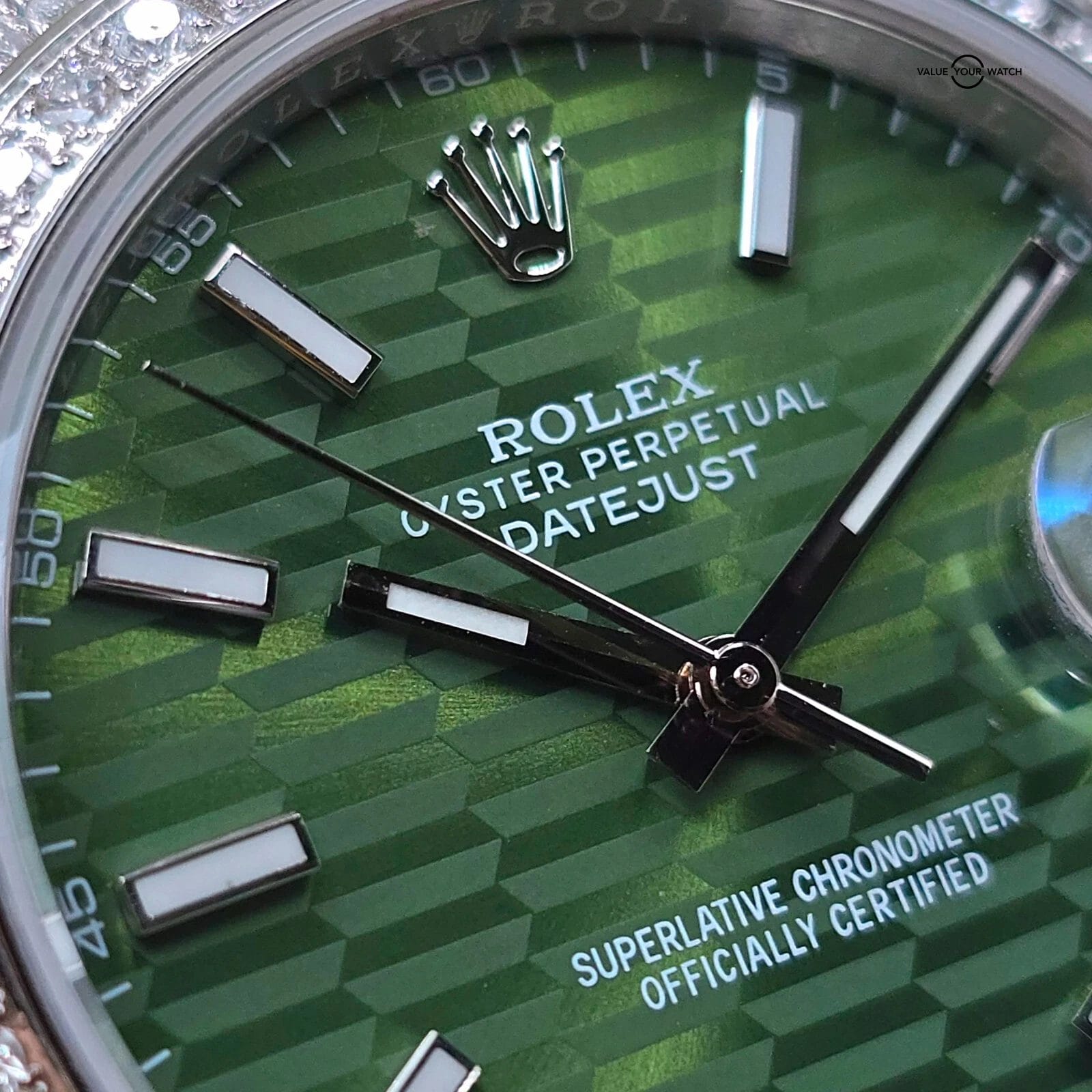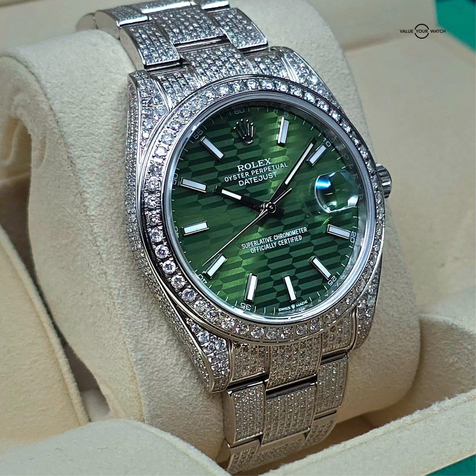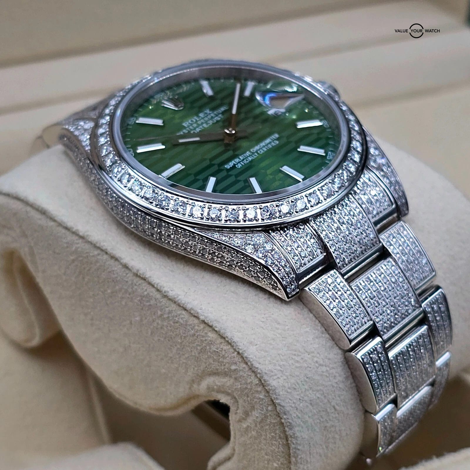 The green motif dial pattern looks especially fantastic against the diamond background.
