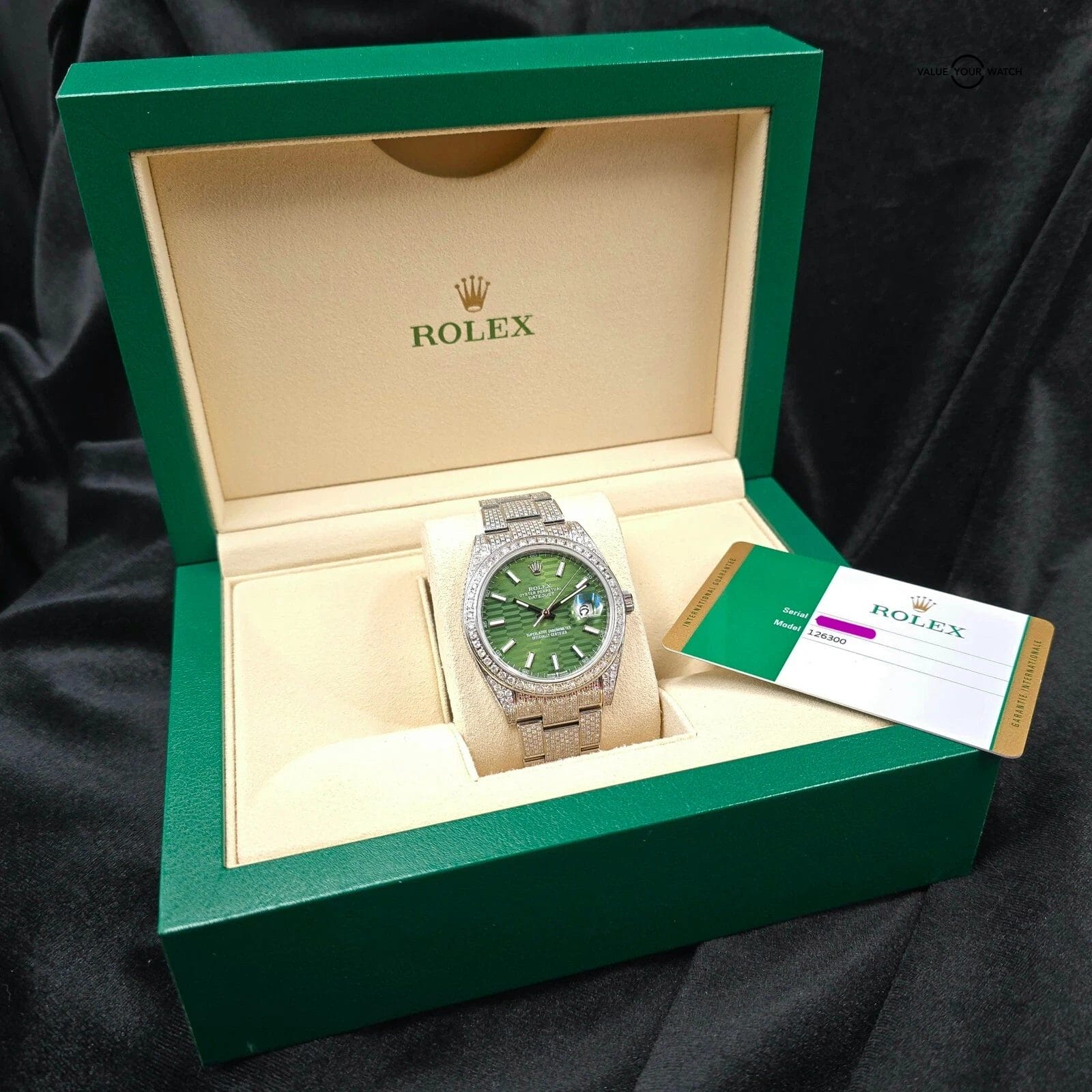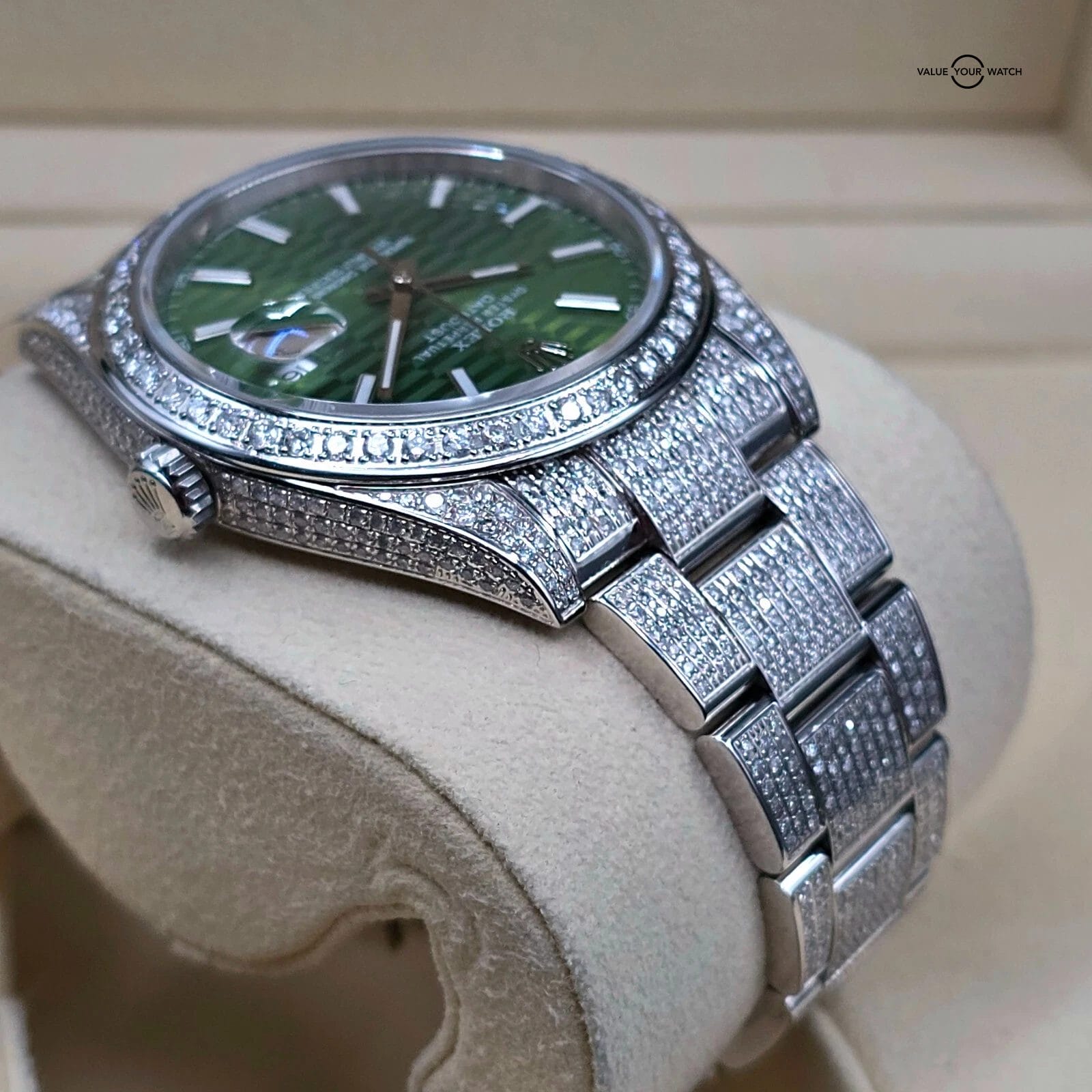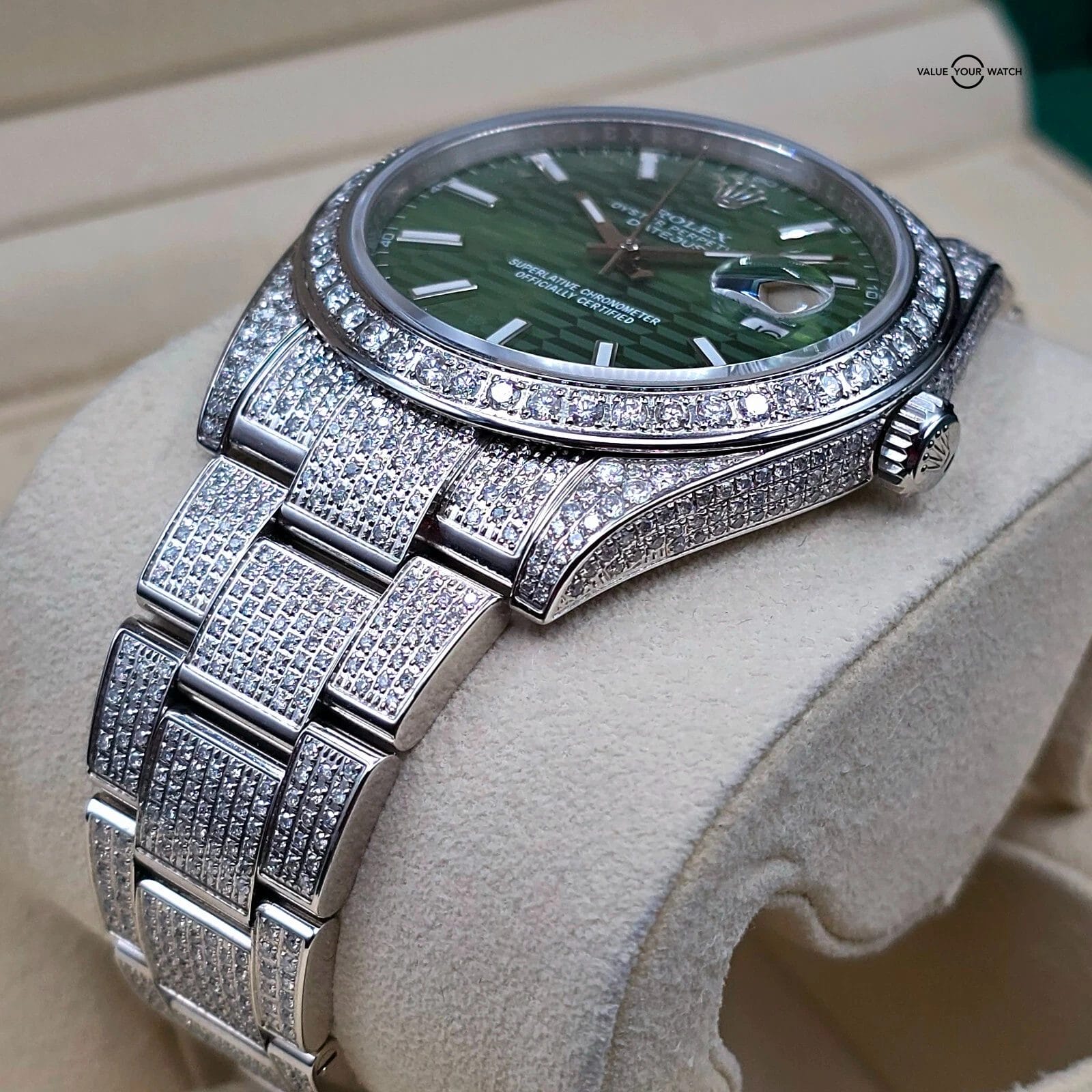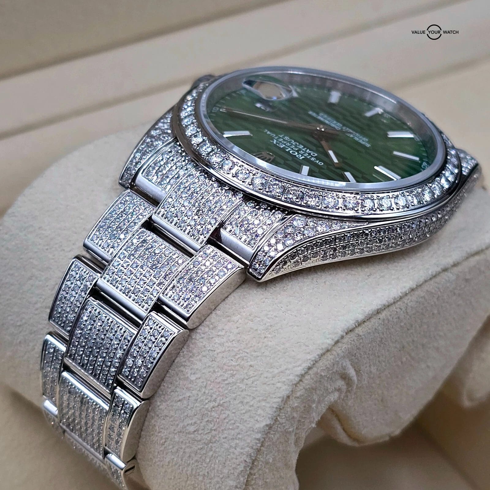 The green motif dial pattern looks especially fantastic against the diamond background.