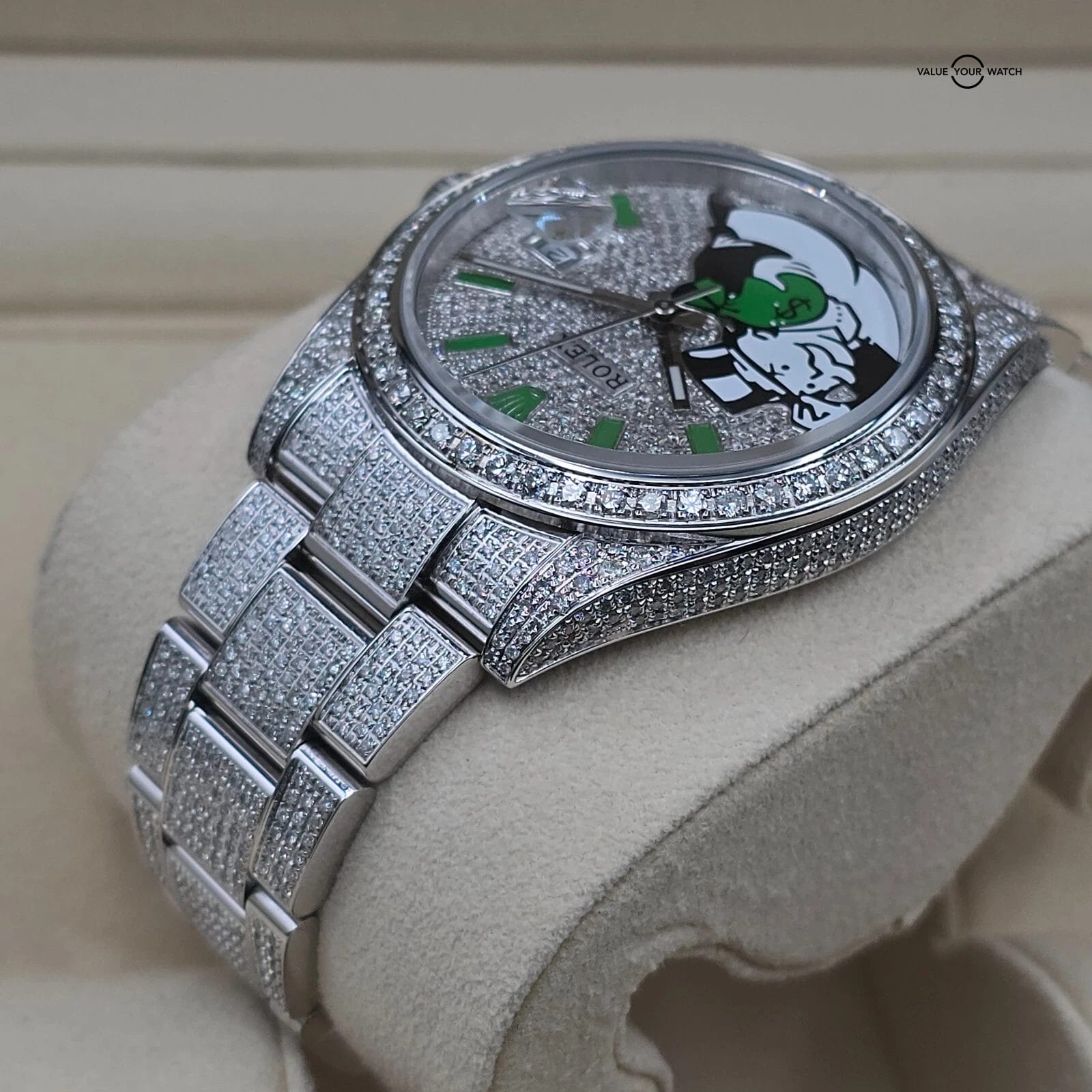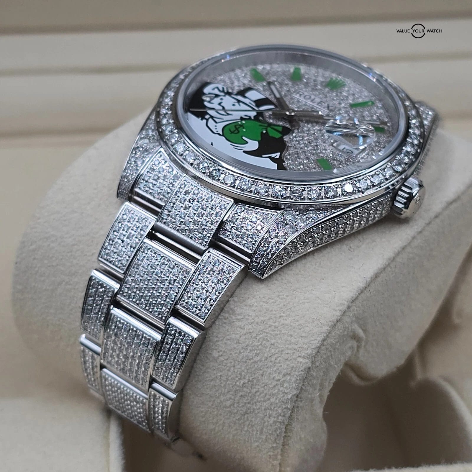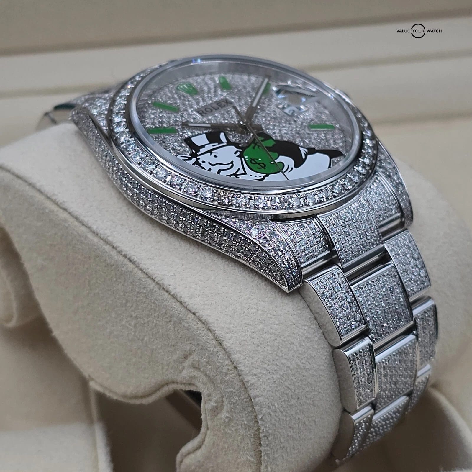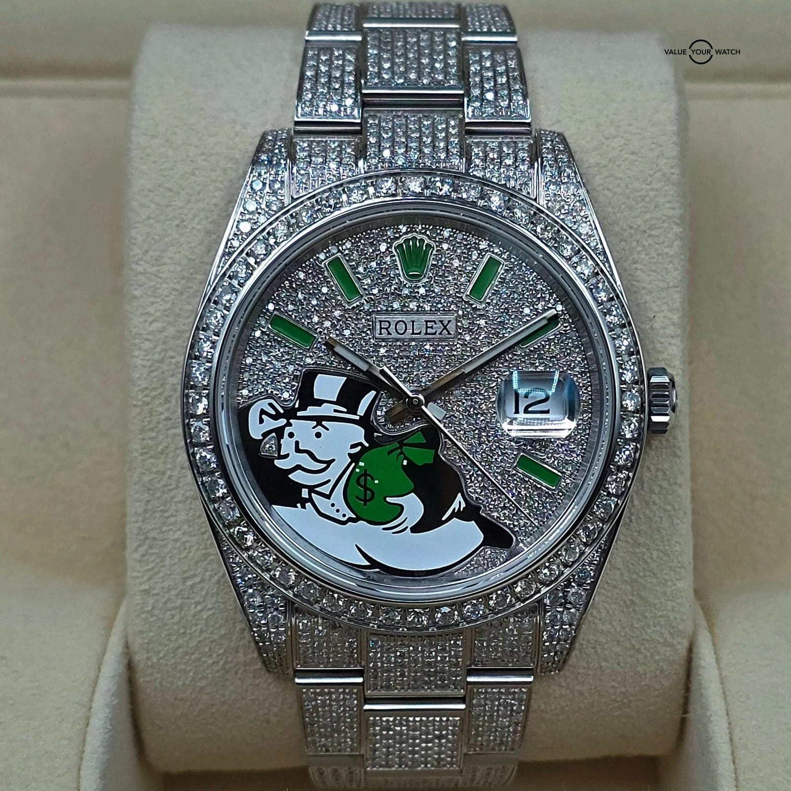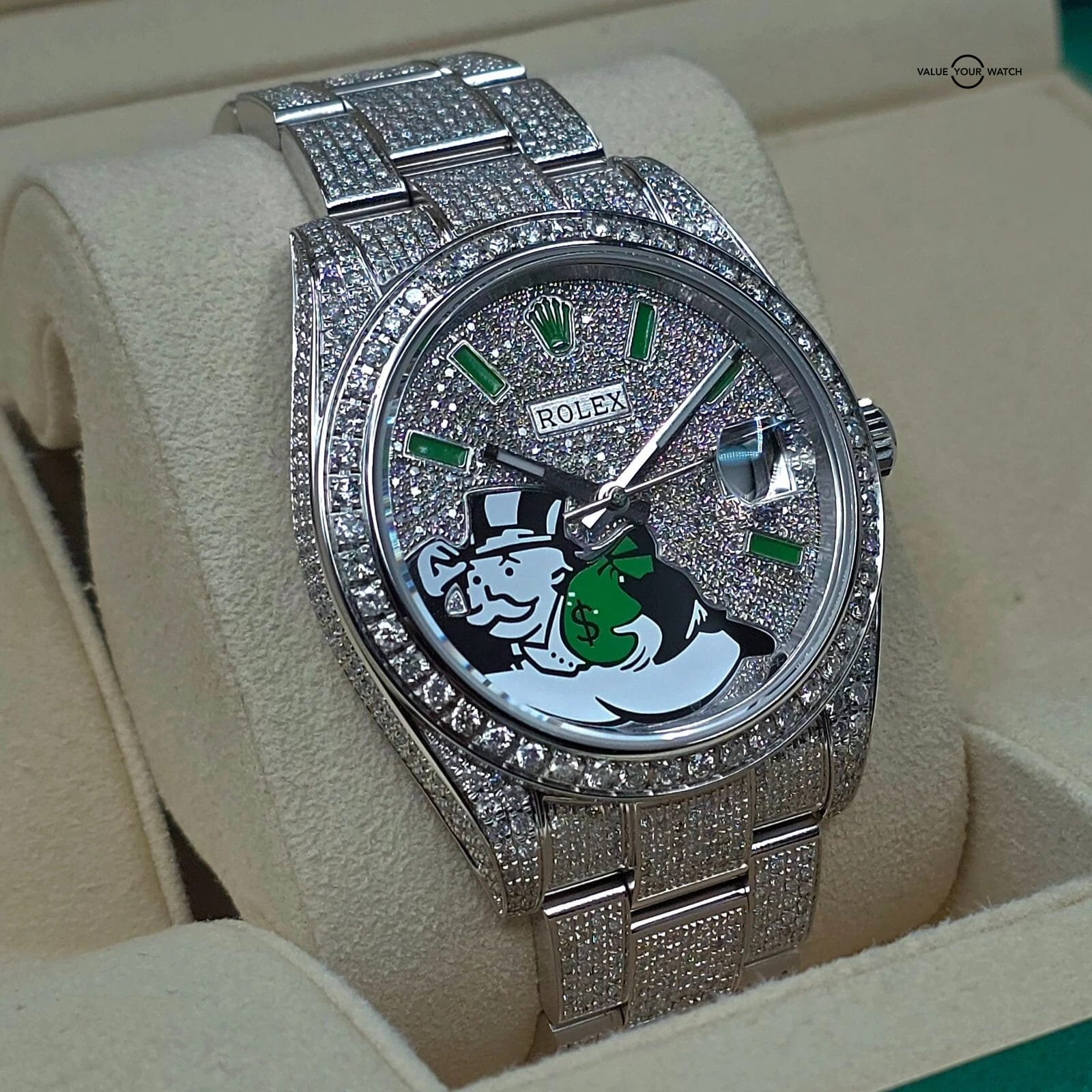 Up for sale here is a very cool custom Rolex Datejust, set with diamonds all around the entire watch case, bezel, bracelet, and dial! The best size at 41mm.