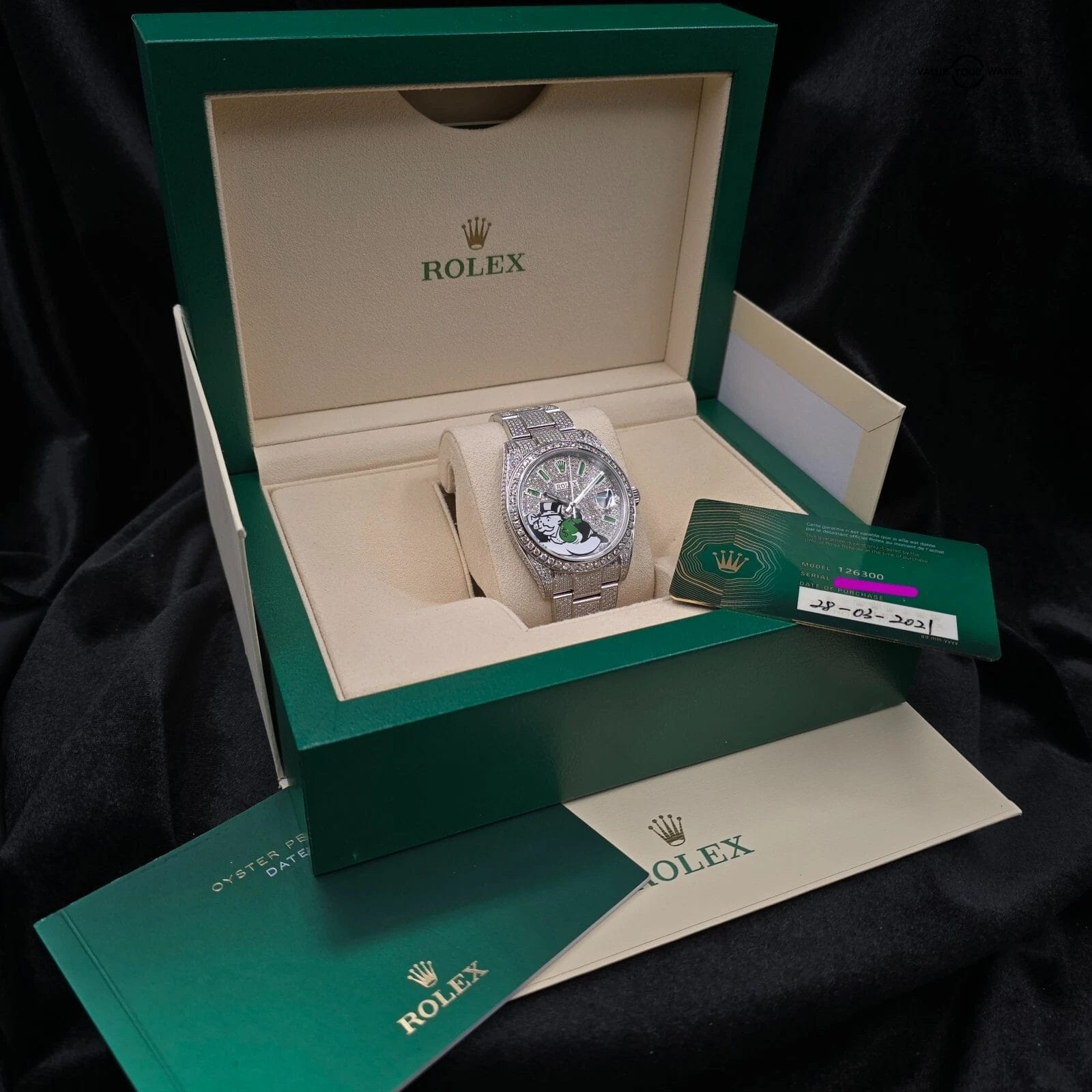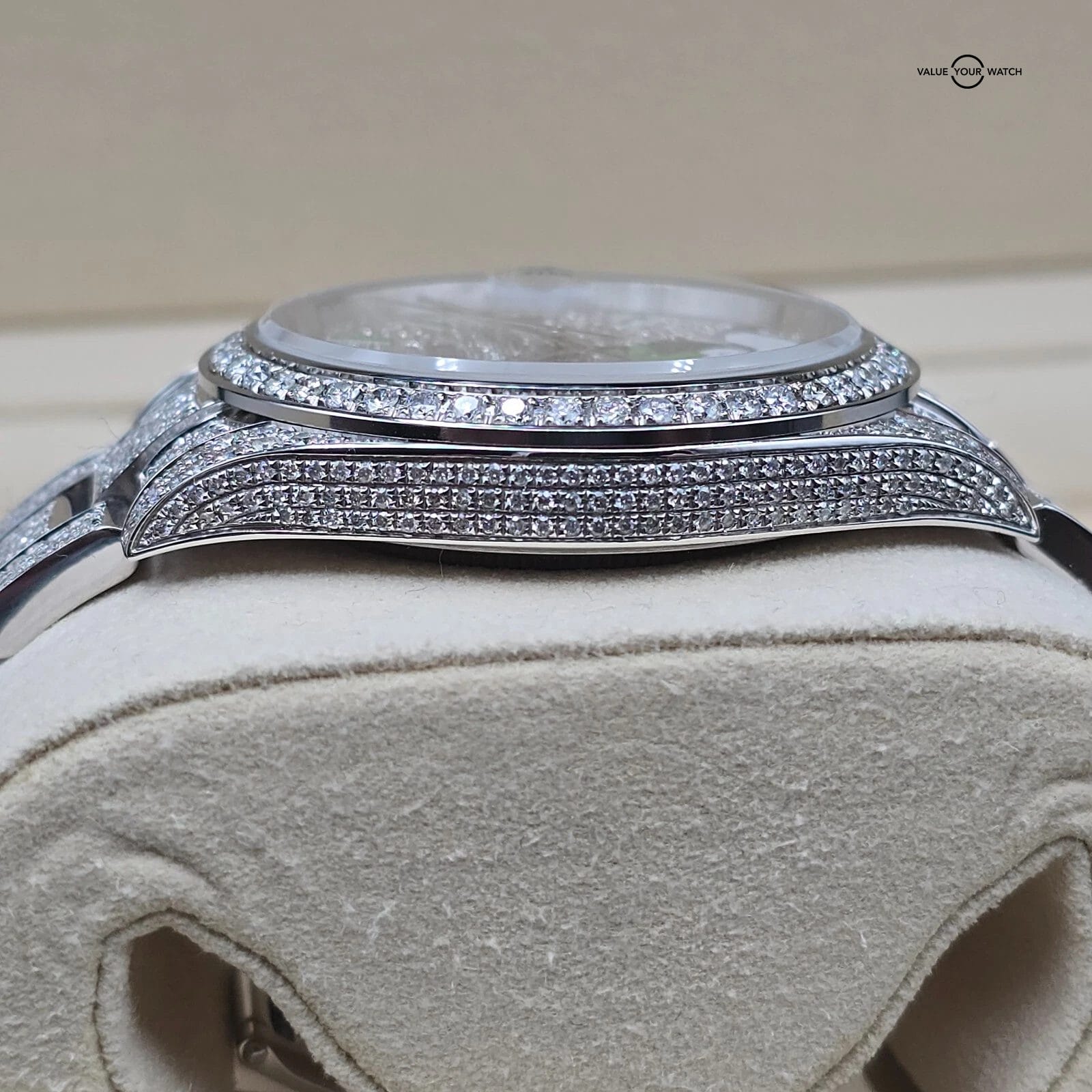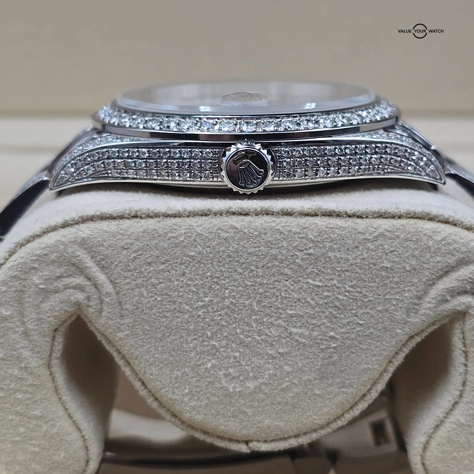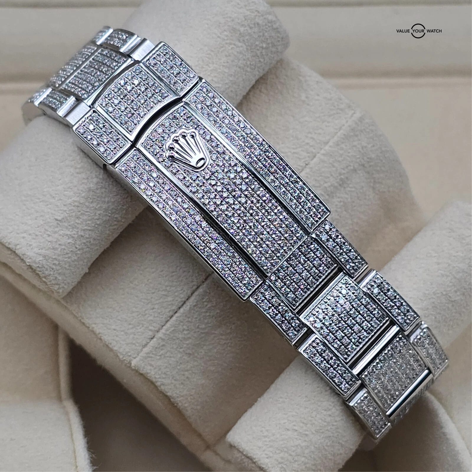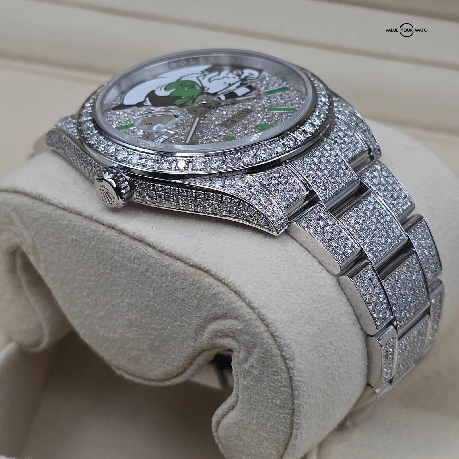 Up for sale here is a very cool custom Rolex Datejust, set with diamonds all around the entire watch case, bezel, bracelet, and dial! The best size at 41mm.