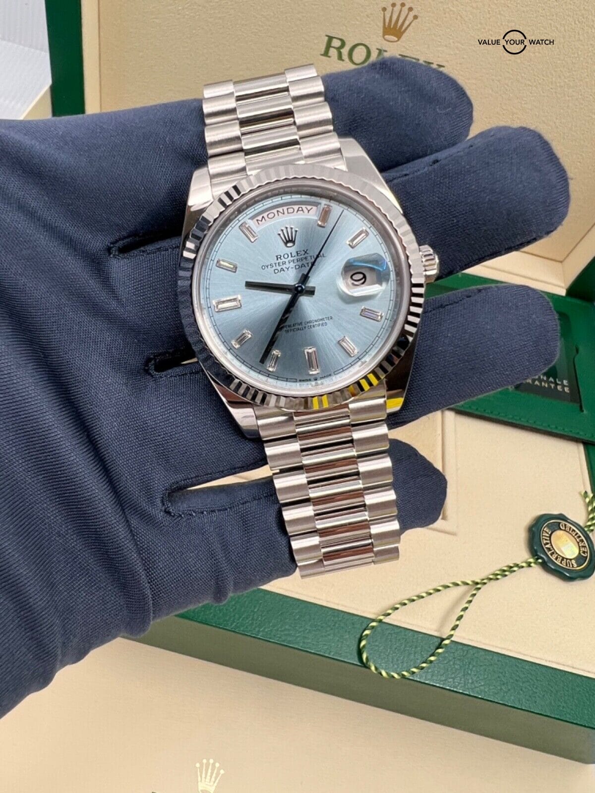 Guide to Buying and Selling 2023 Rolex Day-Date 40 228236 Platinum President Ice Blue Baguette Diamond Dial Online