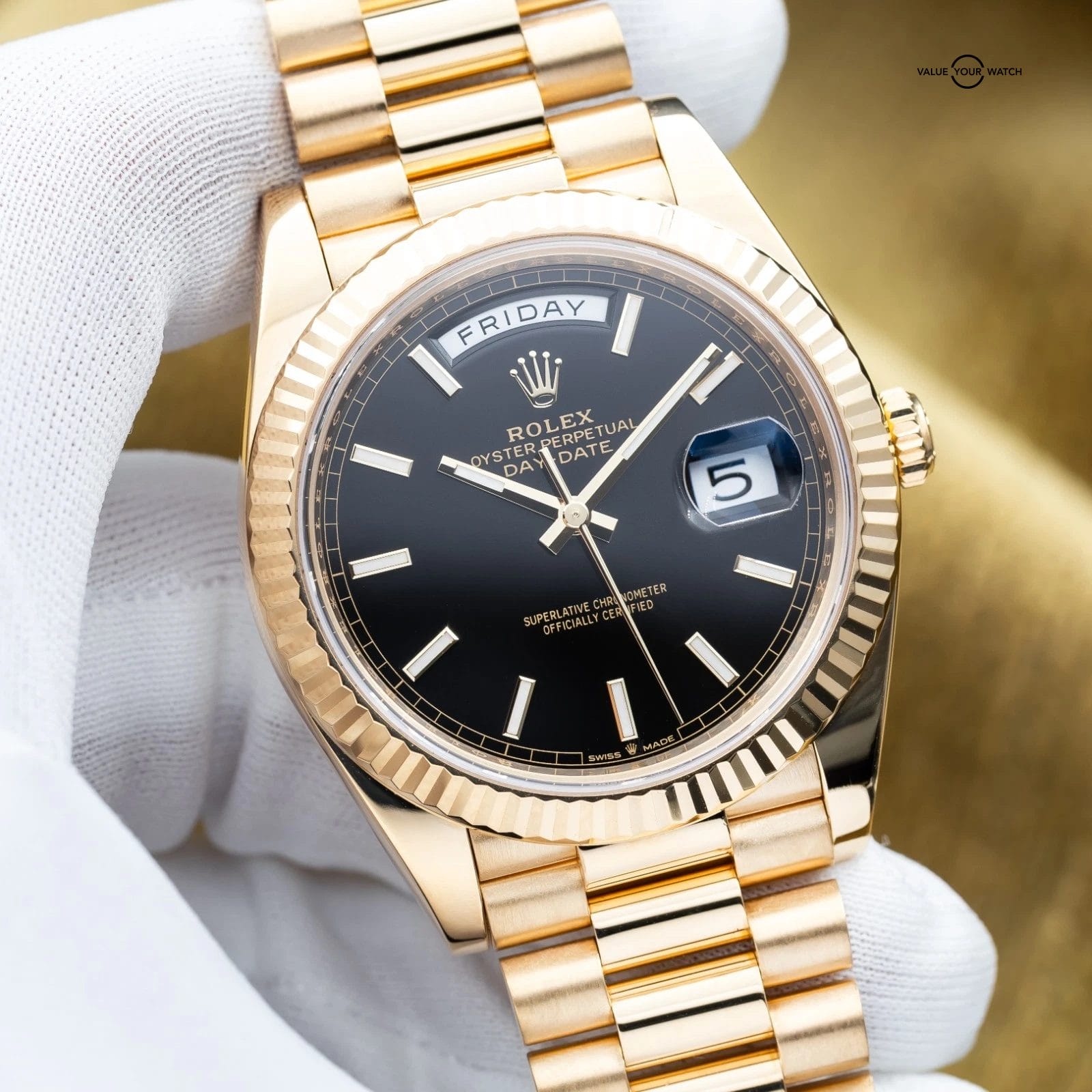 Specification: 2025 Rolex Day-Date 40 18kt Yellow Gold Black Dial President 228238 – Full Set