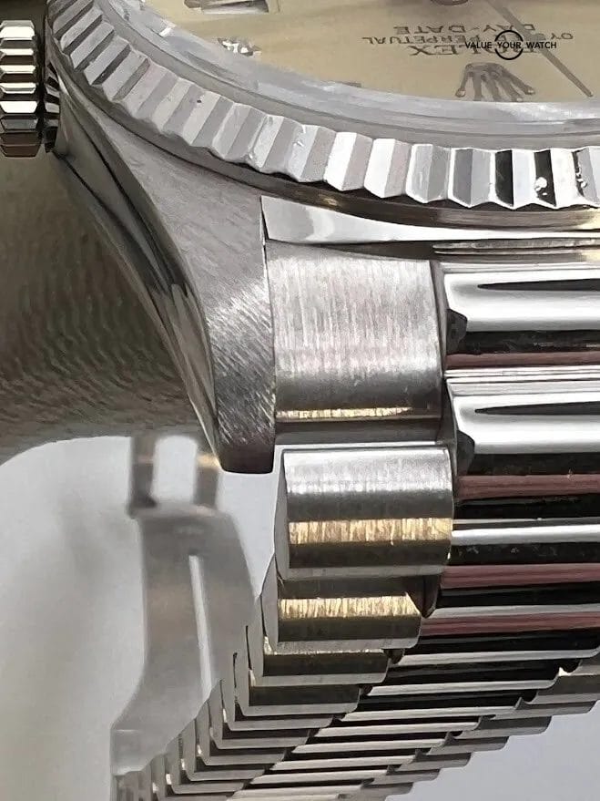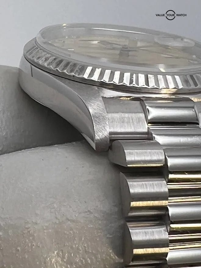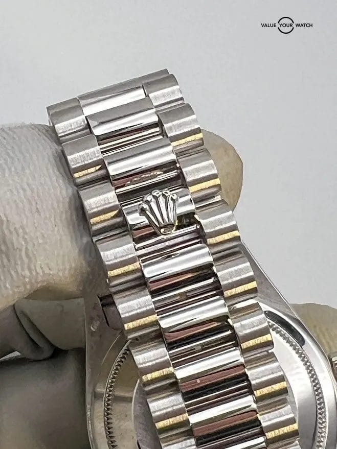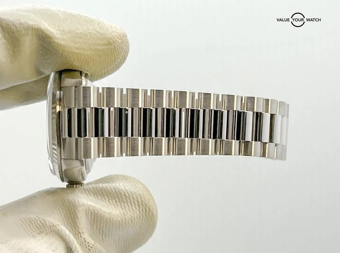 The original “presidential” bracelet will fit a wrist up to an approximately 7.25″ wrist size. More correct oem Rolex links can be sourced and purchased if needed.