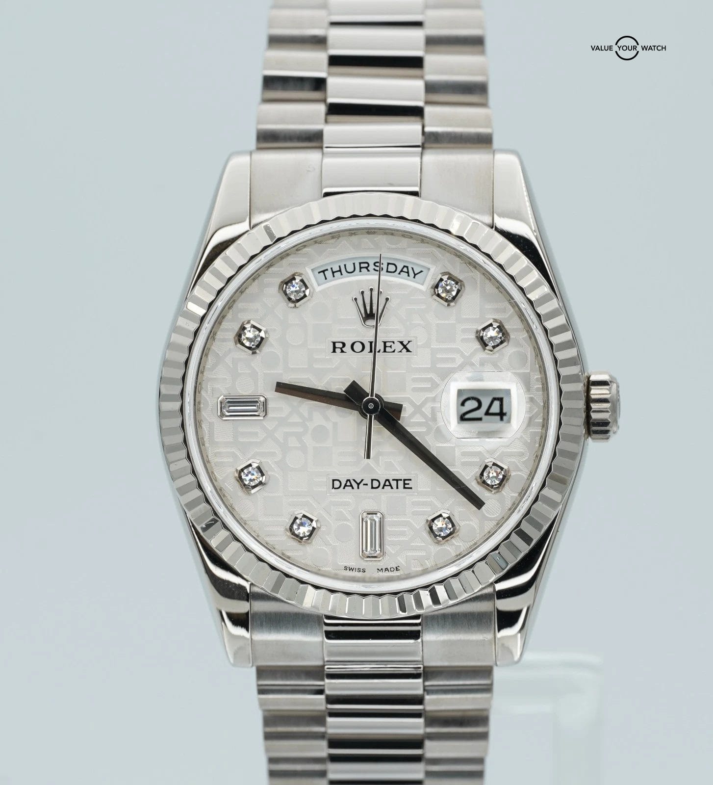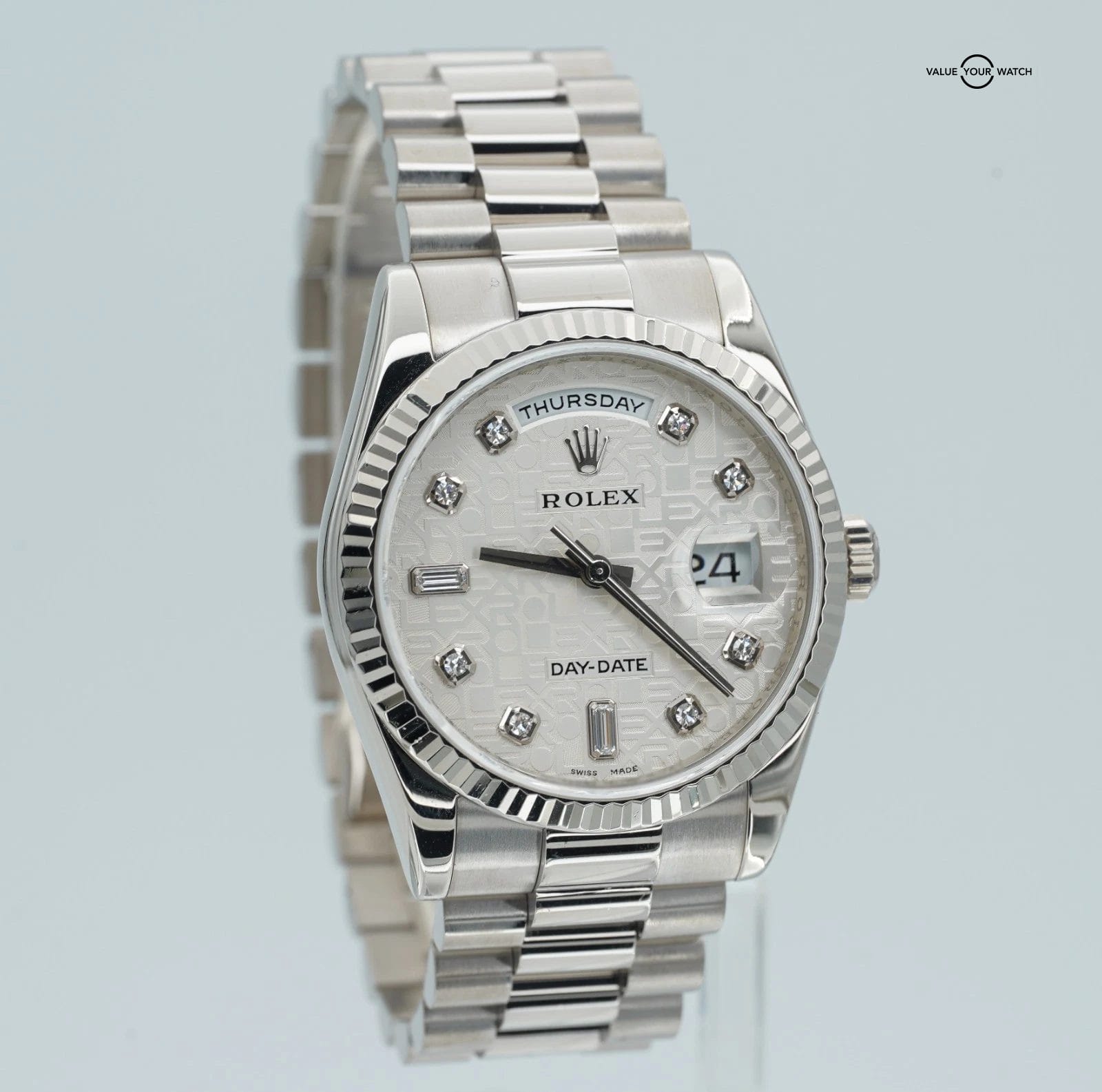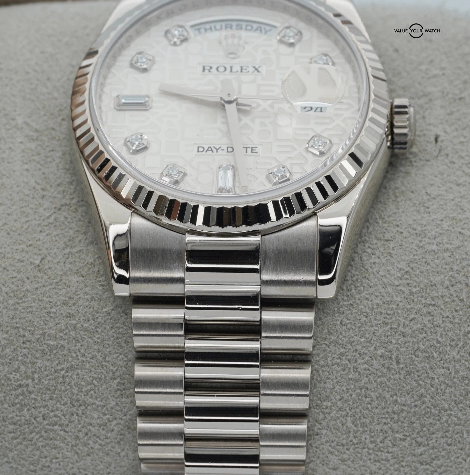Specification: Rolex Day-Date 118239 Diamond Dial 36mm 18K White Gold Fat Buckle BOX/PAPERS!