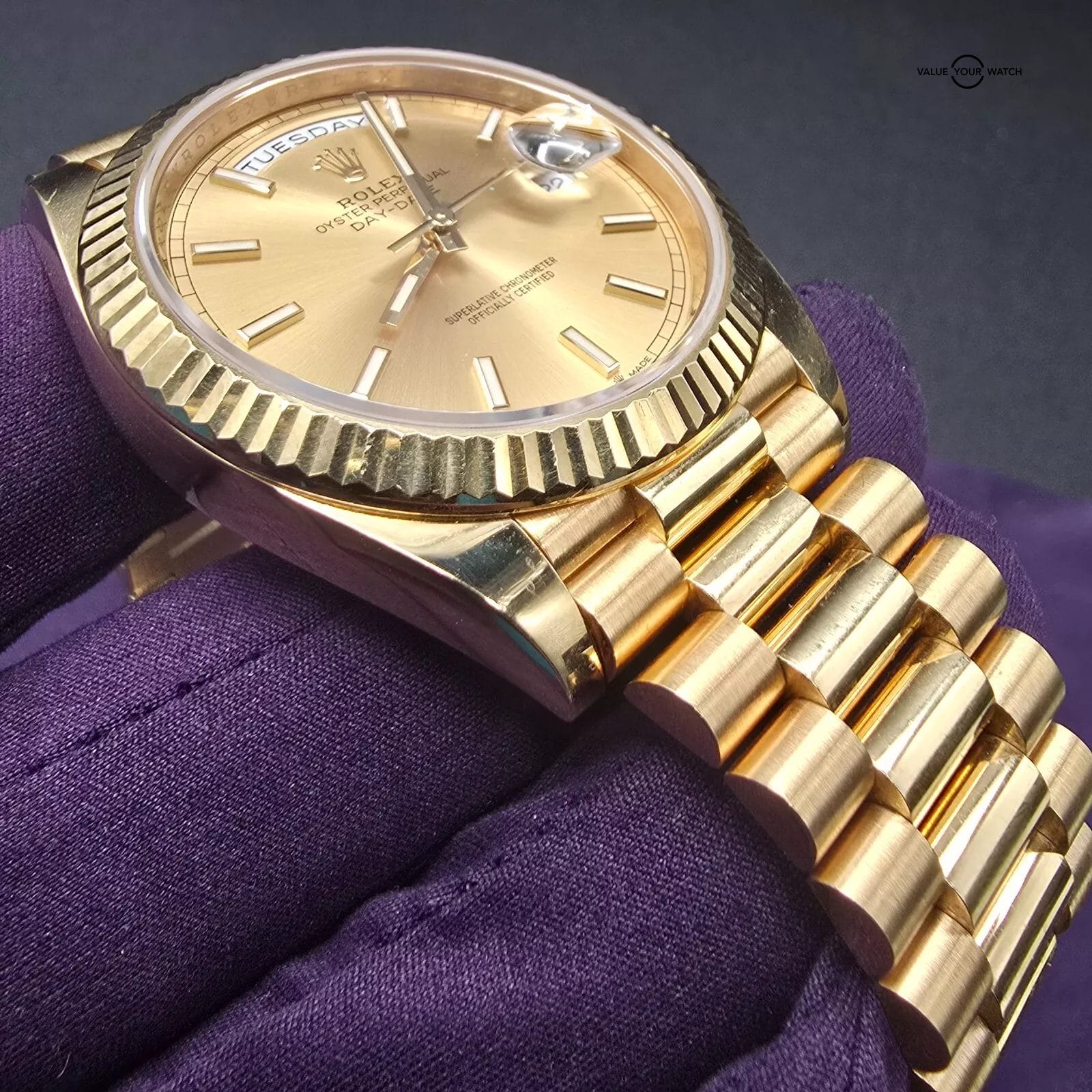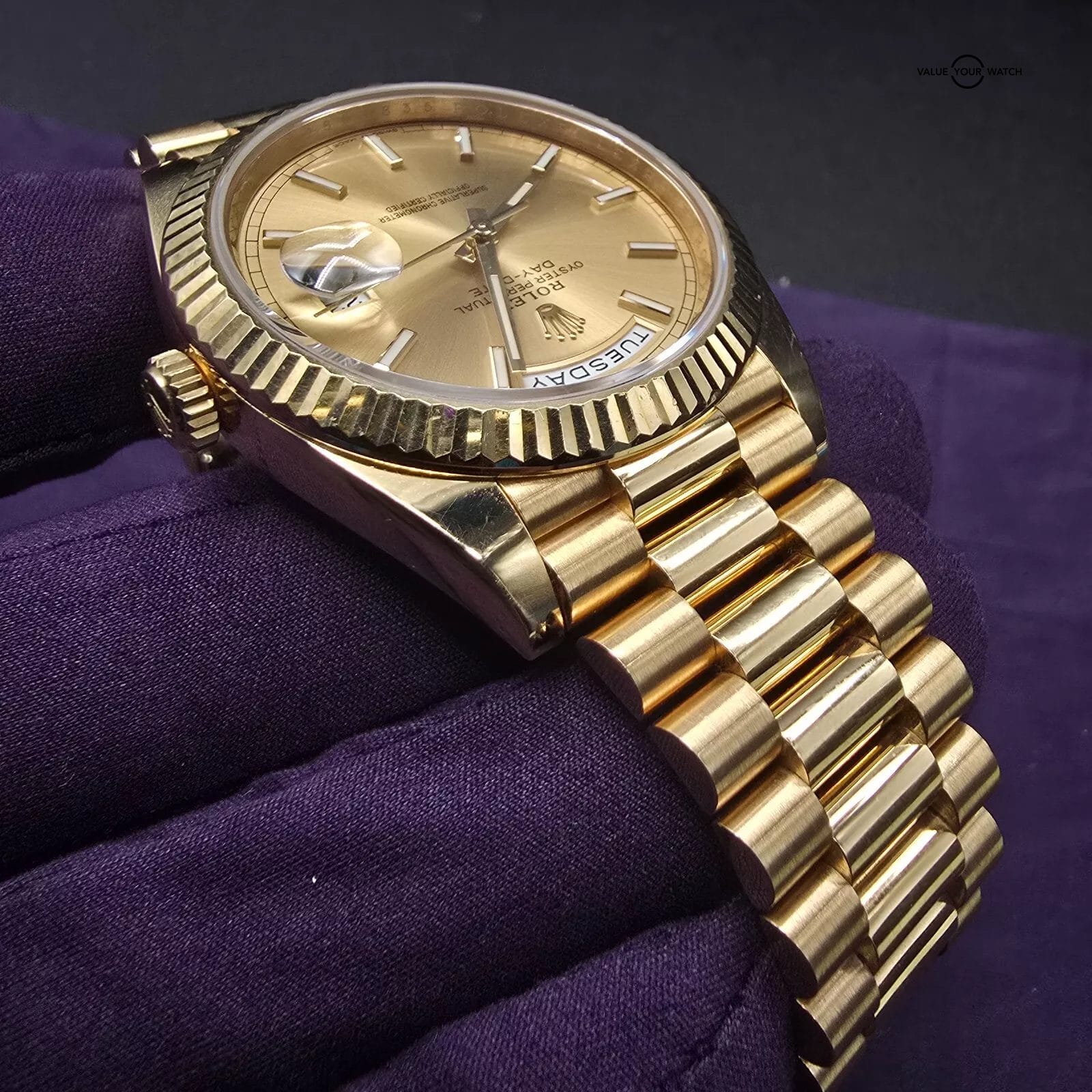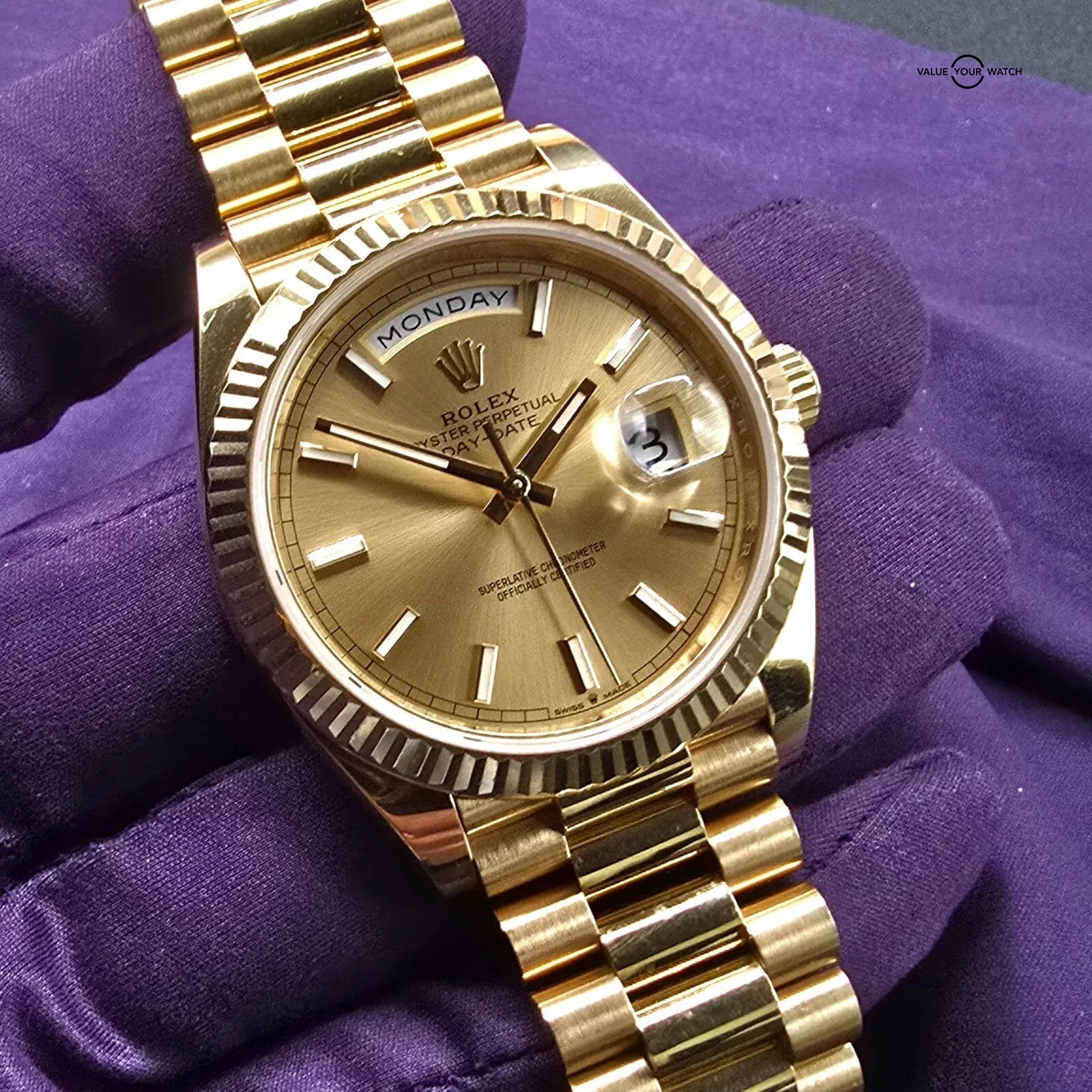 Specification: Rolex Day-Date 40mm Champagne dial, 18k Yellow gold 228238 watch only!