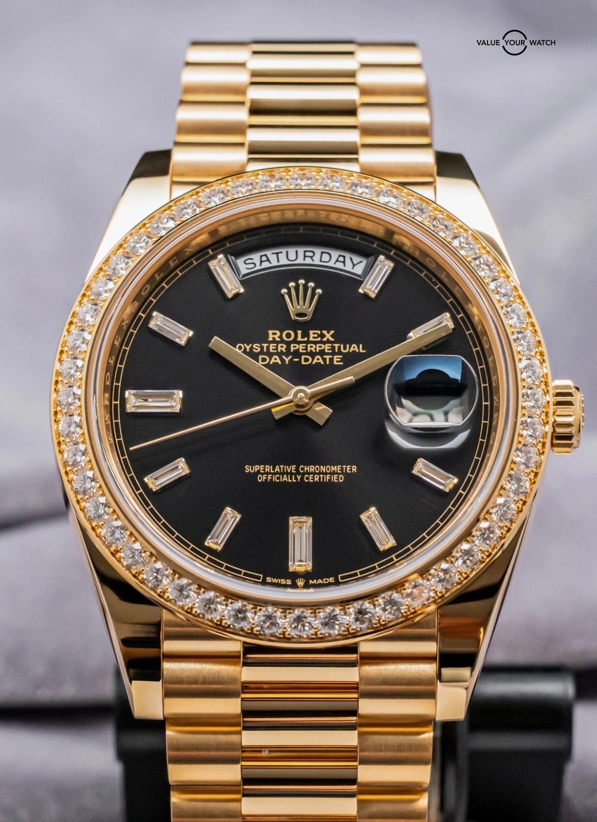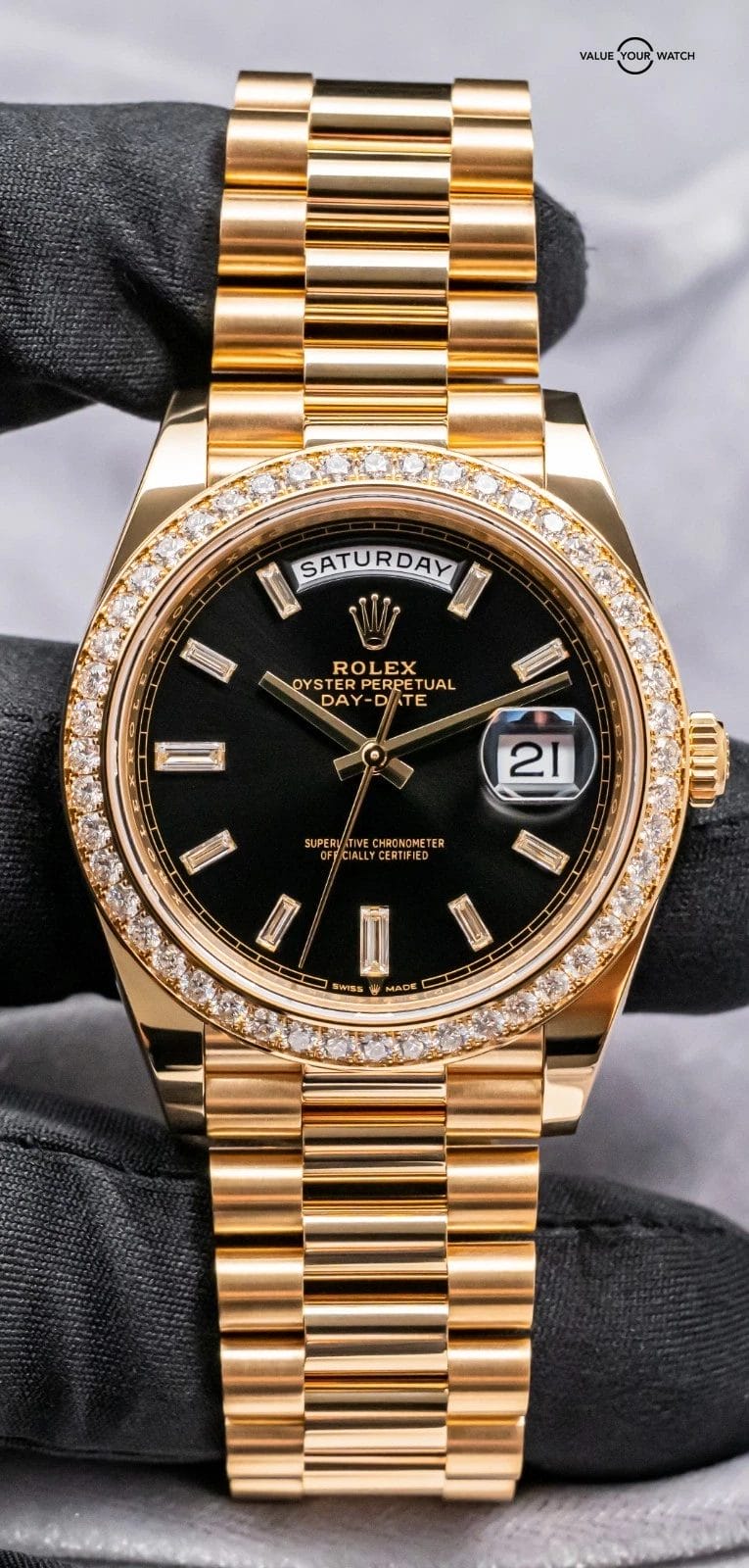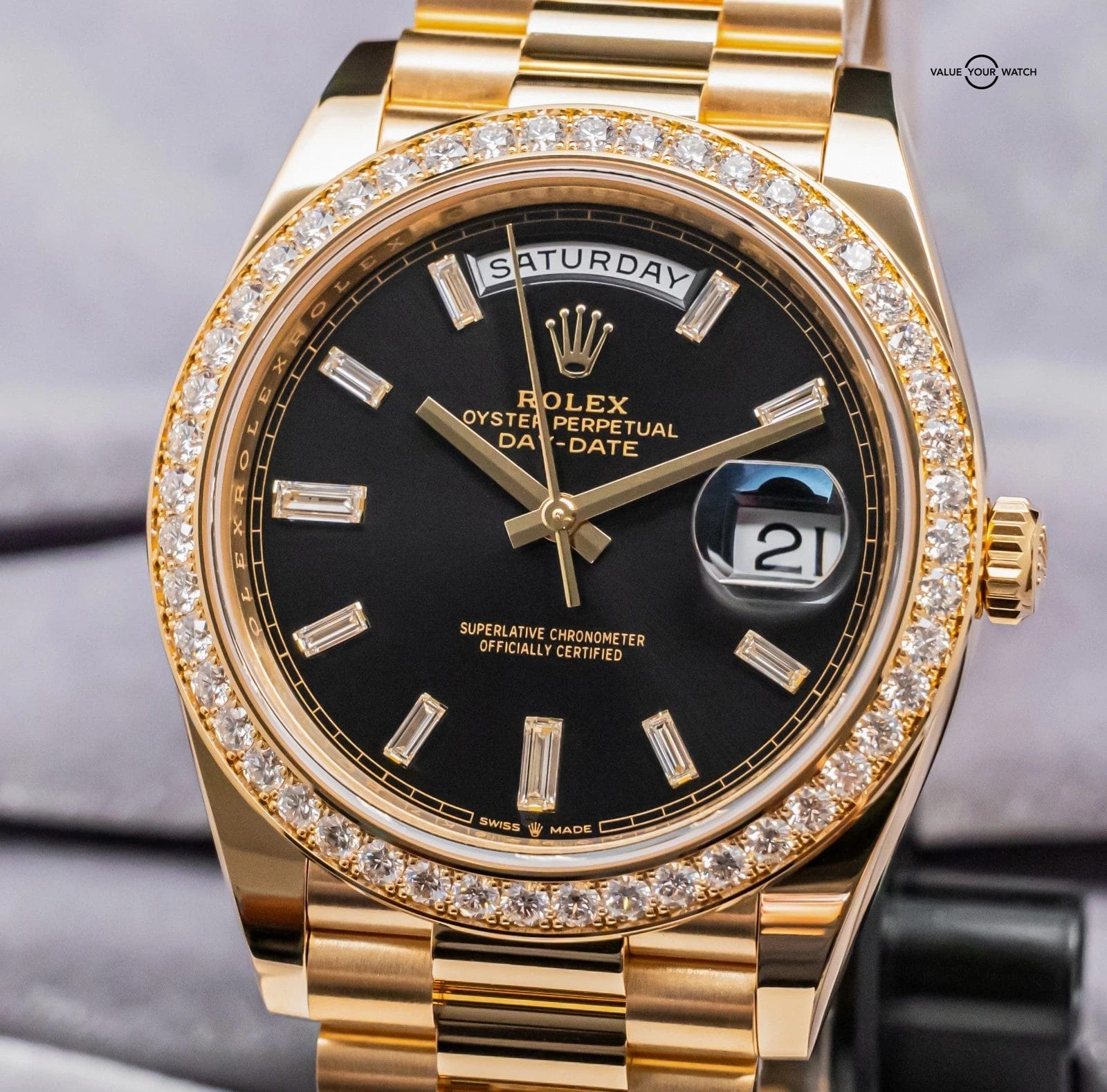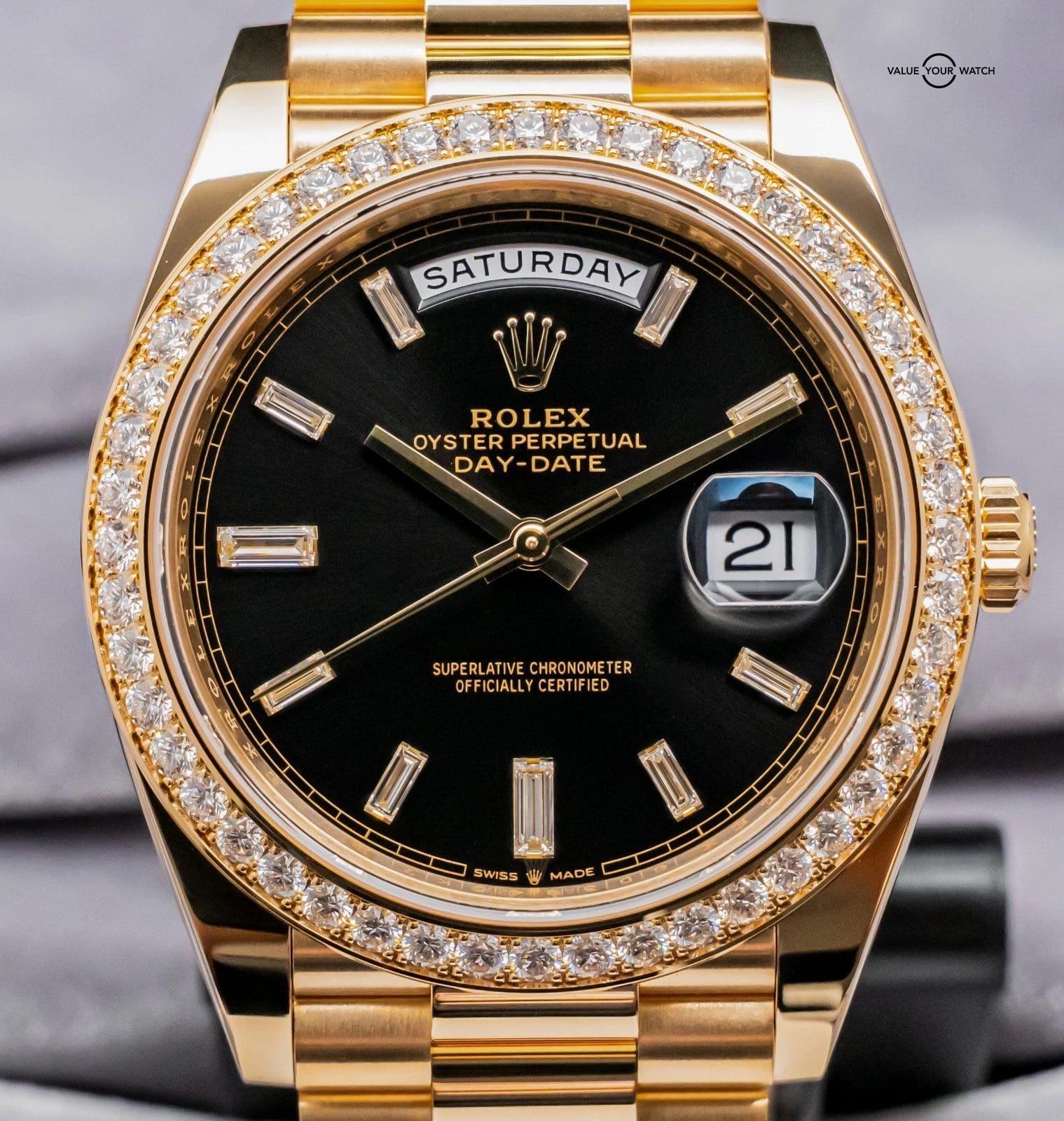 STUNNING Rolex Day-Date 40 mm in Solid 18K Yellow Gold with FACTORY-SET Diamond Bezel and FACTORY-SET Bright Black Baguette Diamond Dial on Solid 18K Yellow Gold President Bracelet! Arrives as a complete set with original Rolex boxes and papers as pictured including the manual, warranty booklet, and international guarantee card. This piece was purchased from a Rolex Authorized Dealer in January 2024. Have peace of mind, it is WARRANTIED through Rolex until January 2029, a huge value-add!