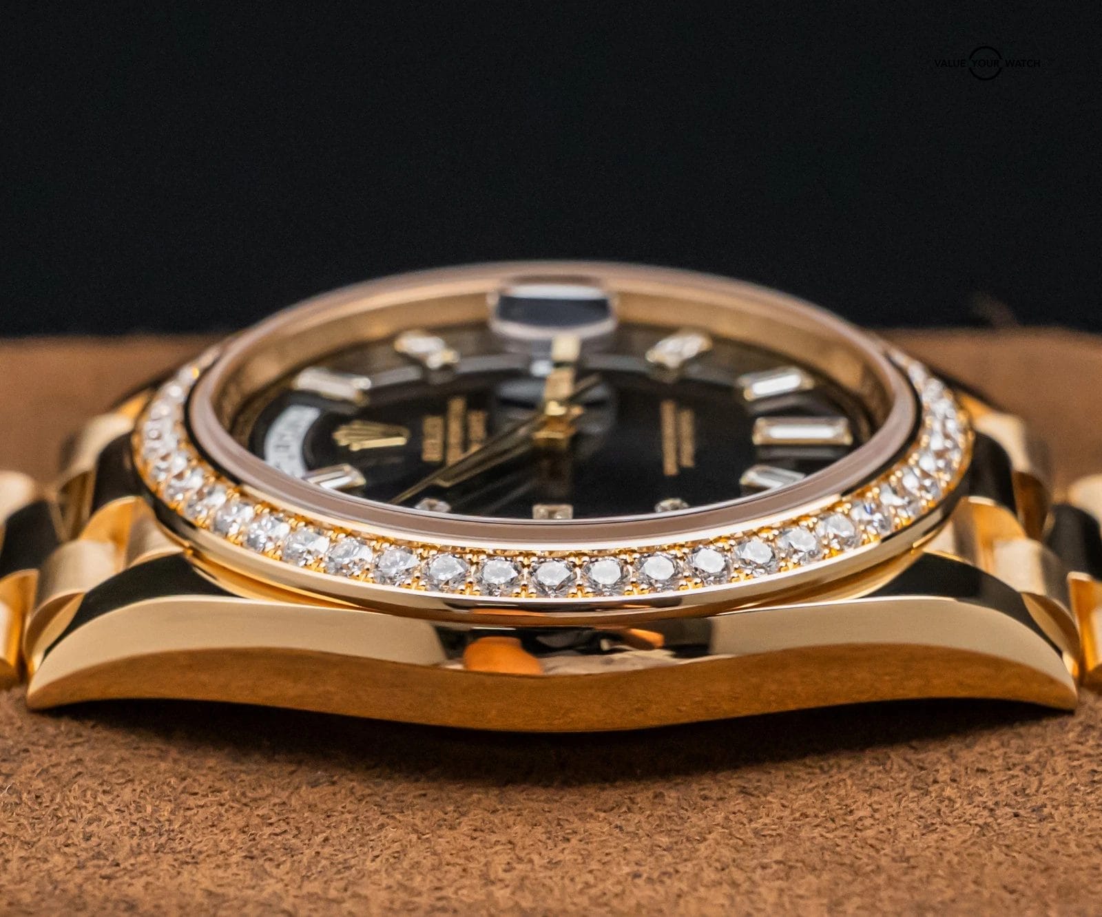 The watch is in PHENOMENAL condition with very minor wear, nothing notable. Keeping good time on my timegrapher when tested! Do excuse dust/lint in the photos from the photography process. This is an incredibly desirable and hard to find combination, the FACTORY Bezel & FACTORY Baguette Diamond Dial; it is the first we’ve ever received on trade in nine years. Ready to be on wrist!