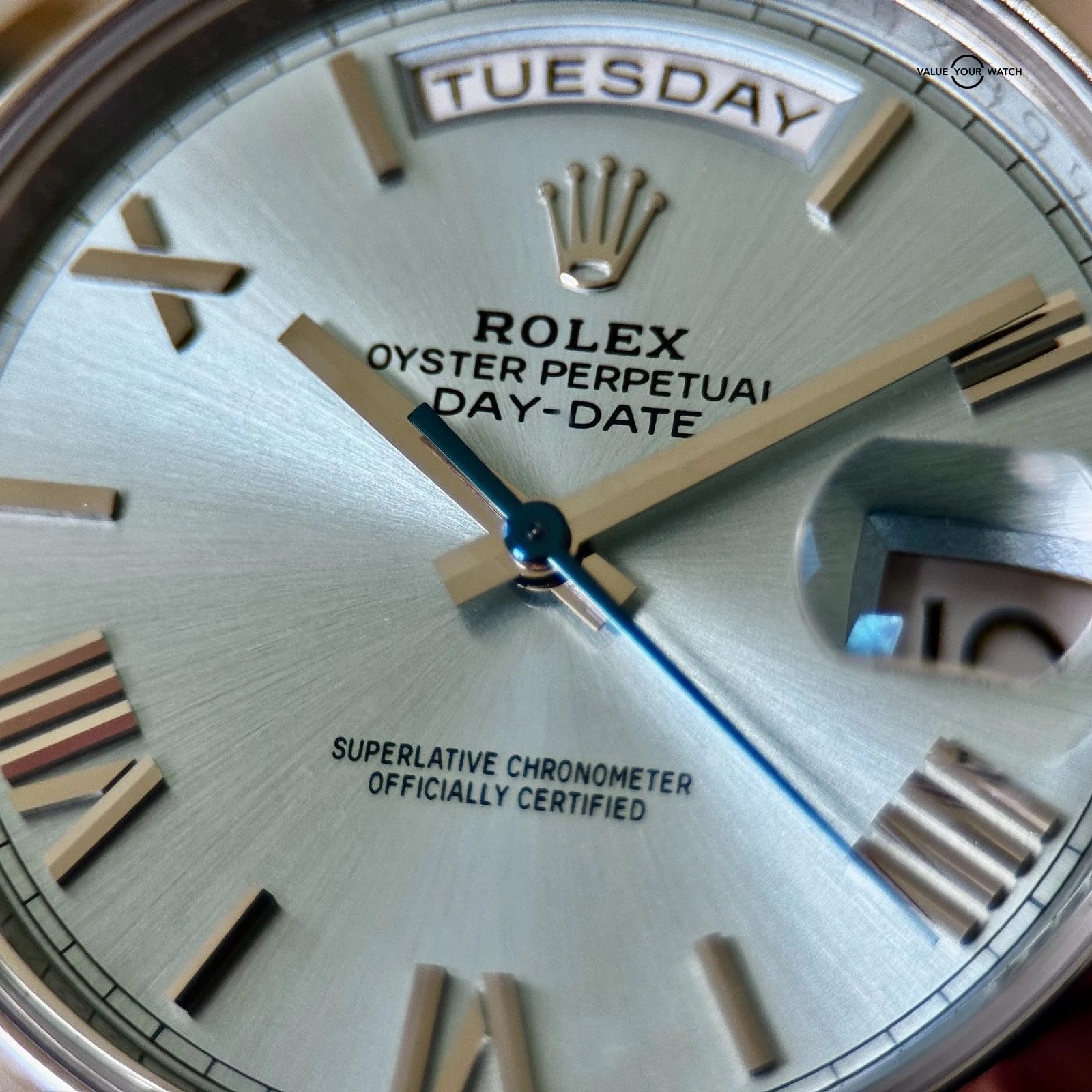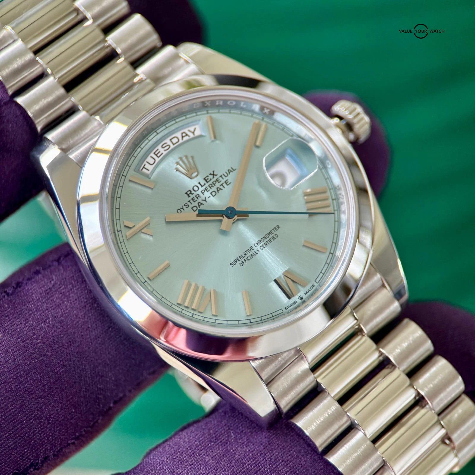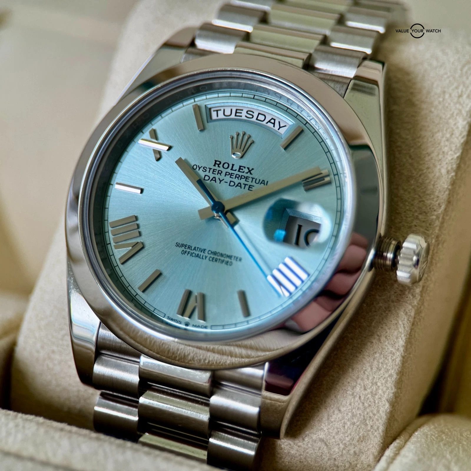 Ultimate Presidential Elegance: Rolex Day-Date 40 Ref. 228206 in 950 Platinum with Roman Numerals on Ice Blue Sunray Dial