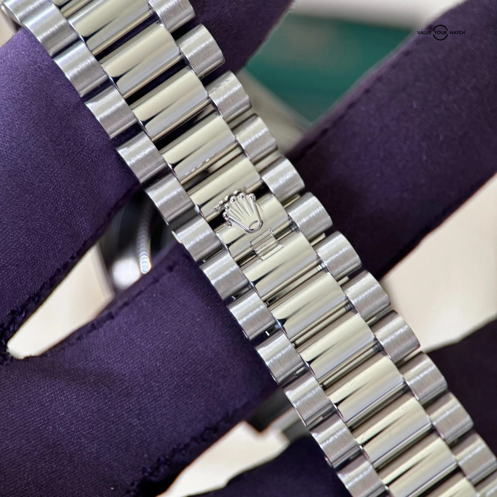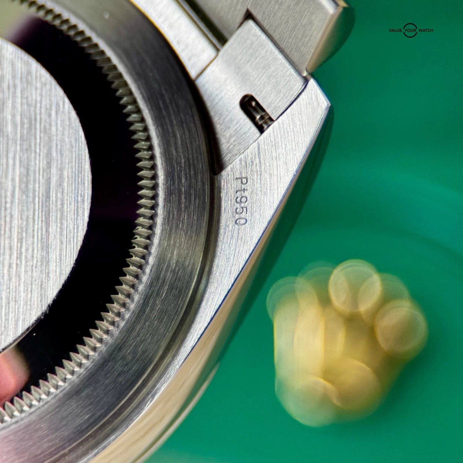 Crafted from solid 950 platinum – Rolex’s most prestigious and rare precious metal – this discontinued reference 228206 exudes understated luxury with its signature smooth bezel and the legendary President bracelet that drapes impeccably for supreme comfort and presence.