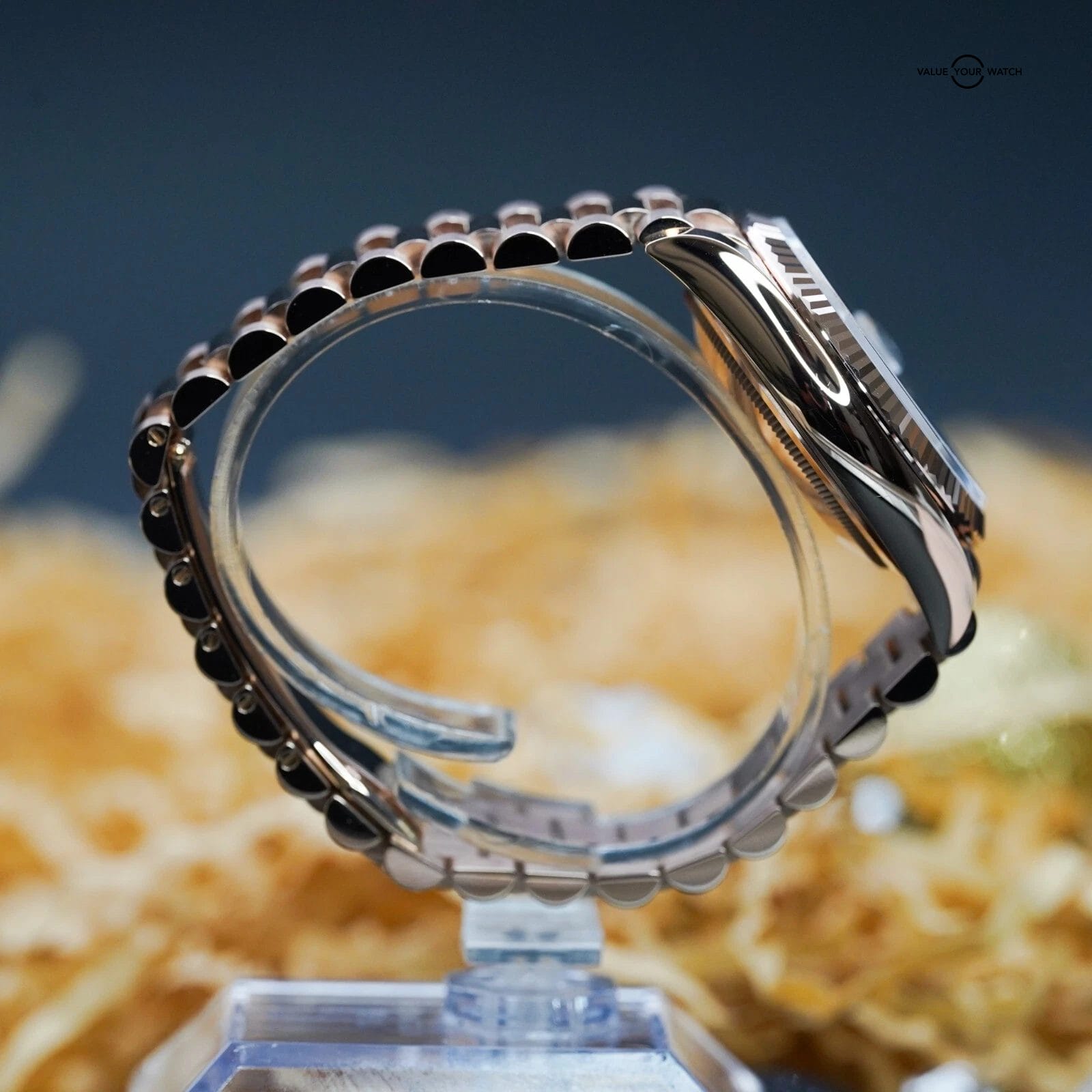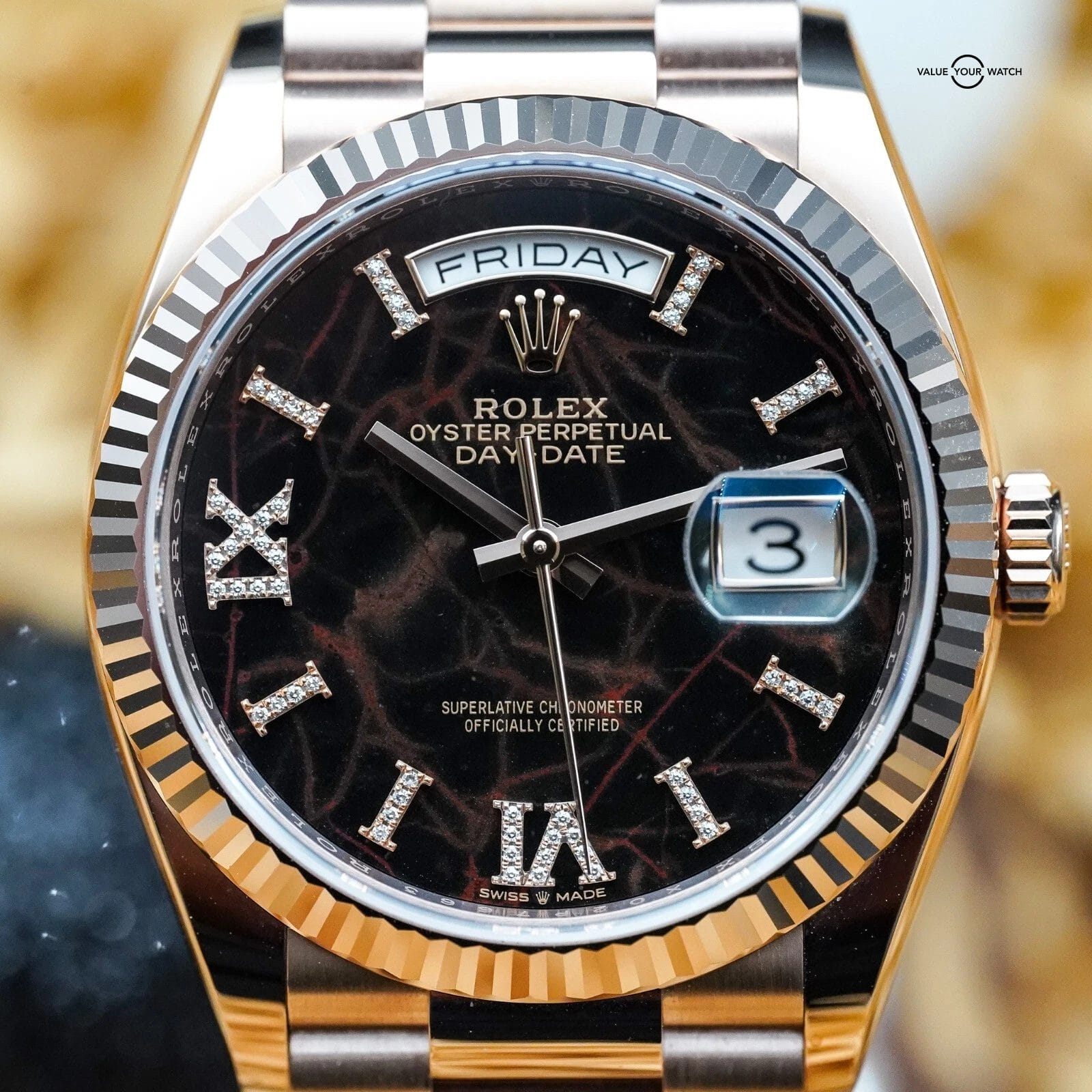 Unique stone cut, diamond roman numeral hour markers, and presidential bracelet