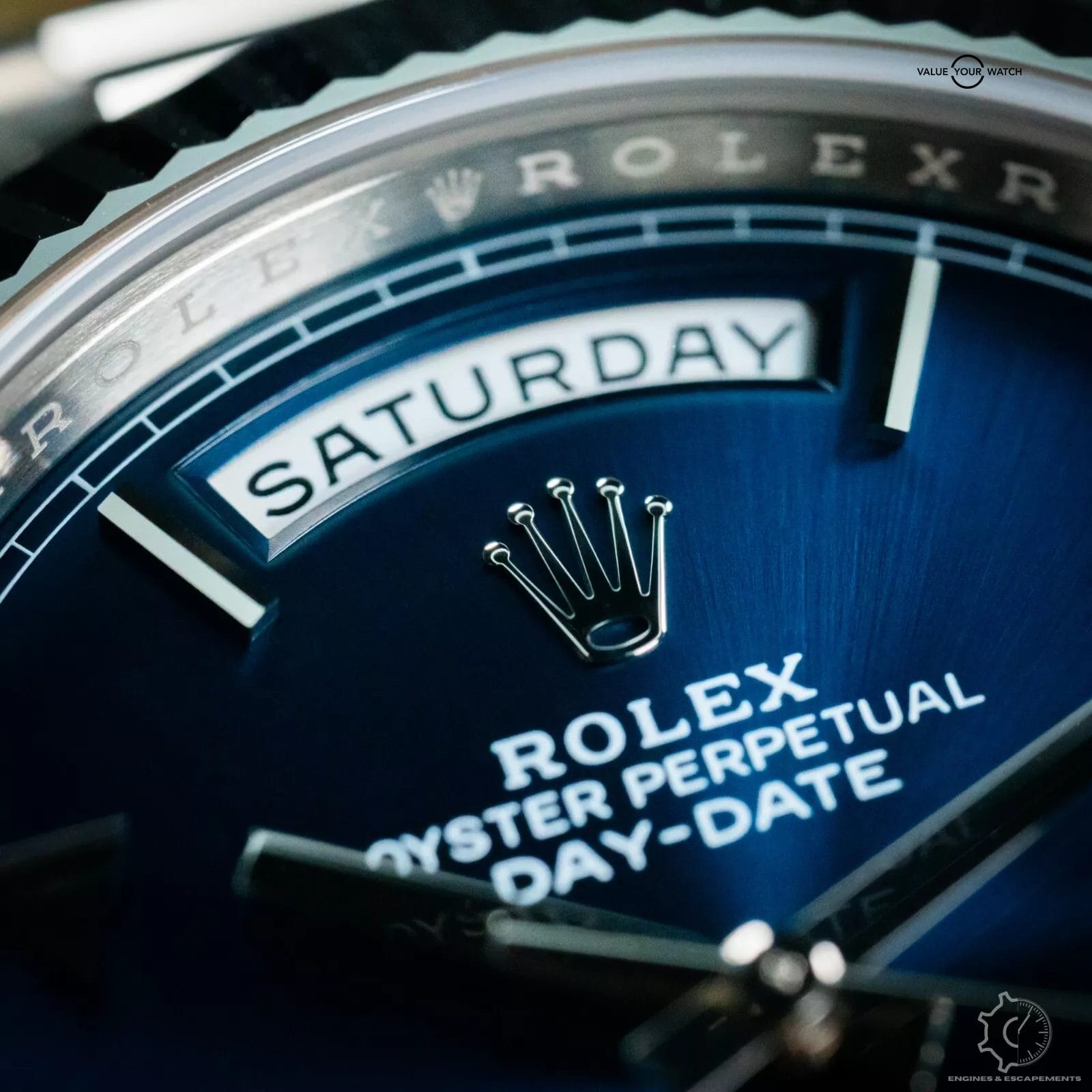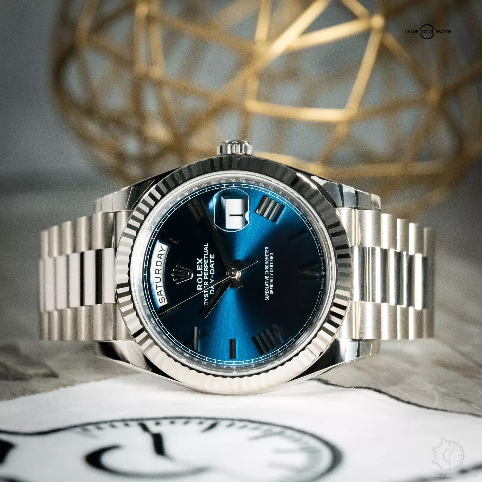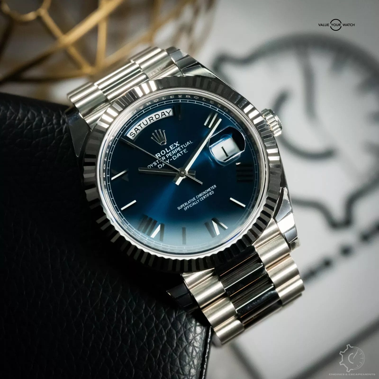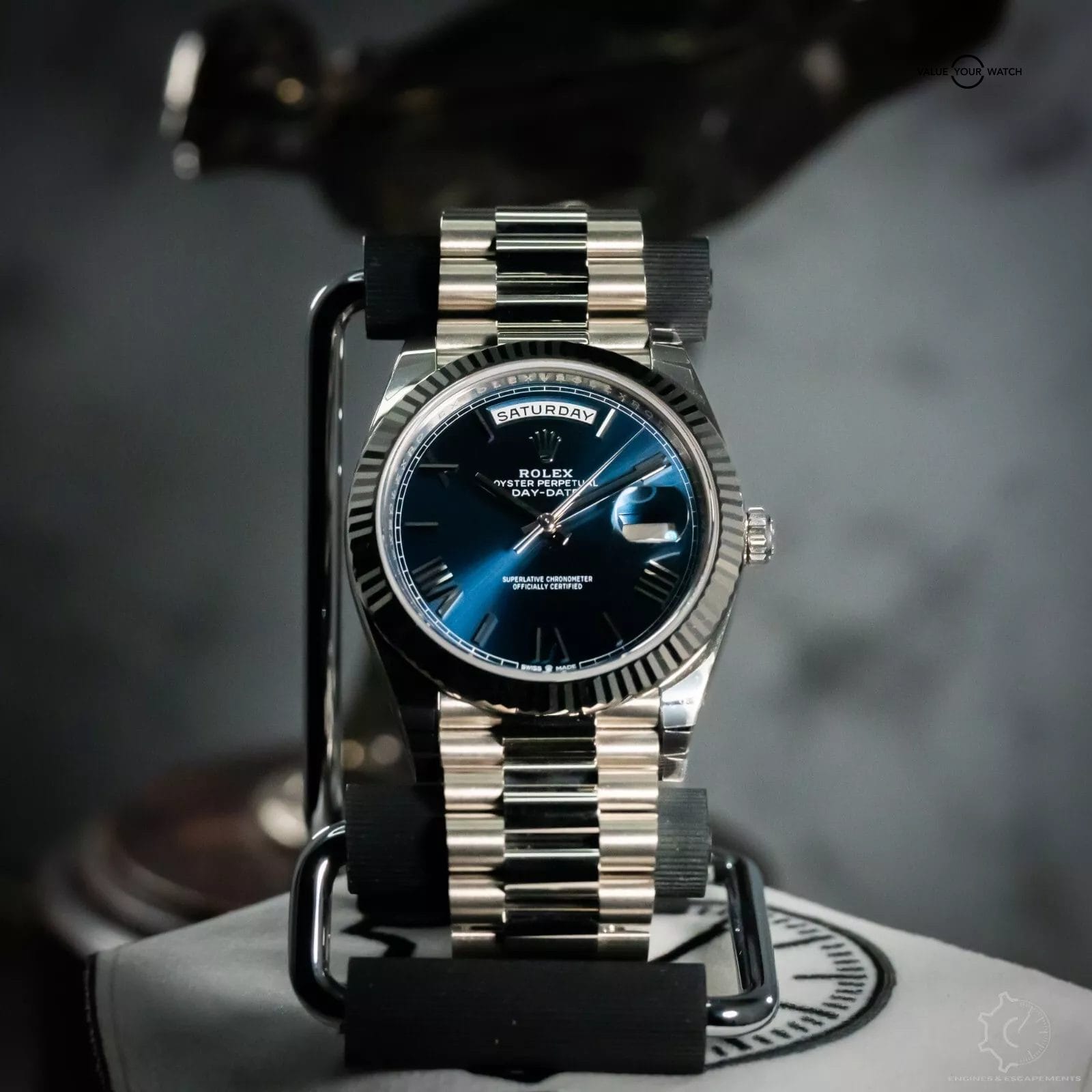 Stunning Rolex Day-Date 228239 with striking blue sunburst dial with white gold Roman numerals. This timepiece is one of the classiest models in the Rolex lineup. This beautiful timepiece features a fluted bezel & the presidential bracelet that just works best in full hefty white gold that gives this timepiece an exceptional wrist presence. I especially like how the blue dial shimmers in the sunlight.