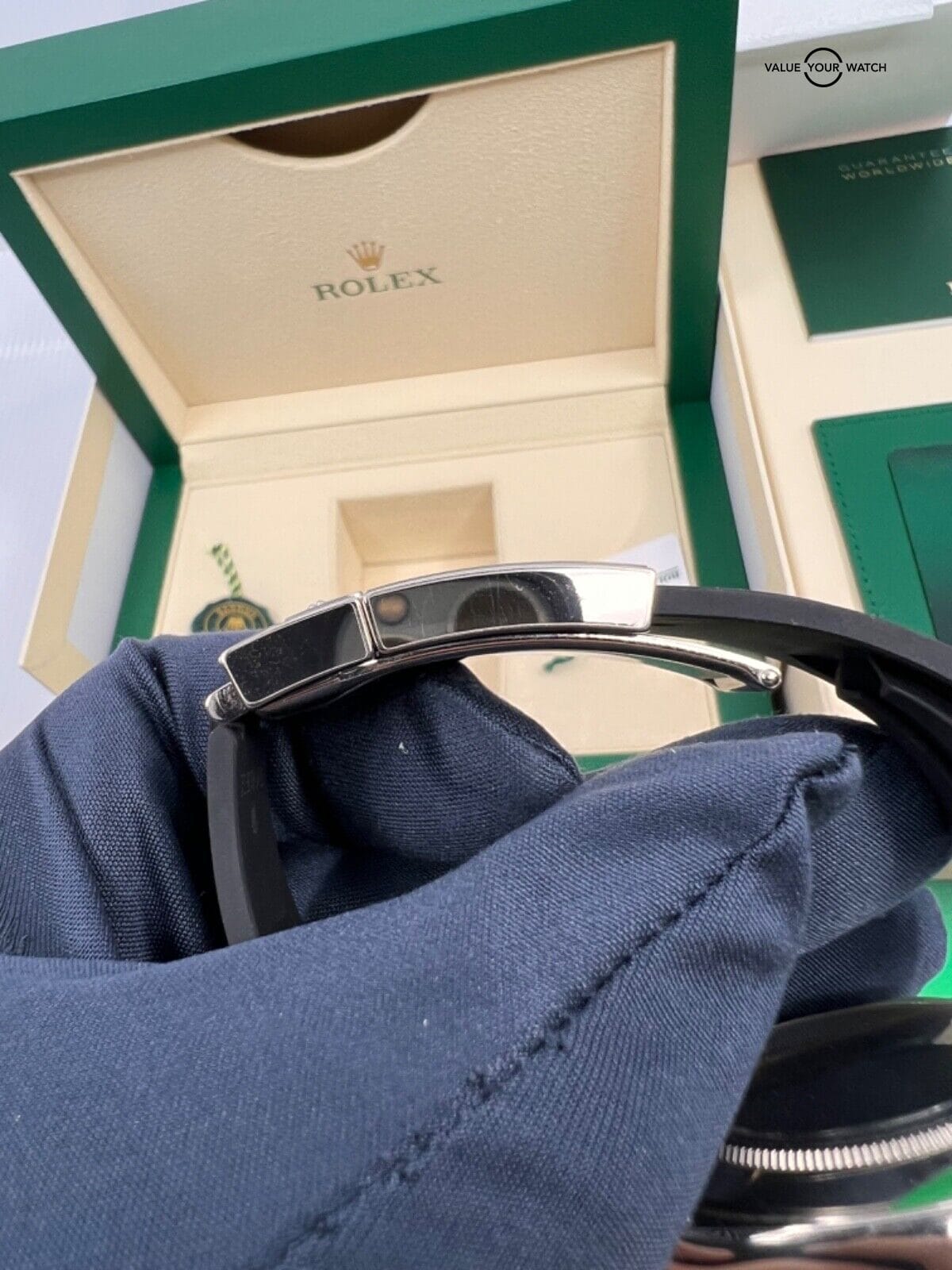 The watch comes with an Oysterflex bracelet, which is a perfect blend of rubber and metal for exceptional durability and comfort. The bracelet features a flexible metal core that provides stability and sturdiness, while the black elastomer coating ensures a comfortable fit on the wrist.