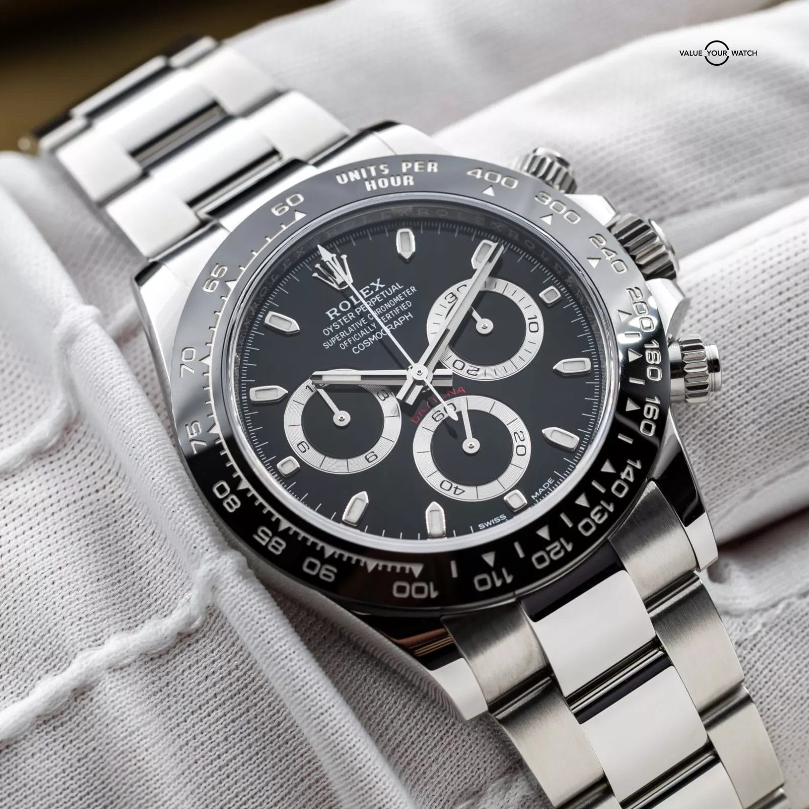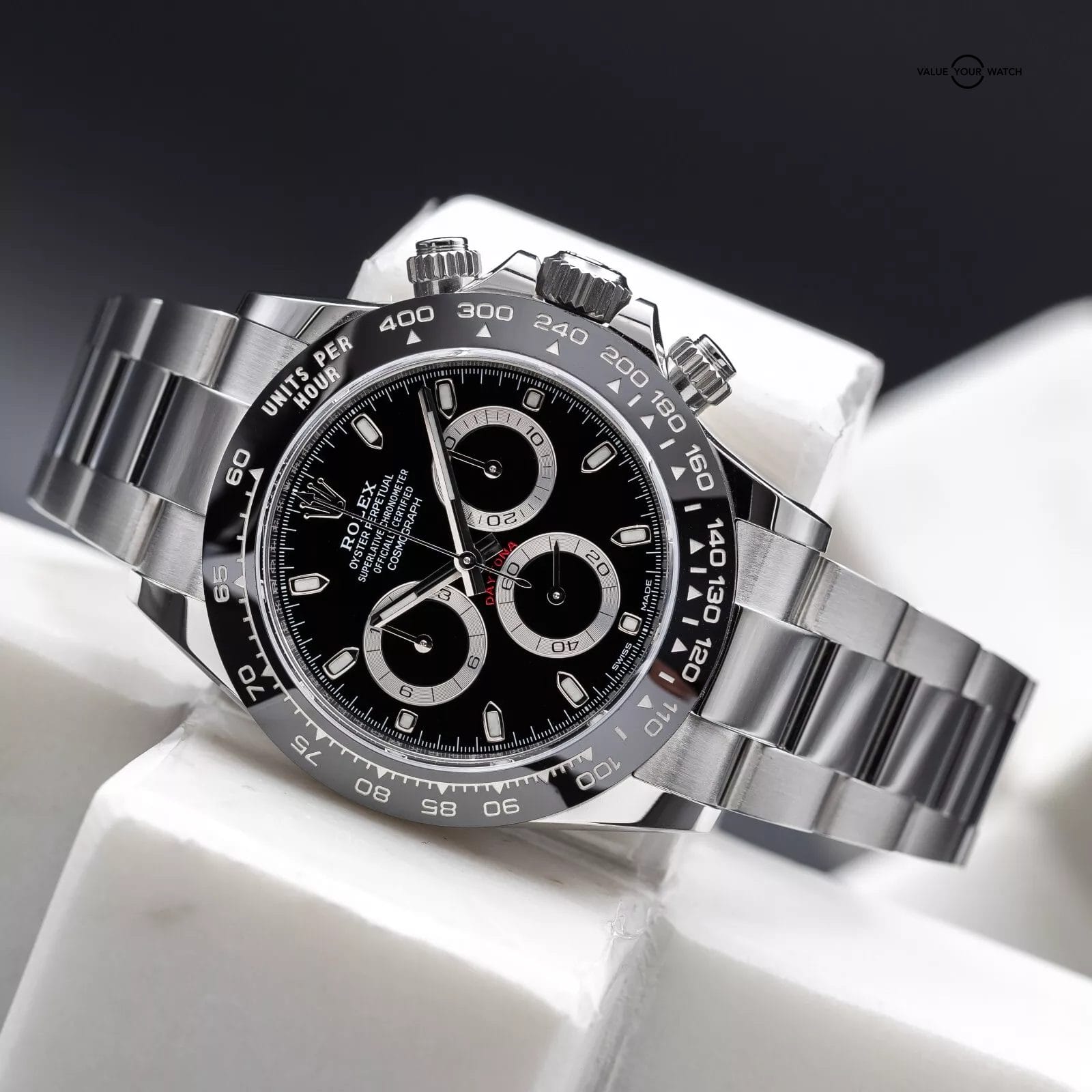 No introduction needed on this one. The ceramic Daytona in steel! This one features the classic black dial that contrasts beautifully against the silver rings on its trio of chronograph registers. This watch combines sporty elegance with a touch of luxury. Whether you’re dressing up or just going casual, this watch works for any occasion and is a real head-turner. It’s a must-have for any collector!