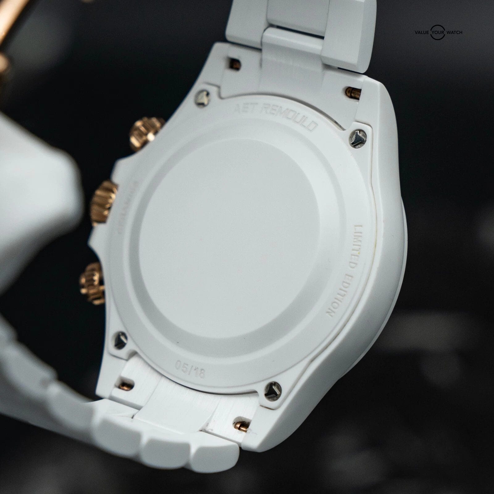 To honor the legacy of British Racing Green—a color once synonymous with racing speed, but largely absent from modern motorsports since F1 abandoned national colors in 1970—AET REMOULD has designed a limited edition timepiece named British Racing Green. Drawing inspiration from the original color’s heritage, the designers chose a vibrant clover green to represent hope, speed, and power, applying it to the dial and bezel. Accented with rose gold crown and pushers for a touch of luxury and passion, the watch is crafted entirely from ceramic, including the case, bezel, and bracelet. Only 18 pieces of this tribute to classic motorsports aesthetics were ever produced worldwide.