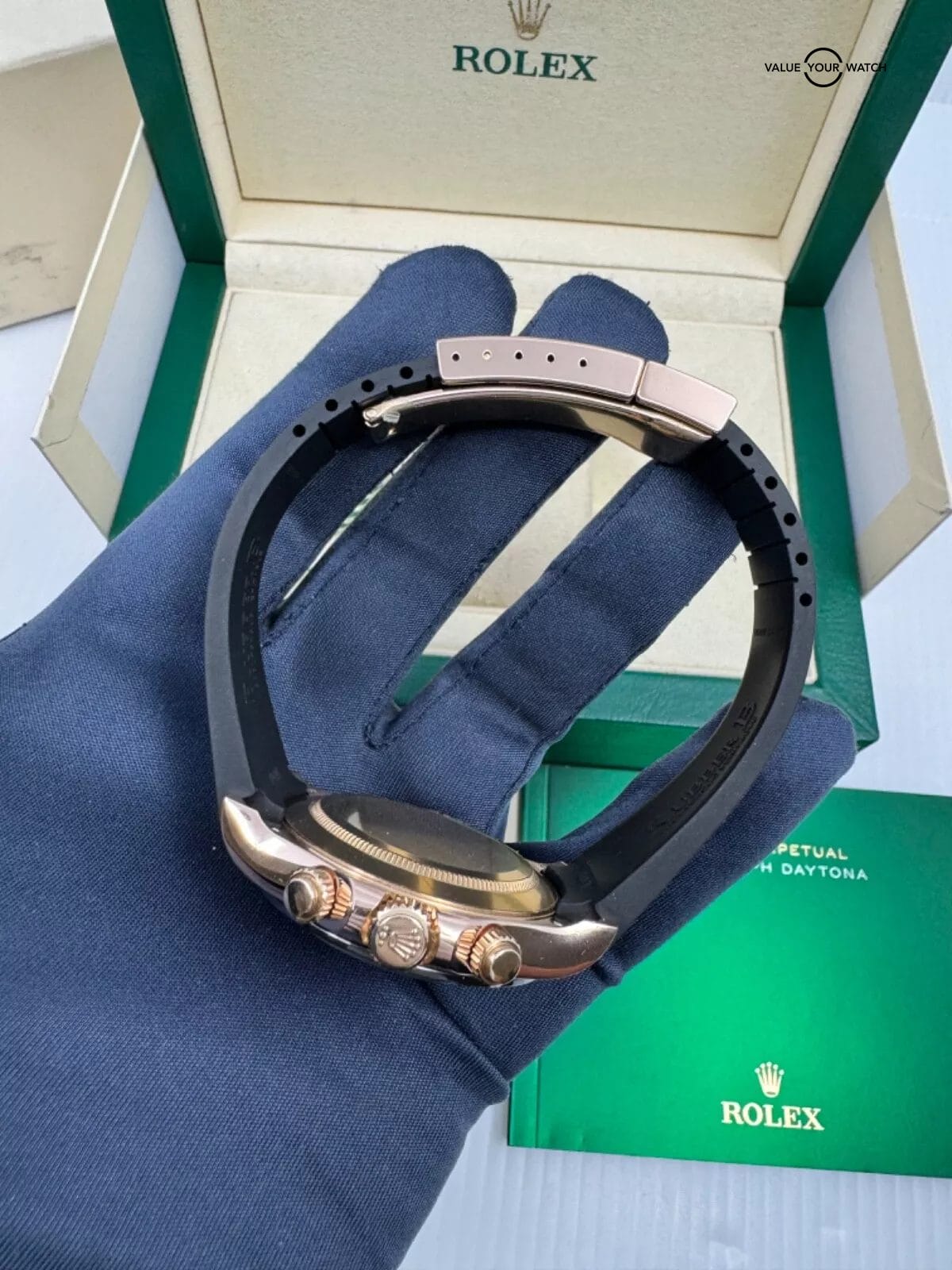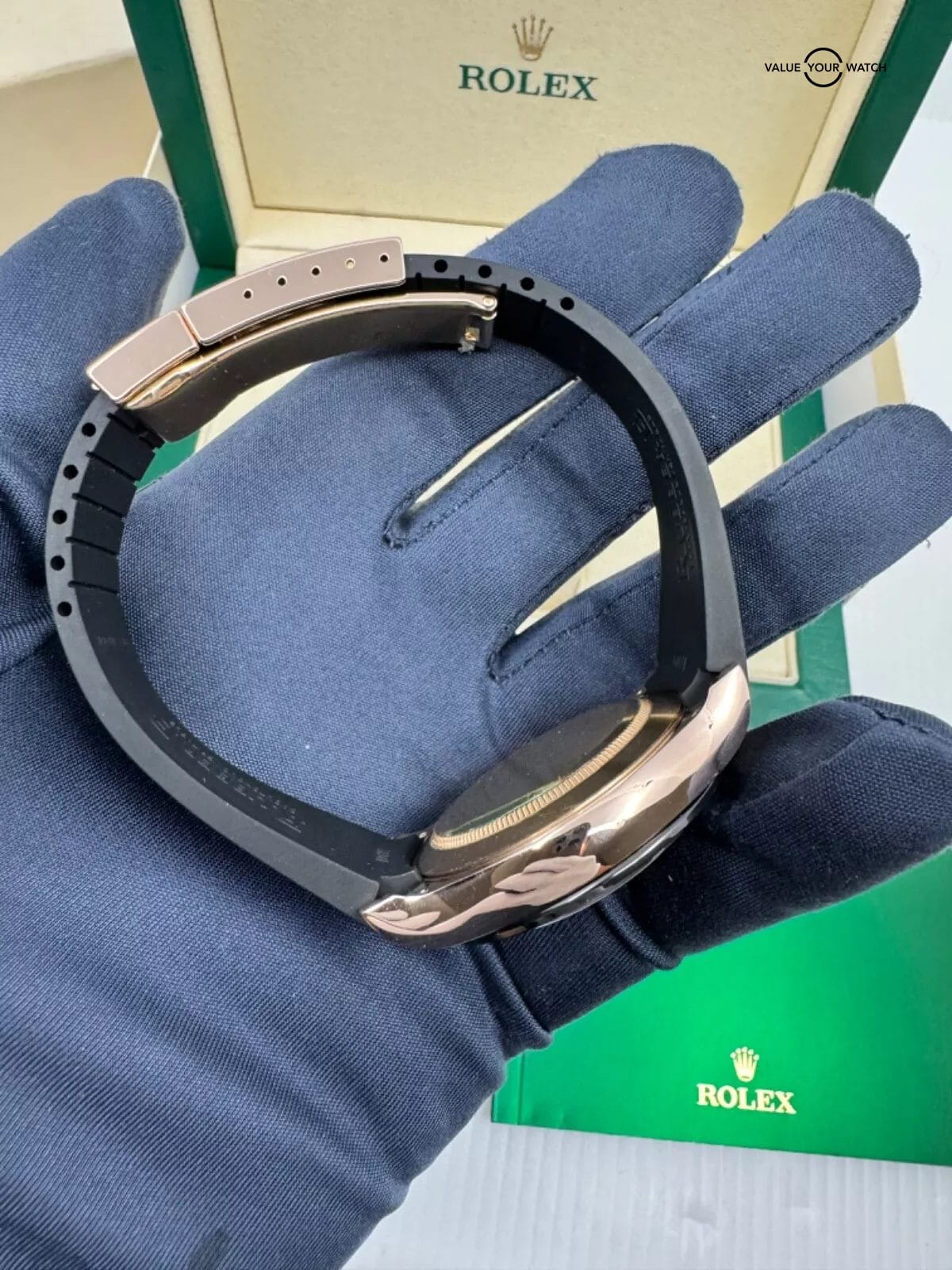 On an uncut Rubber B (not Rolex) strap for a more modern look and feel. Will fit a very large wrist or smaller if cut. This strap is from a high quality brand manufactured in Switzerland