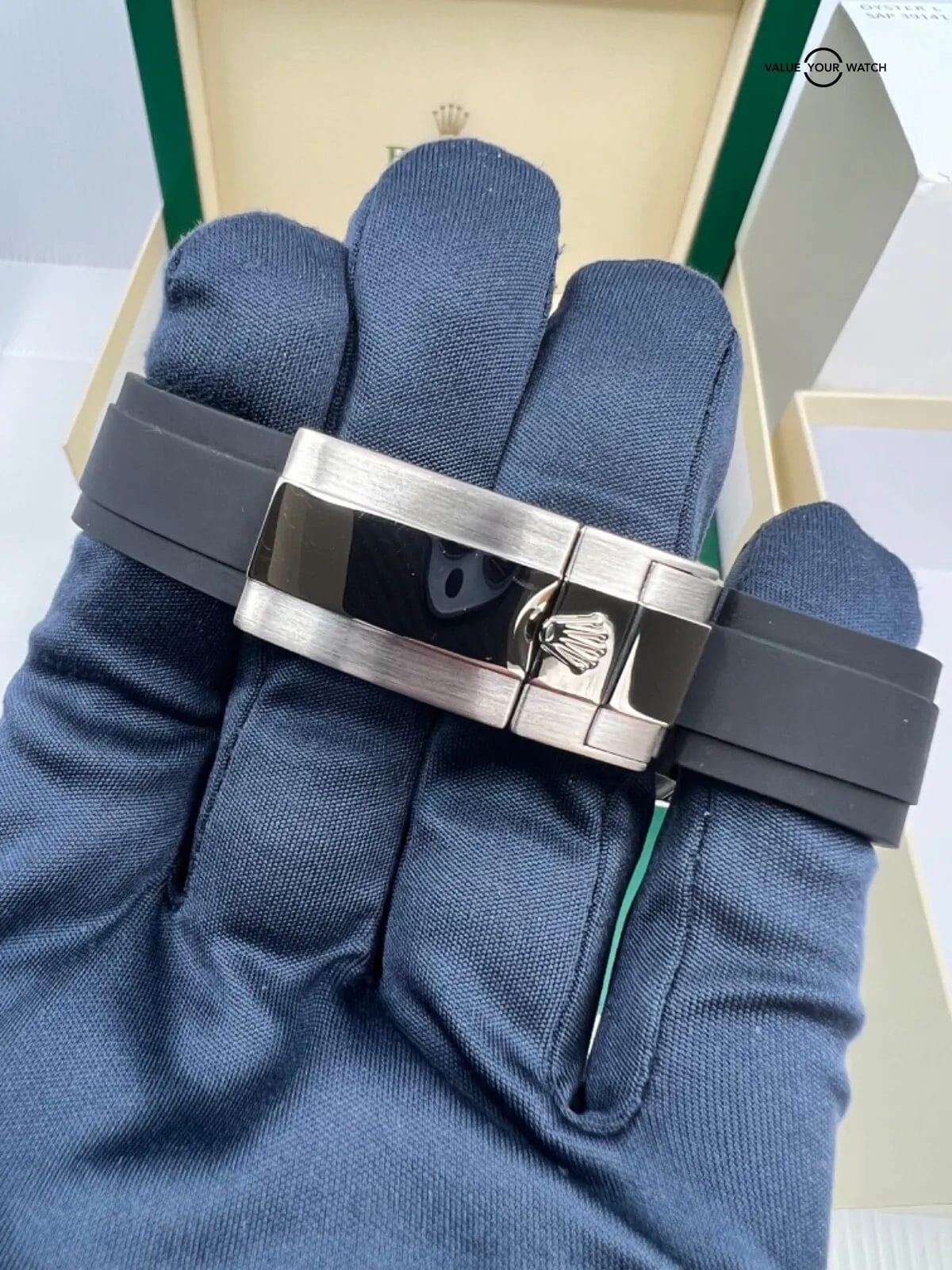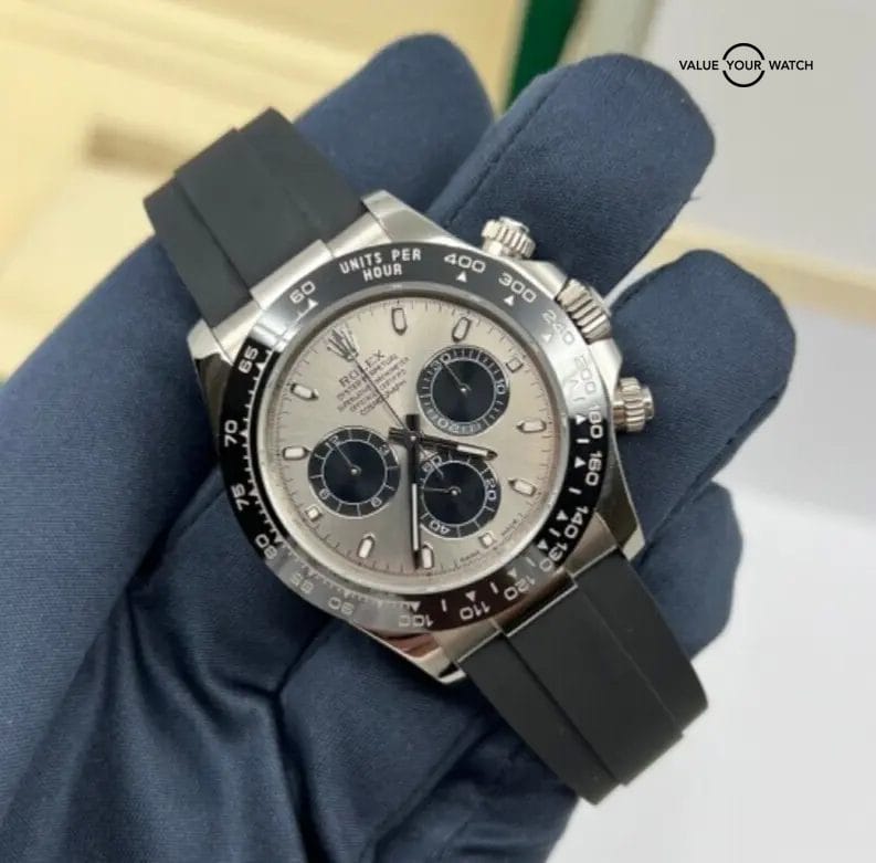 Chronograph, VERY HOT WATCH!!!, Rolex, Daytona, 40 mm 18K White Gold Case, Steel Dial w/ Black Sub Dials, Oysterflex Rubber Strap, Ceramic Tachymeter Bezel