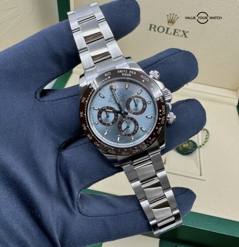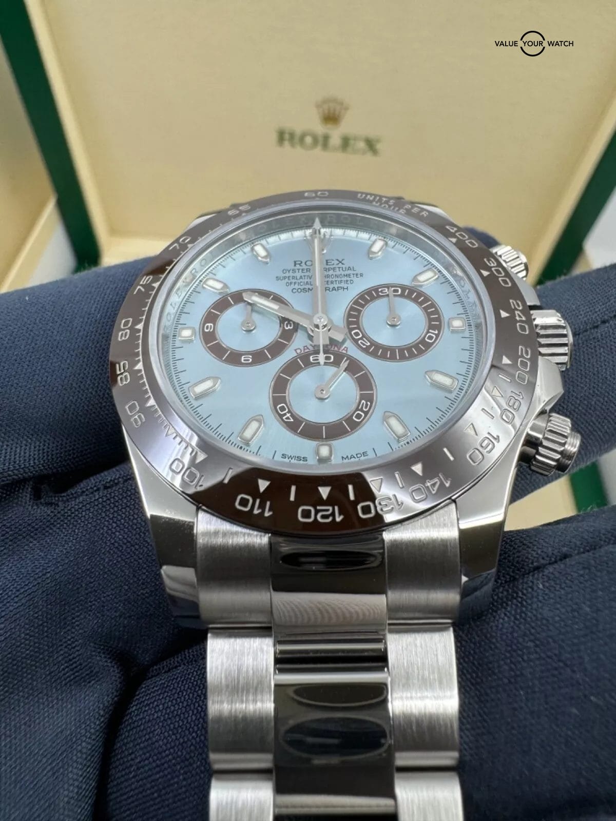 The Rolex Daytona in platinum with the glacier ice blue dial is an exceptionally luxurious and prestigious watch. Here are the details for this model: