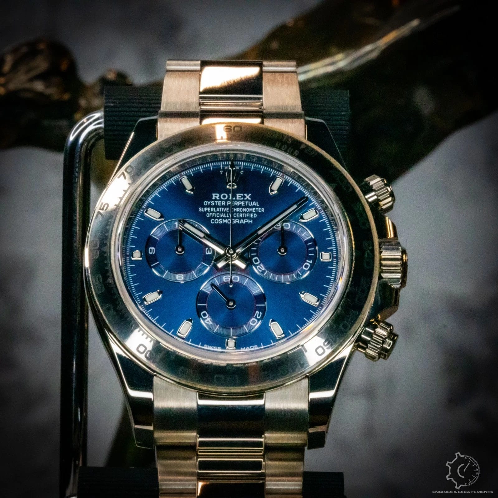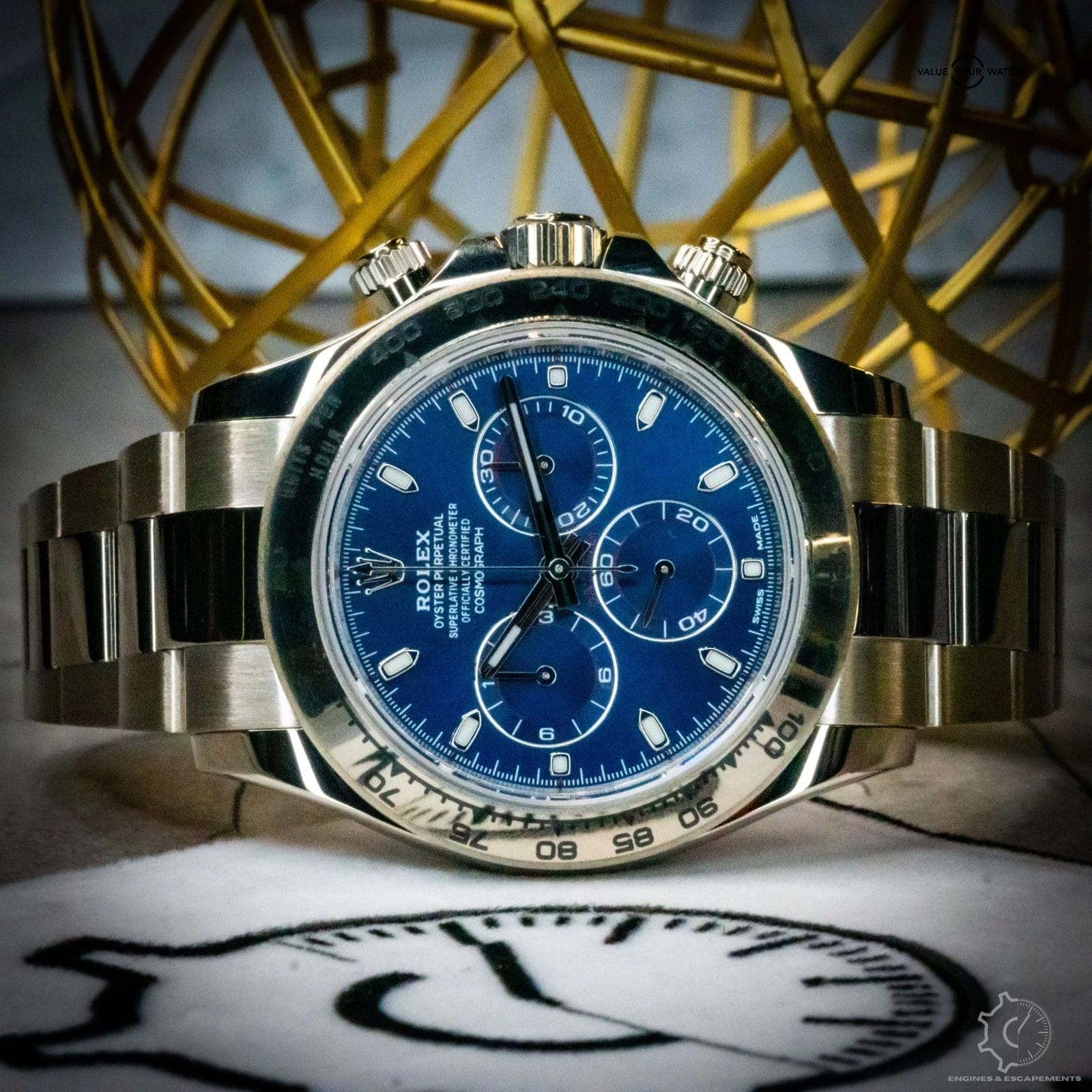 The Rolex Daytona 116509 with blue dial is a striking blend of sport and luxury, crafted entirely from solid 18k white gold. Its 40mm Oyster case carries the iconic Daytona silhouette, but the vibrant sunburst blue dial sets it apart—shimmering with depth and elegance under changing light. Red chronograph accents add a dynamic touch, giving the watch both energy and refinement.