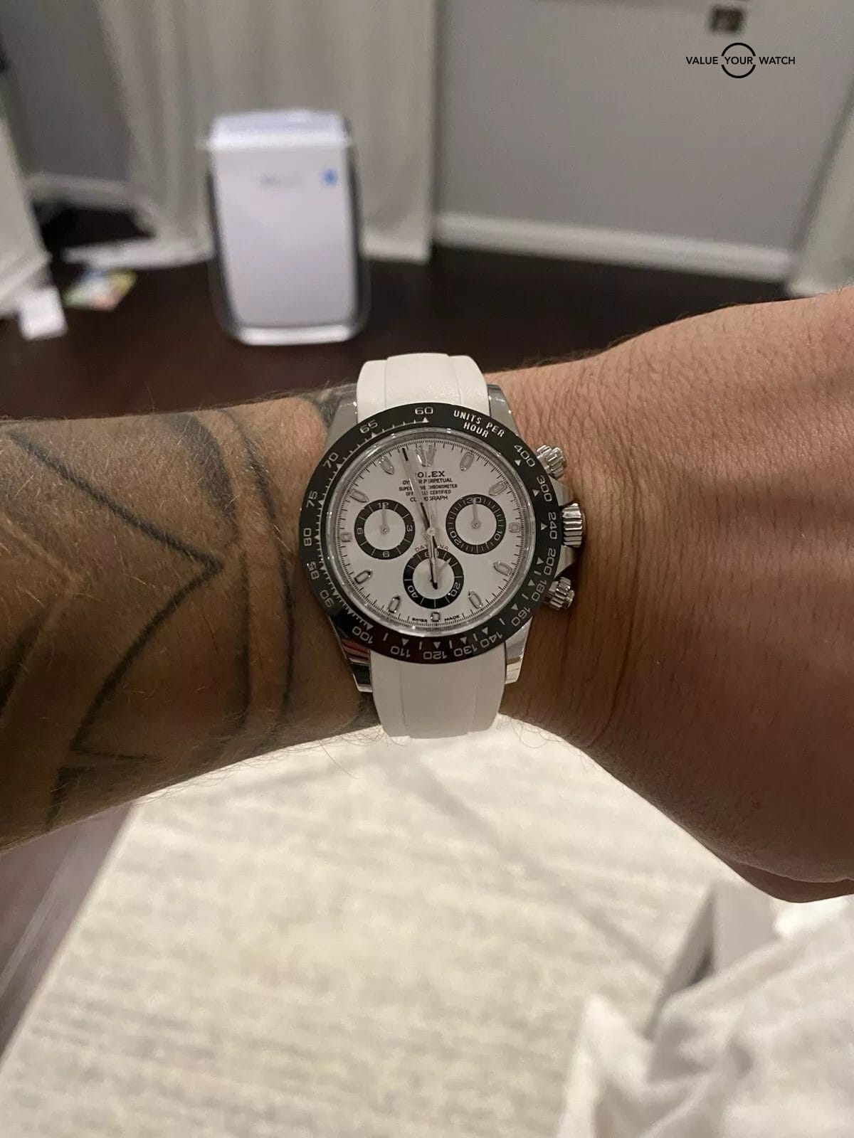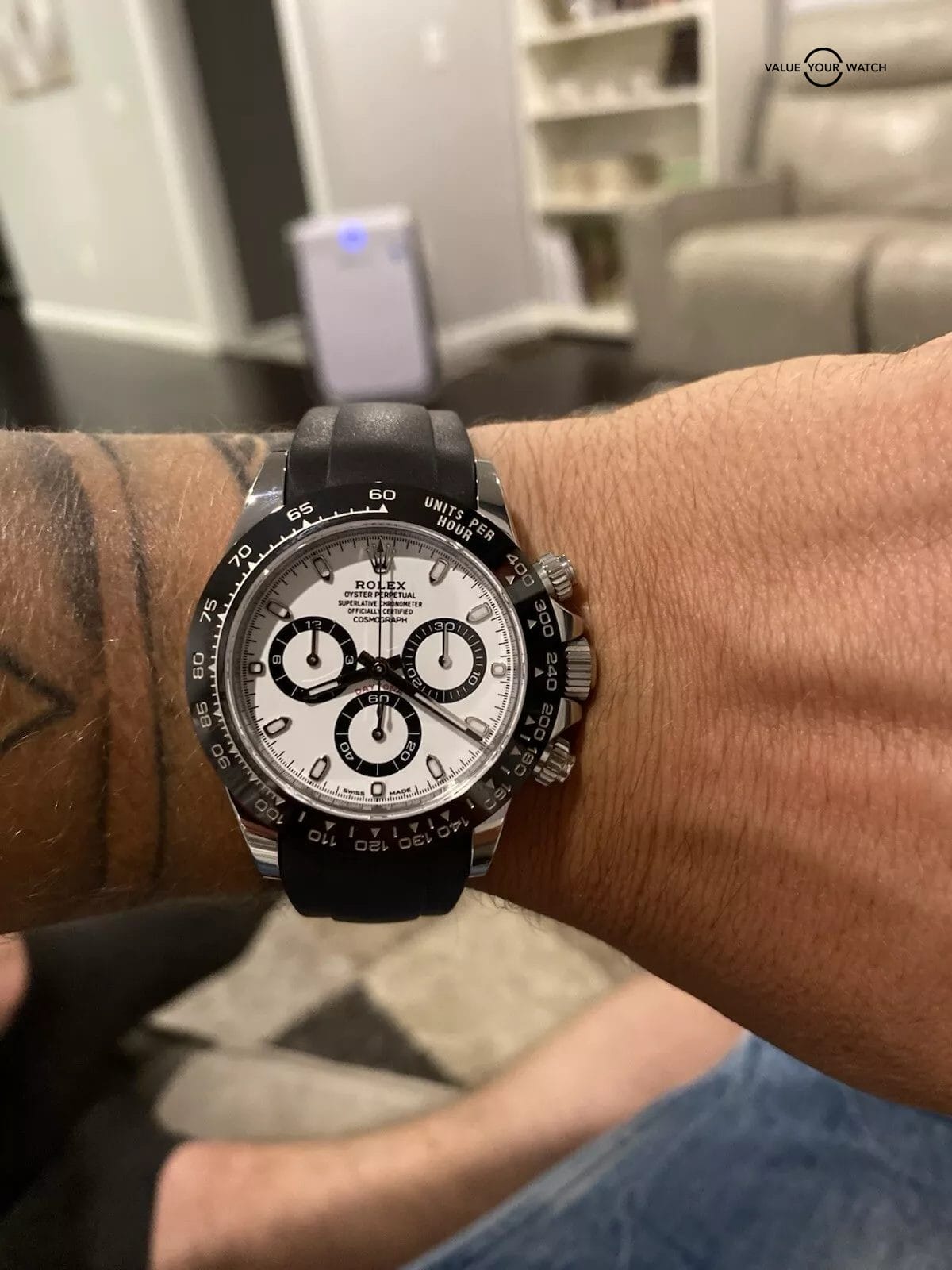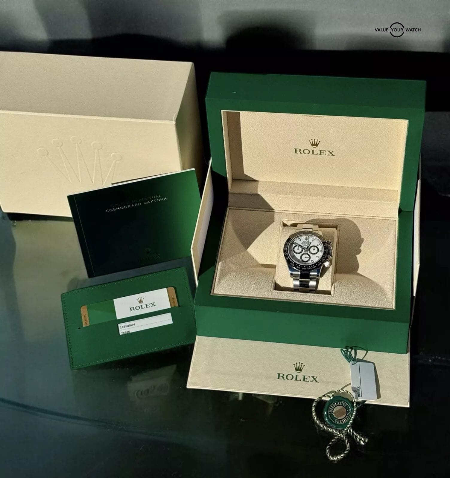 The Rolex Cosmograph Daytona White Panda 116500LN features a sleek silver stainless steel case with a tachymeter bezel and a white dial adorned with arrow markers and baton indexes. The watch has a self-winding mechanical movement with 44 jewels, providing precision timekeeping. It comes with a Rolex Oyster bracelet, has a water resistance of 100 meters, and includes the original box and papers, making it a complete set for the discerning watch collector.