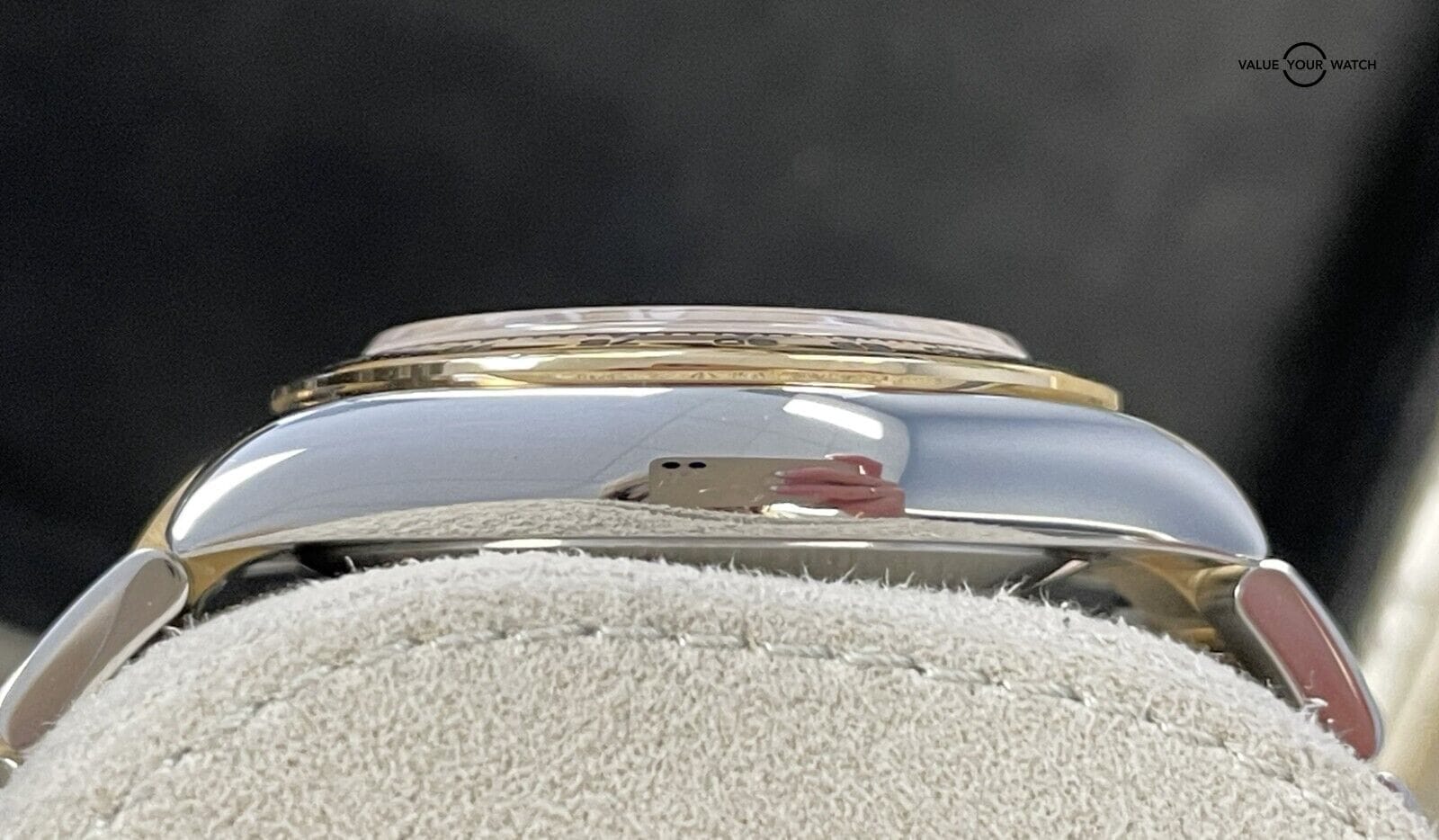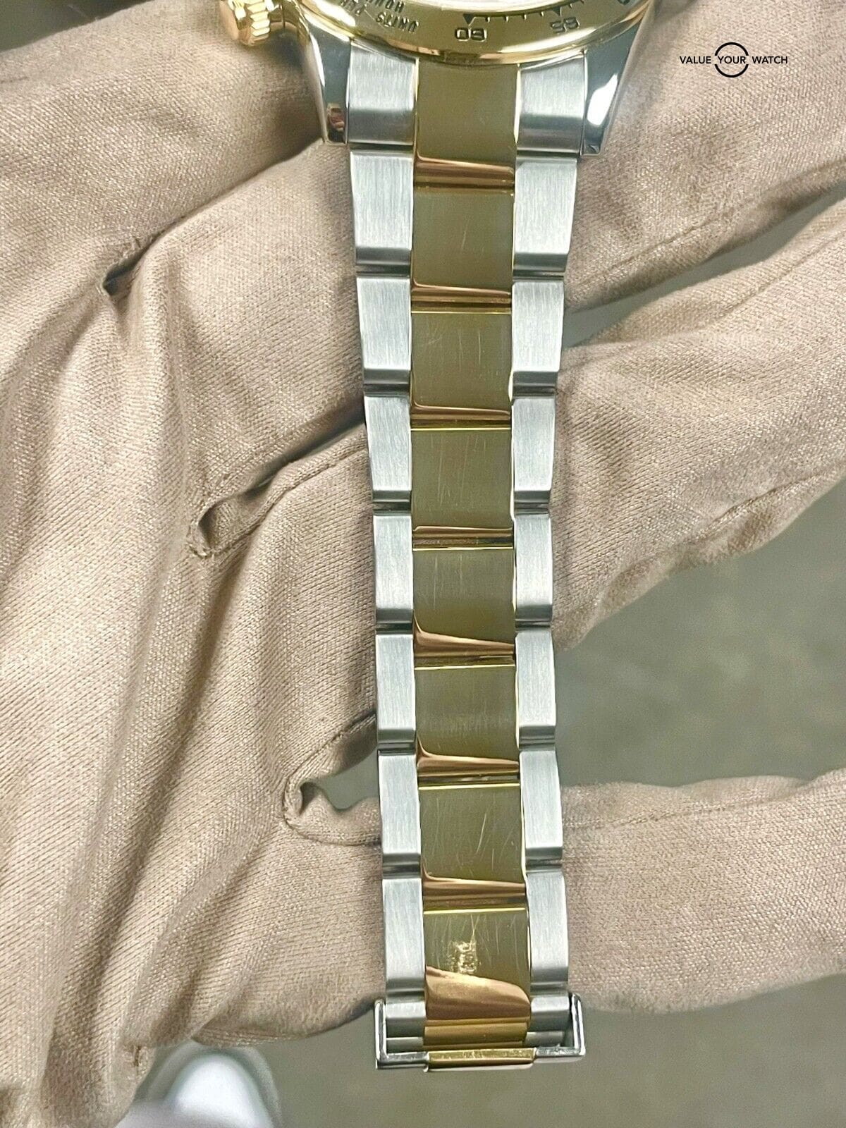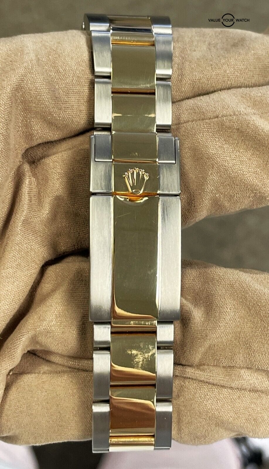 This beautiful timepiece comes complete with the outer white sleeve, outer cream box, inner green wave box, all links, both hangtags, booklets, and original warranty card (Dated July 31, 2019). The watch is in excellent pre-owned condition with light cosmetic wear throughout the case and bracelet. The gold bezel has a few small pinpoint dings. Pay close attention to the pictures as they accurately describe the condition. Mechanically the watch is functioning as it should. Serial numbers and names are blurred in photos only for privacy reasons.