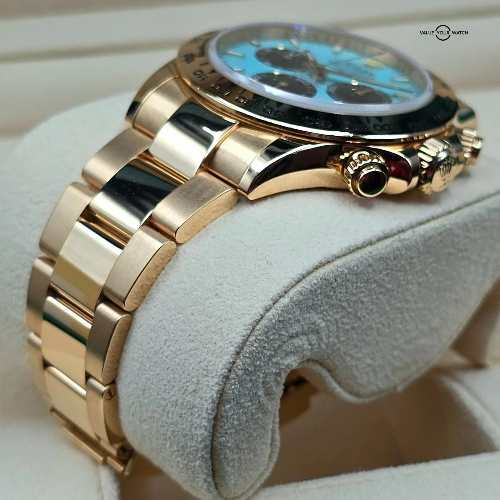 In this piece, the full casing and bracelet in 18k yellow is of course stunning, but now with the perfect hue of turquoise, a new look is born. Be the first to have this incredible configuration, before Rolex is even making it!