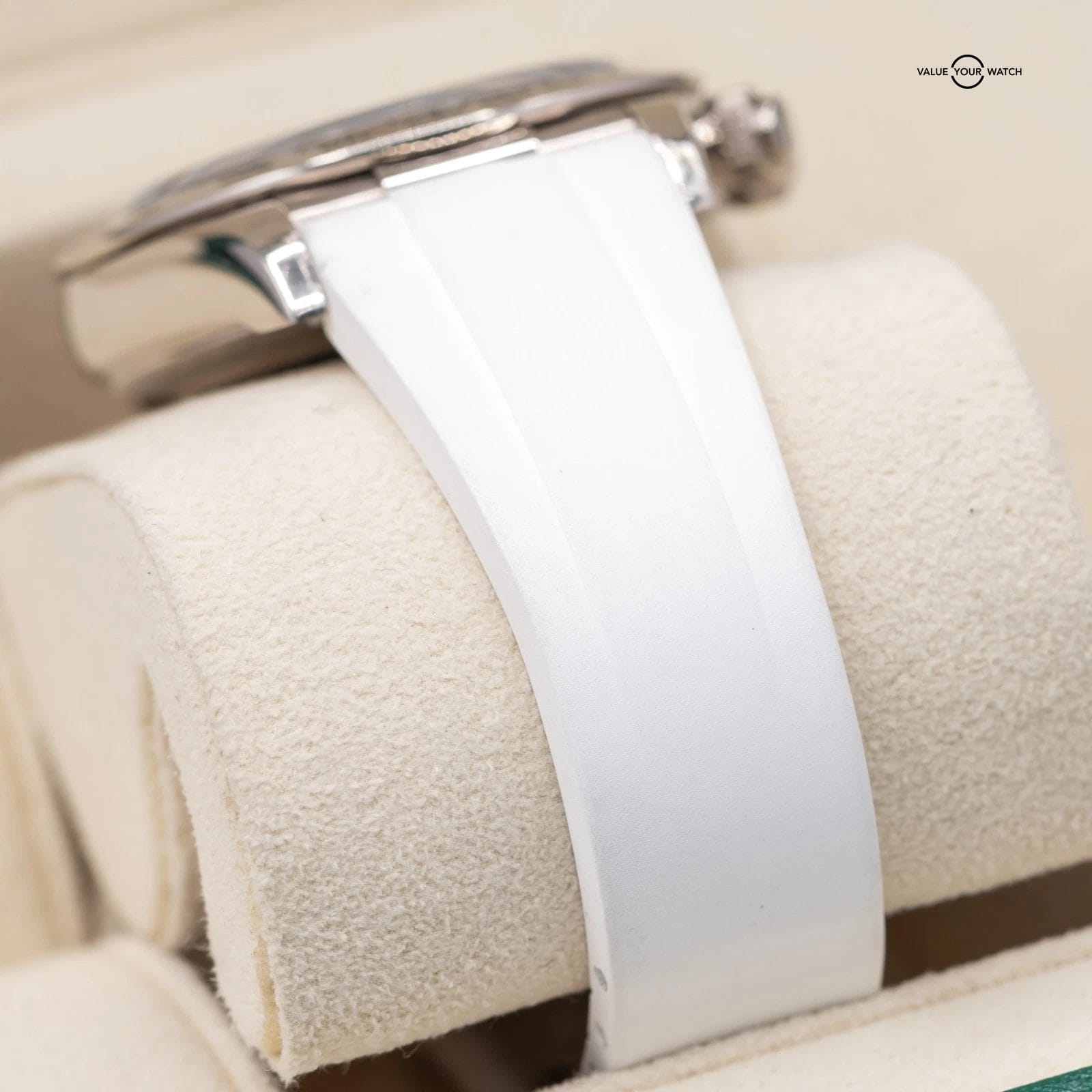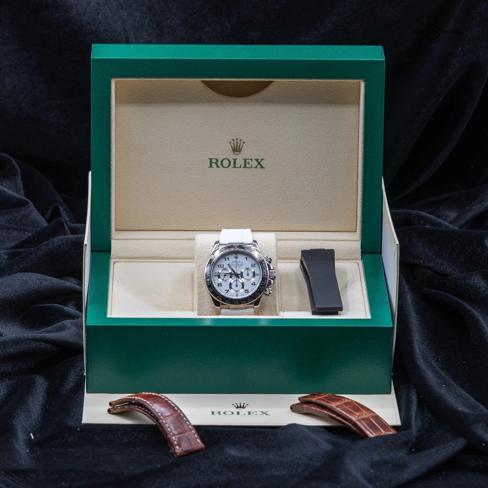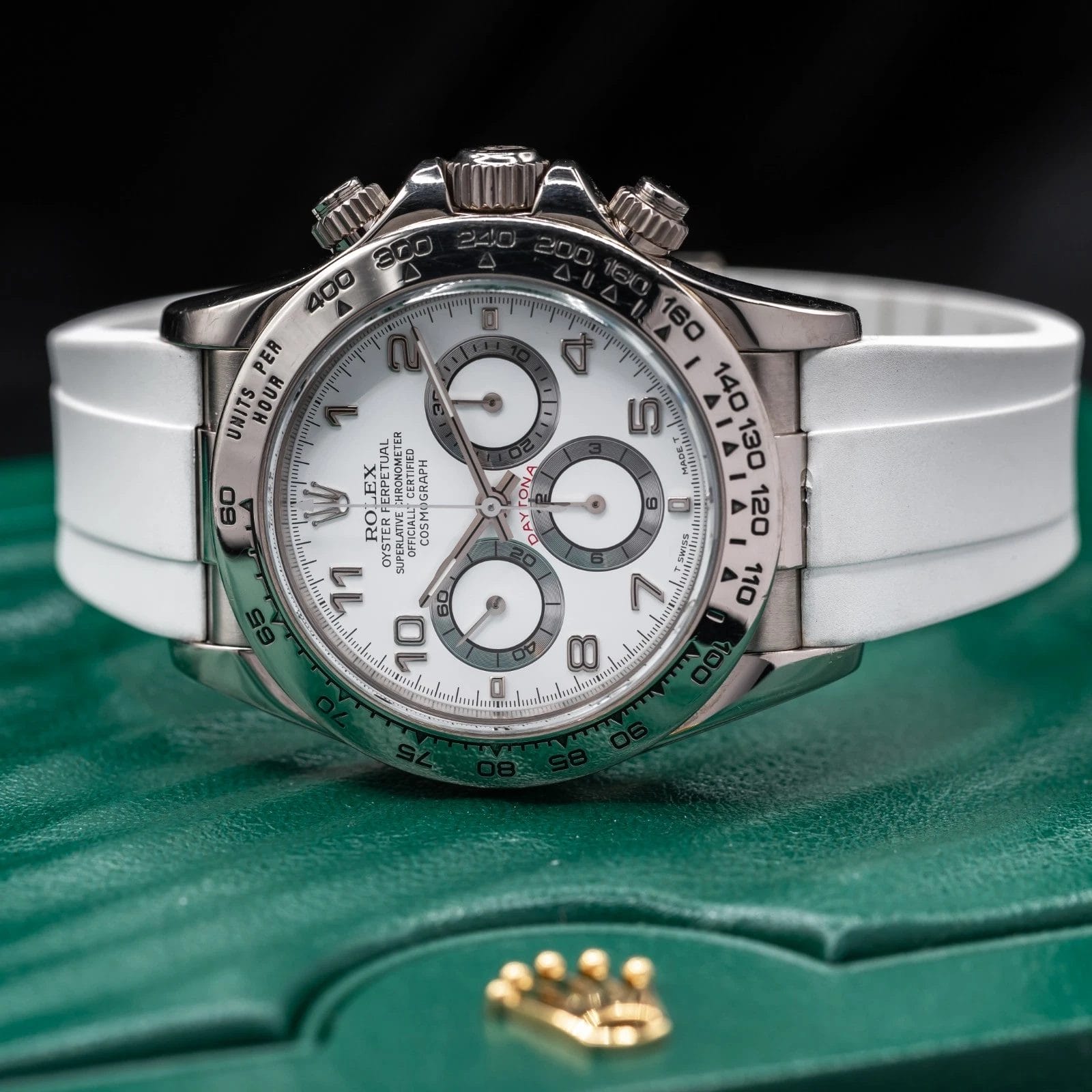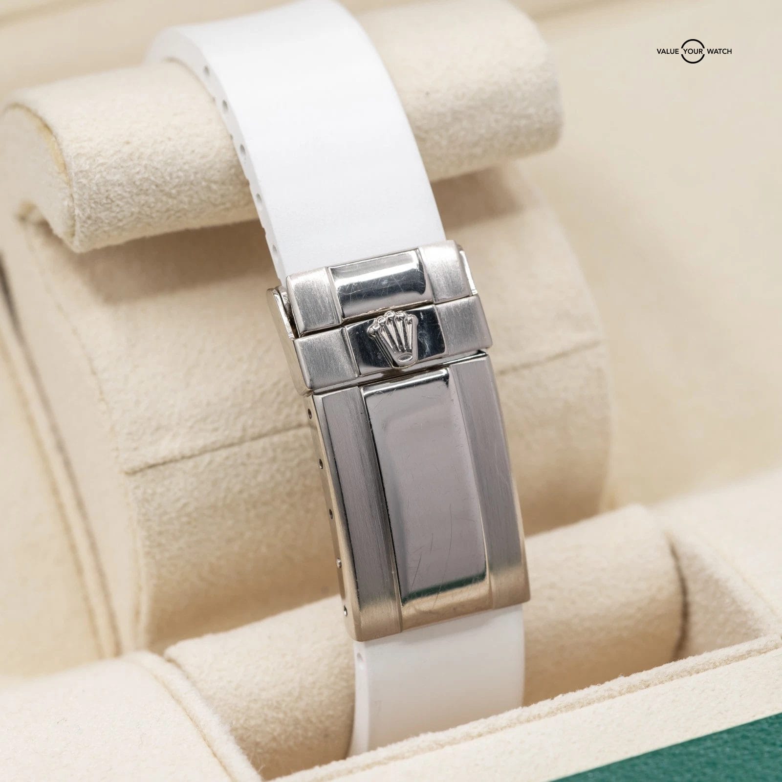 Comes fitted on a white RubberB strap, and also includes a black RubberB strap, and two sets of original Rolex leather straps. The buckle is original Rolex white gold!