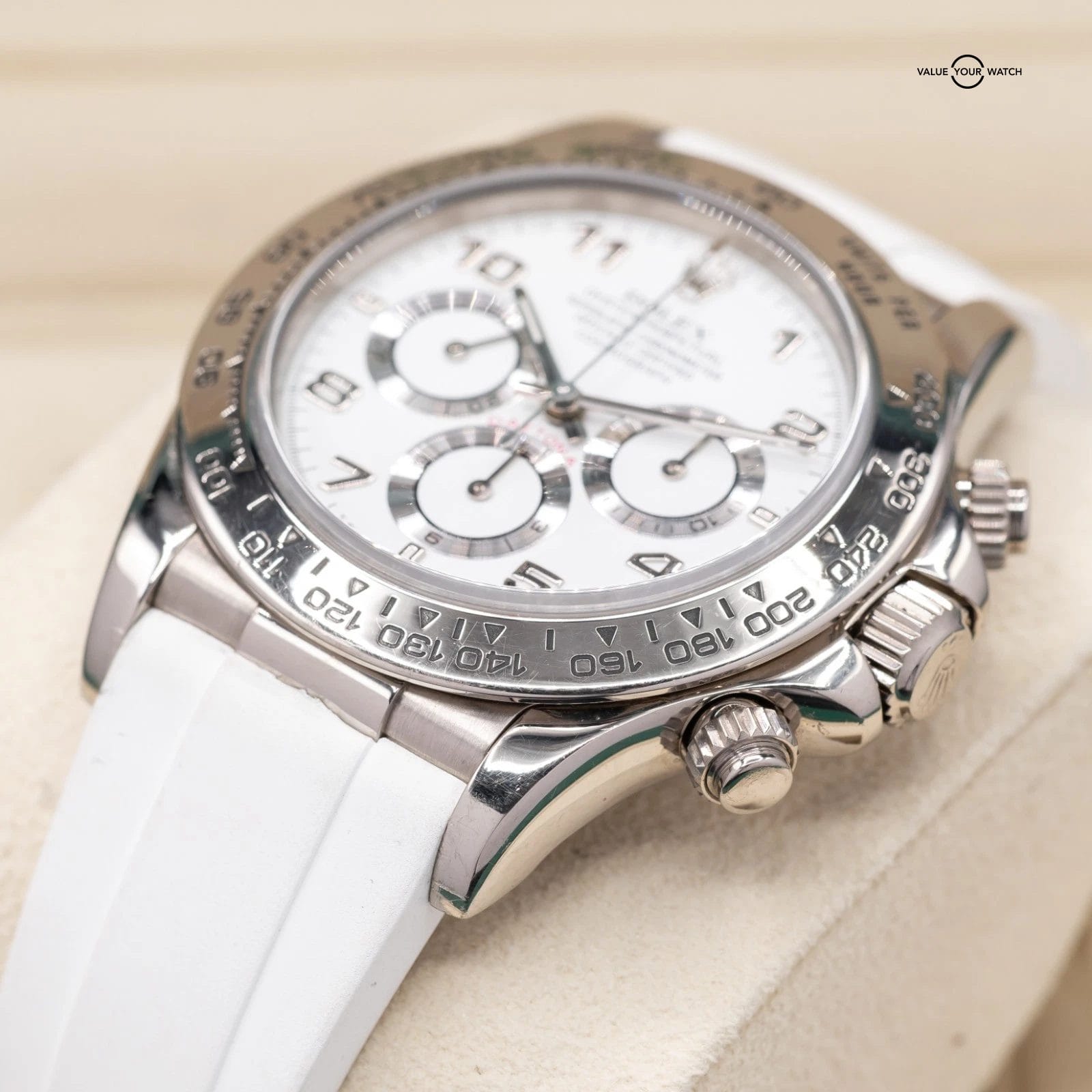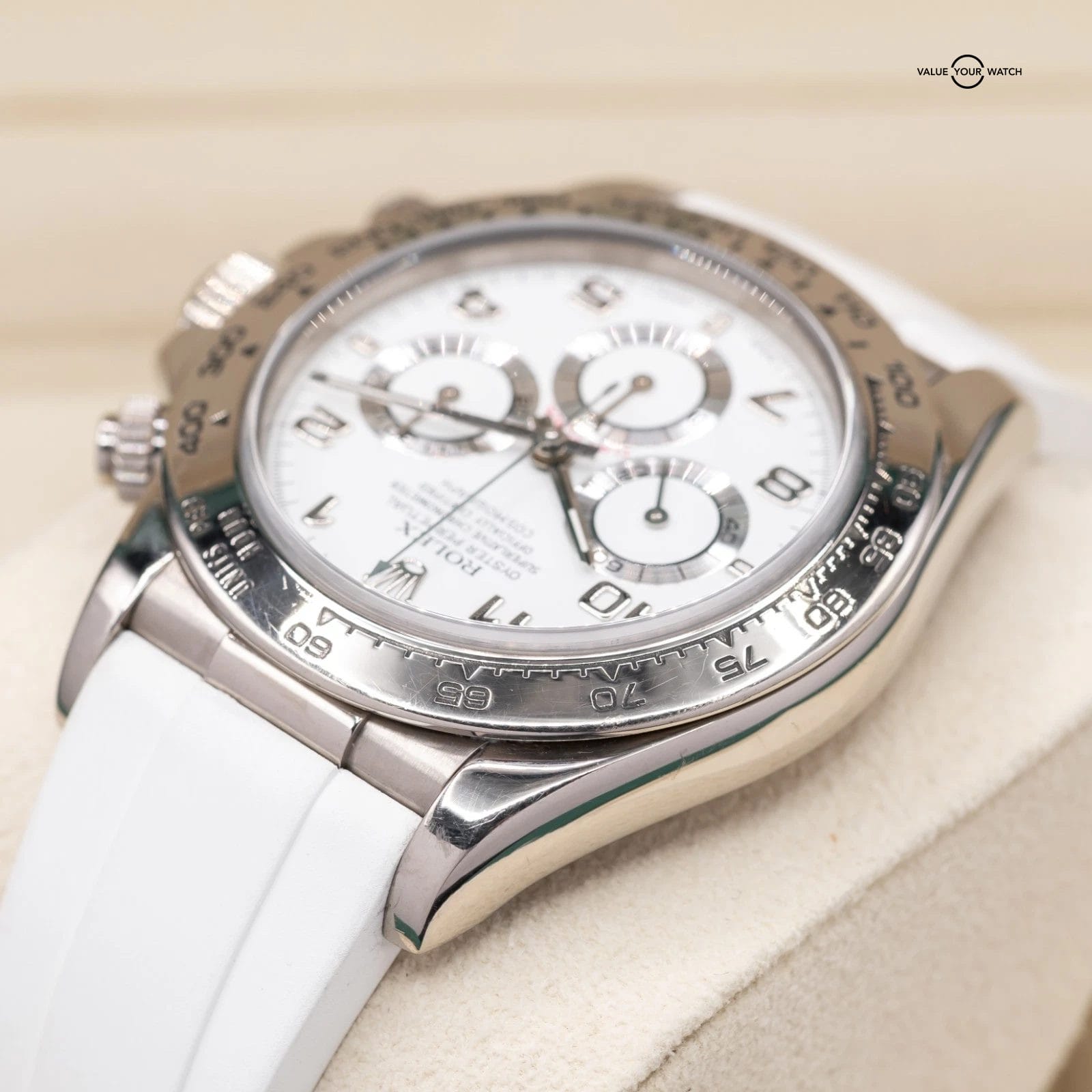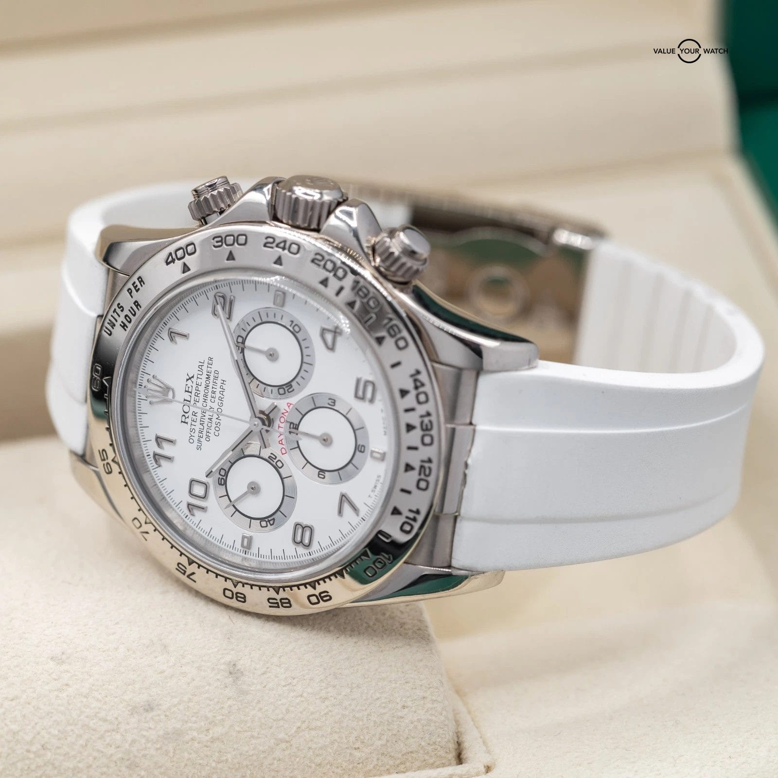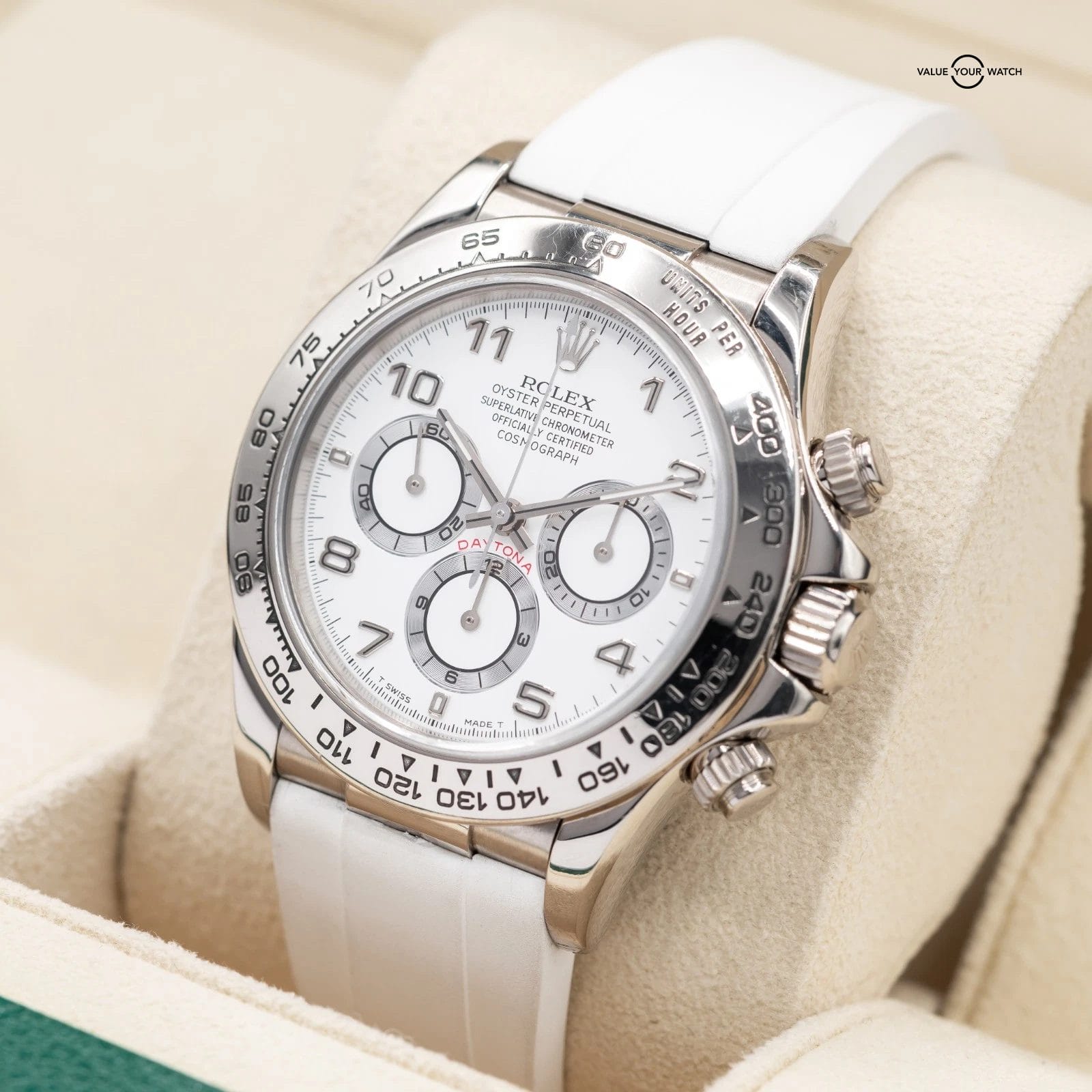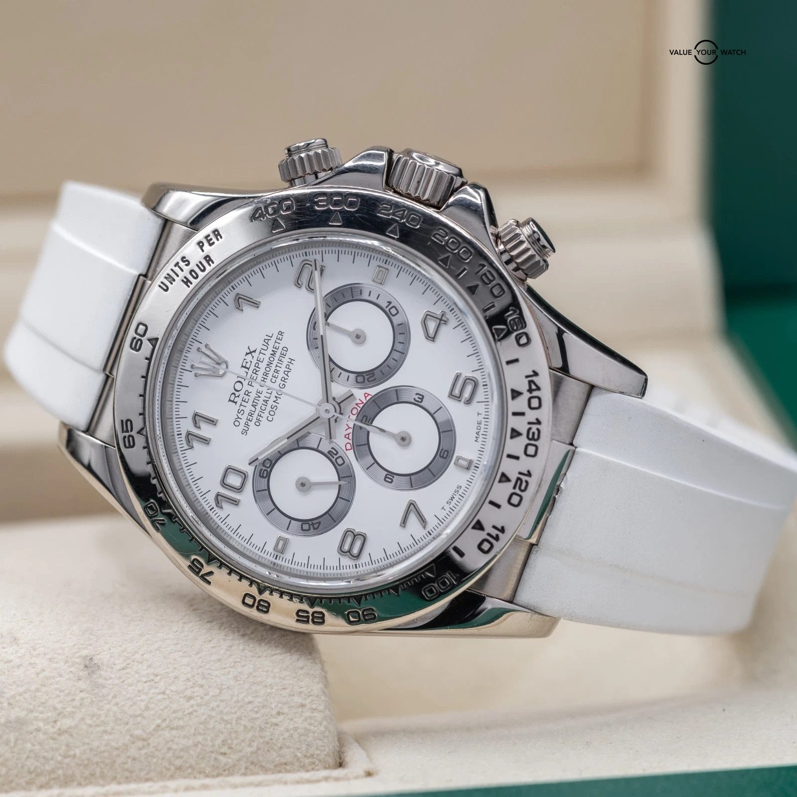 Comes fitted on a white RubberB strap, and also includes a black RubberB strap, and two sets of original Rolex leather straps. The buckle is original Rolex white gold!
