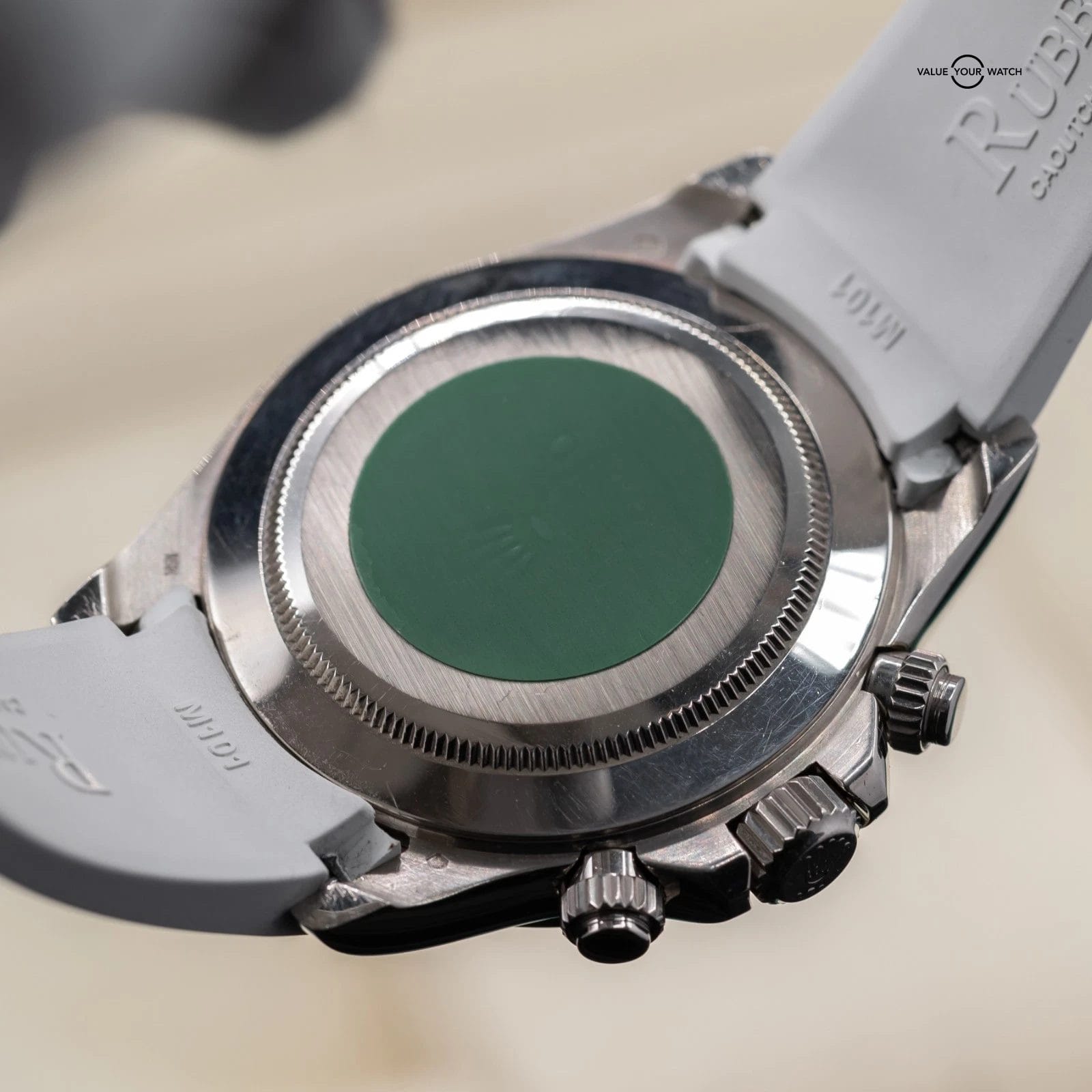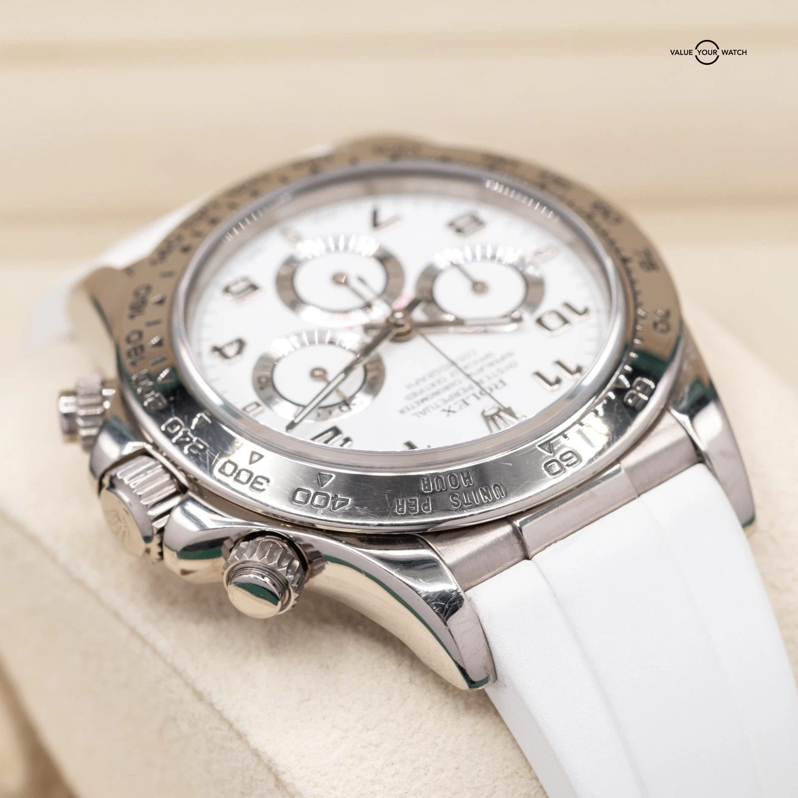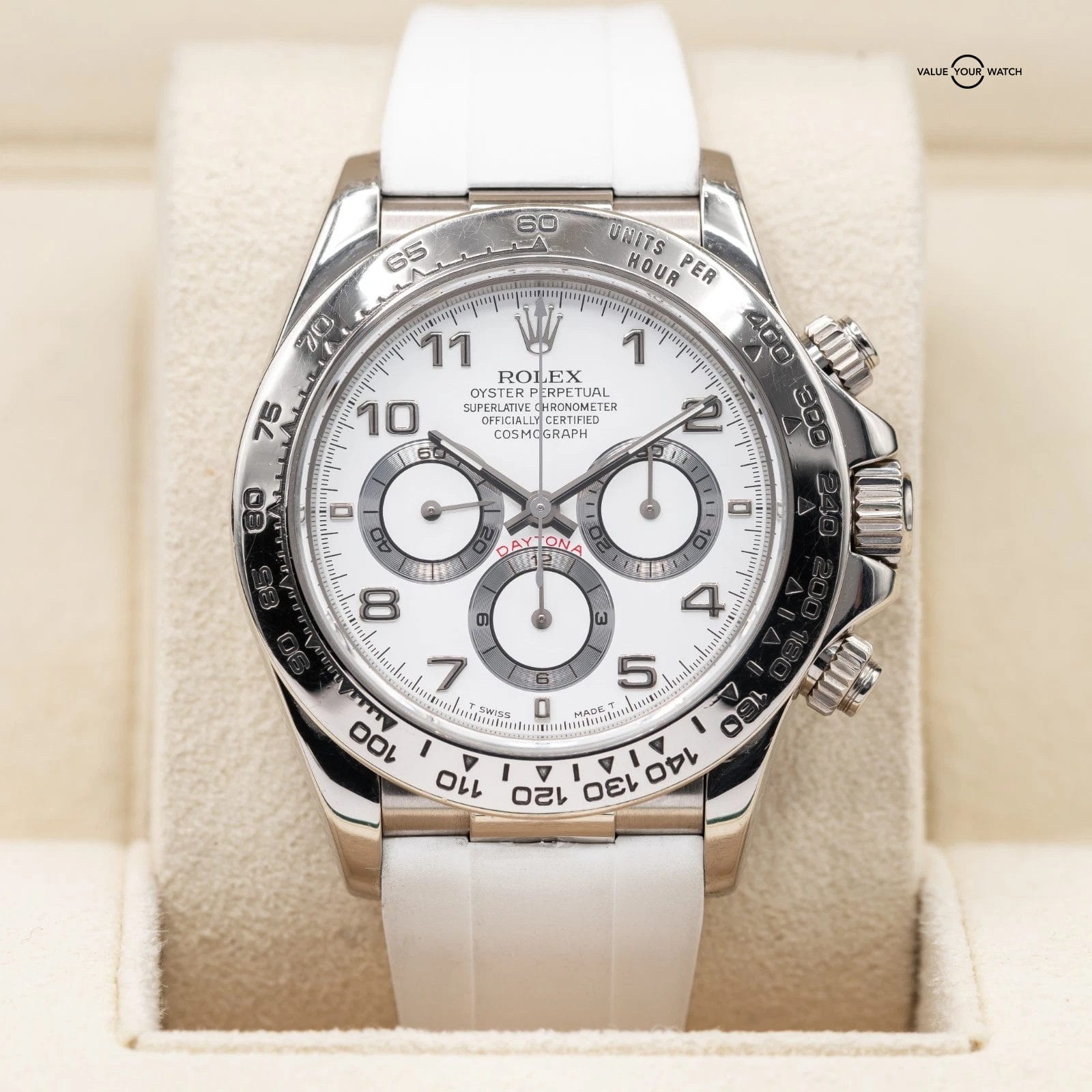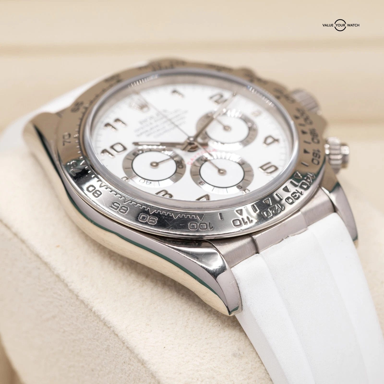 Comes fitted on a white RubberB strap, and also includes a black RubberB strap, and two sets of original Rolex leather straps. The buckle is original Rolex white gold!