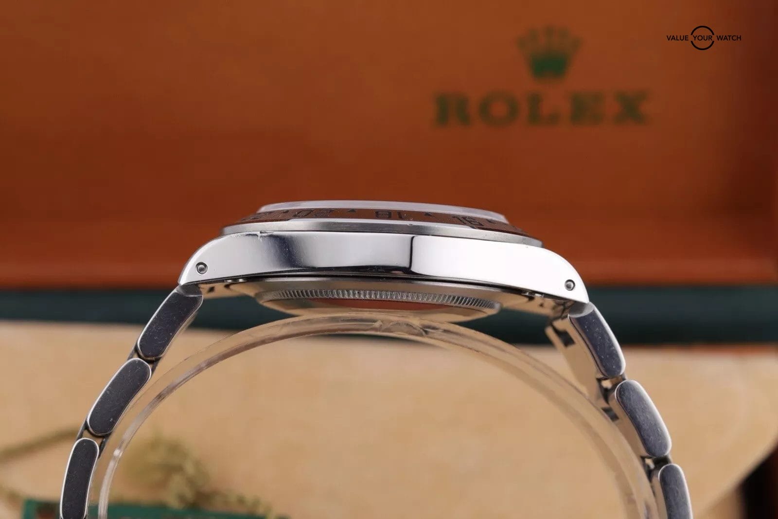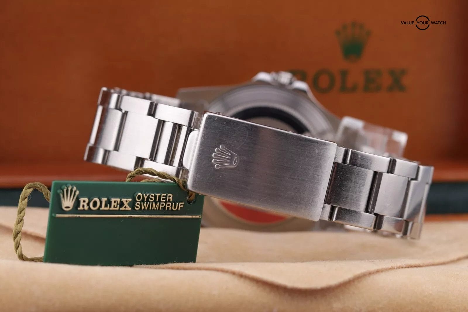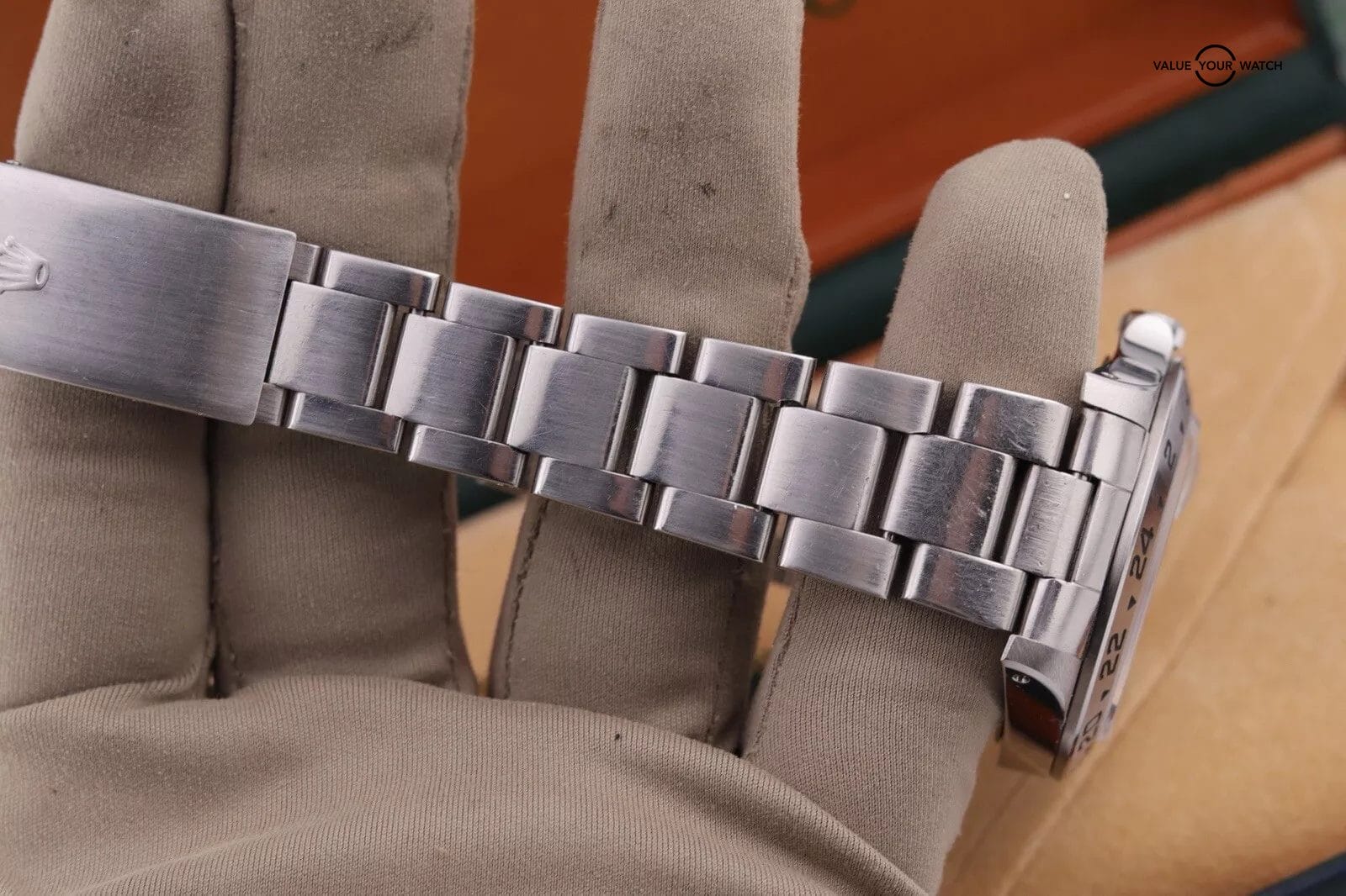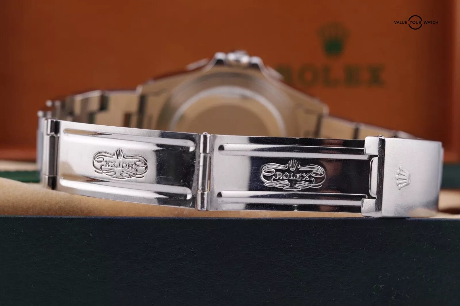 – Crystal is clean, but there is a small piece of lint underneath it above Cyclopes. The lume on the hands has fallen out. Wear in case in form of light scratches and some flea bites. The case does not appear to be overpolished/unprofessionally polished as the chamfers are still present and edges are sharp. There is wear in bracelet and some stretch. Bracelet would refinish nicely with right guy. Overall this watch could clean up nice but doesn’t NEED it. See photos as we tried to accurately capture condition.