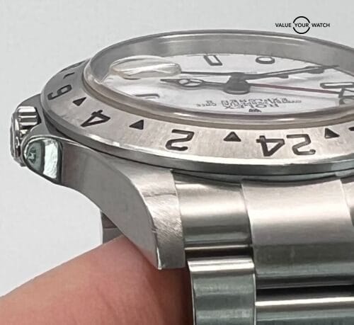The no holes case on this polar Explorer appears to be unpolished showing average wear from use. Looks excellent on the wrist to the naked eye. The stainless steel bezel is also in excellent condition showing light wear. The white dial shows no signs of wear and the lume on the factory original hands match perfectly with the lume on the dial. The 12 link Oyster bracelet is excellent and shows only very minor stretch. The watch is running to factory specifications and is in no need of imminent service.