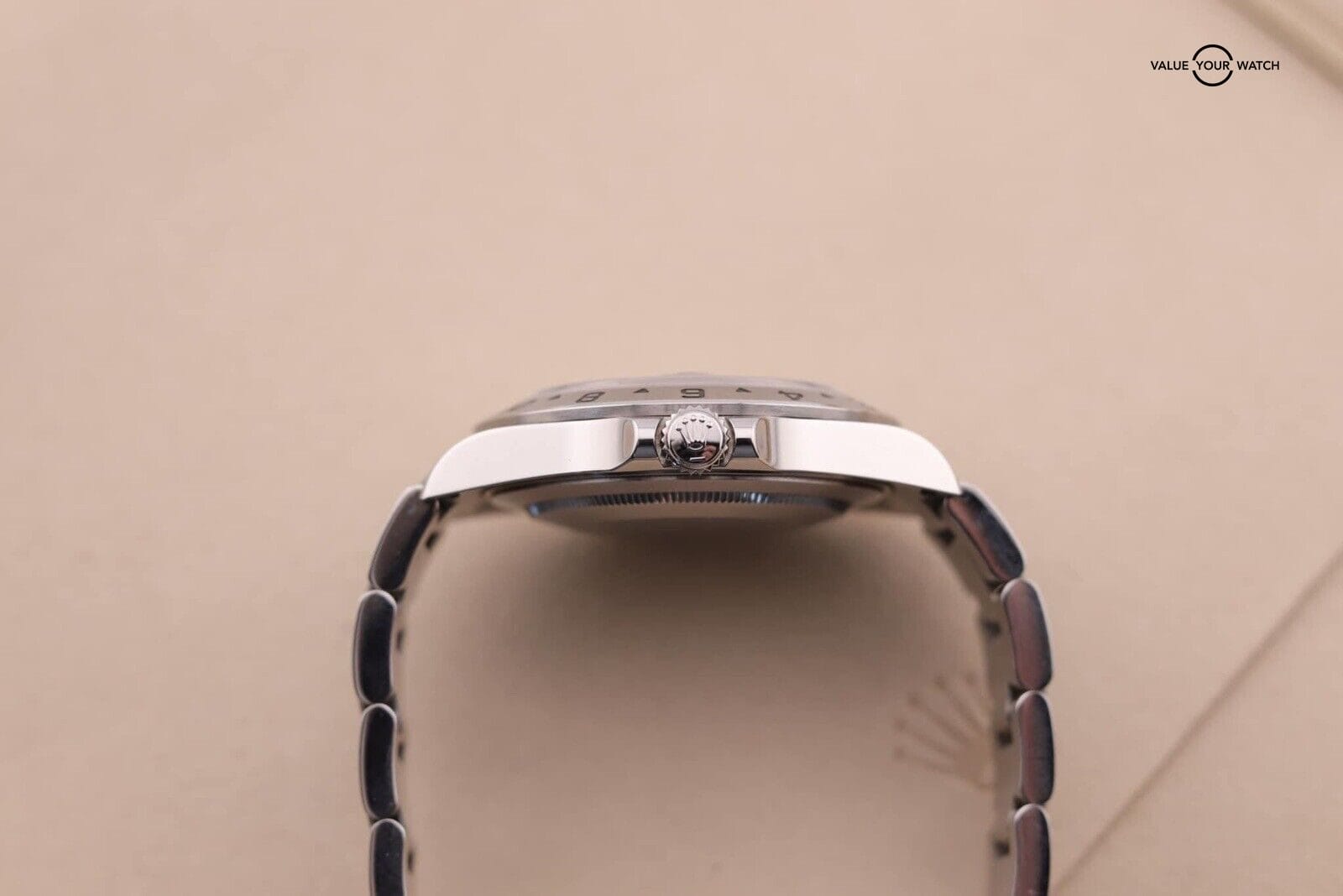 Condition: Watch is in excellent condition. This is one of the best Explorers I’ve had in a while. This one was a safe queen. There is minimal light scratches from handling on the bracelet and case. The sapphire crystal is in perfect condition with no scratches. No stretch or play in the bracelet. This is a no holes case and solid endlink model. There is 12 full size links. It’s keeping great time but there is no service history. Box and papers dated 2005. D-serial.
