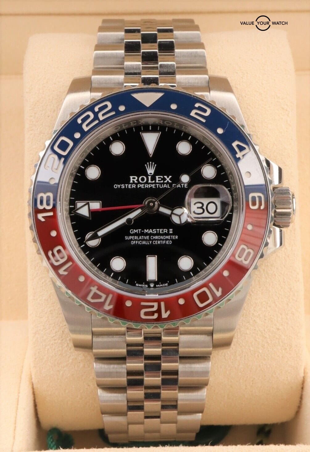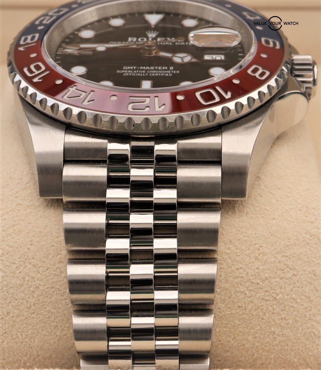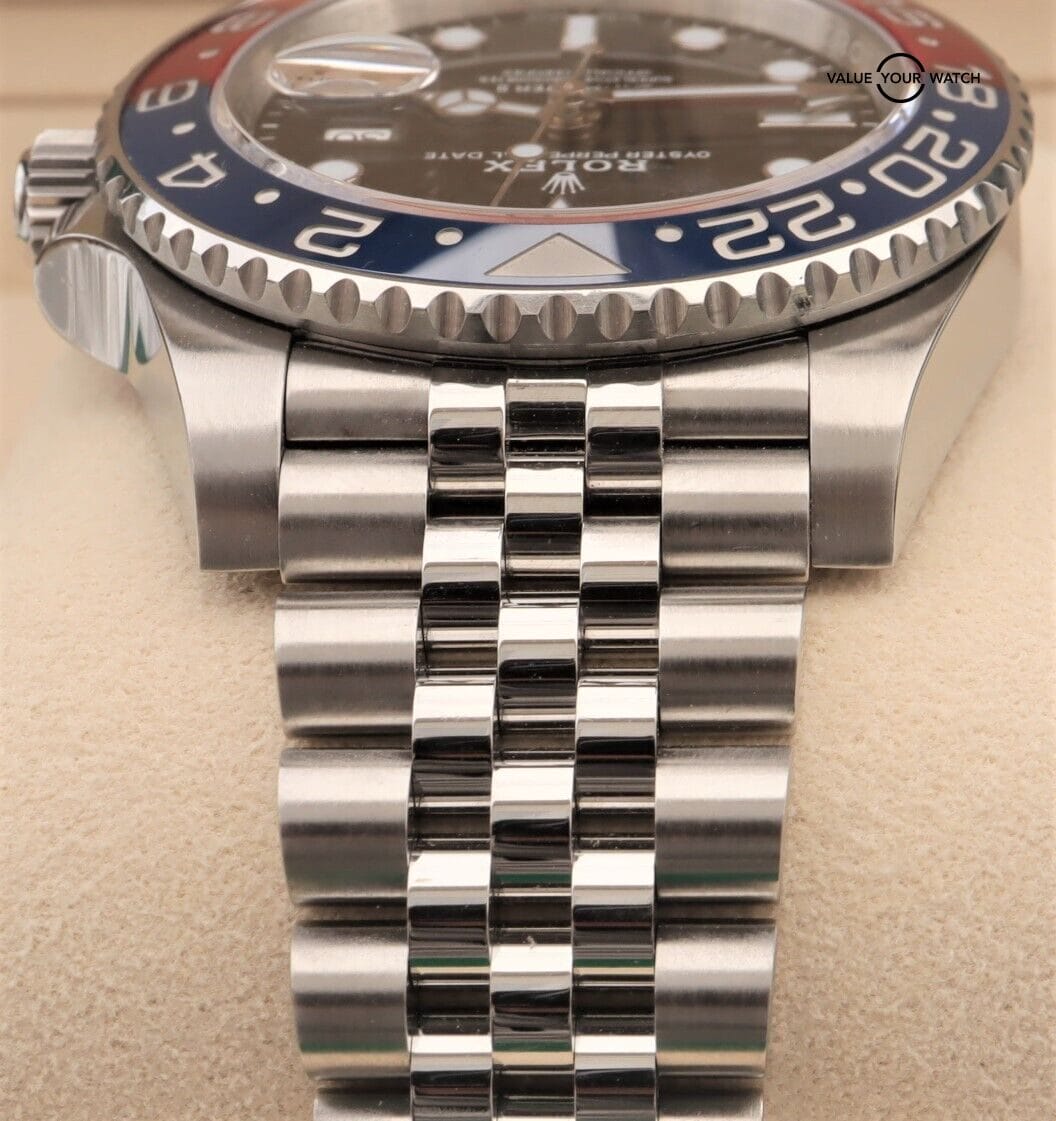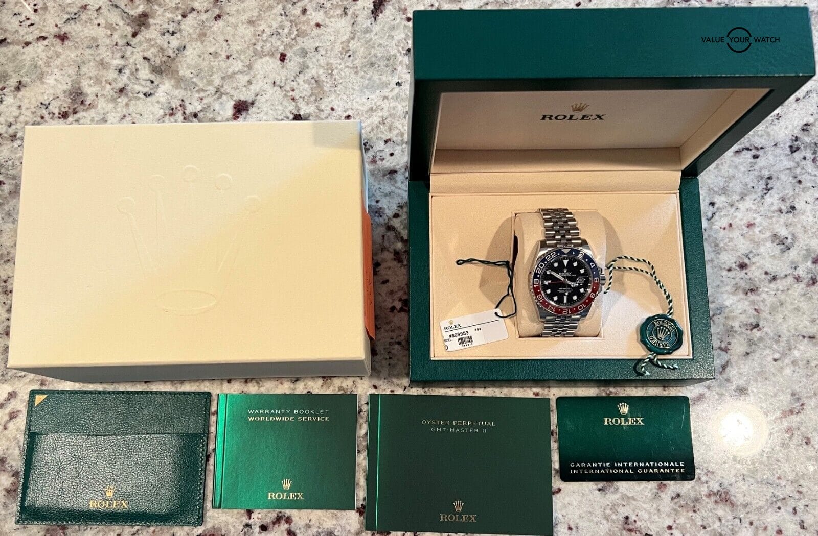 Rolex GMT Master II Pepsi Jubilee Bracelet 126710BLRO 2020 BOXES/PAPERS The beautiful timepiece comes with the outer cream box, inner green wave box, all booklets, both hangtags, and original warranty card (Dated July 2020). The watch is overall very clean. The crystal and ceramic bezel are both clean with no nicks or scratches. Mechanically the watch is functioning as it should. Serial numbers & names are blurred in photos only for privacy reasons. I am happy to answer all questions about the watch. Just reach out to me via messages. I have many references in the watch world and am happy to provide as many as needed. Feel free to search my username “thegolferguy” in the Rolex Forums under the “Who’s Who” section and see ample feedback.