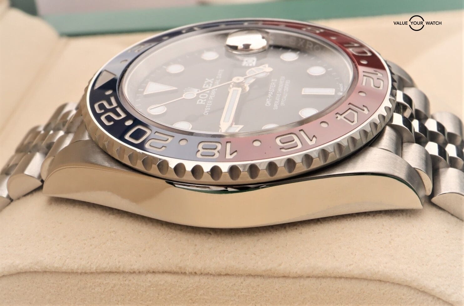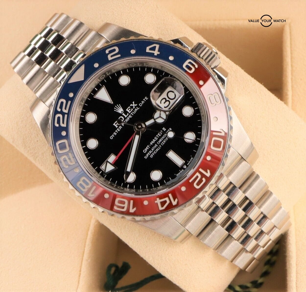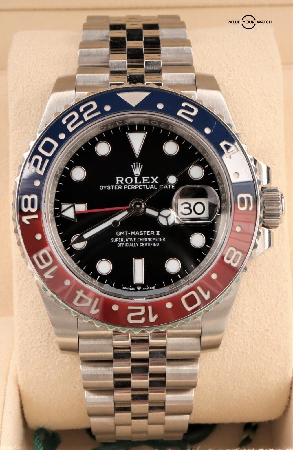 Rolex GMT Master II Pepsi Jubilee Bracelet 126710BLRO 2020 BOXES/PAPERS The beautiful timepiece comes with the outer cream box, inner green wave box, all booklets, both hangtags, and original warranty card (Dated July 2020). The watch is overall very clean. The crystal and ceramic bezel are both clean with no nicks or scratches. Mechanically the watch is functioning as it should. Serial numbers & names are blurred in photos only for privacy reasons. I am happy to answer all questions about the watch. Just reach out to me via messages. I have many references in the watch world and am happy to provide as many as needed. Feel free to search my username “thegolferguy” in the Rolex Forums under the “Who’s Who” section and see ample feedback.