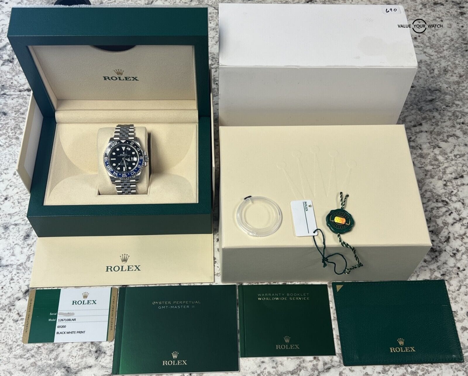 This set comes complete with the outer white sleeve, outer cream box, inner green wave box, all booklets, all links, both hangtags, bezel protector, and original warranty card (Dated in November 2019). The timepiece is in nice pre-owned condition with just light cosmetic wear throughout. If you are reading this AD you know the rarity of this piece. Pay close attention to the pictures as they accurately describe the condition. Mechanically the watch is functioning as it should. Serial numbers and names are blurred in photos only for privacy reasons.