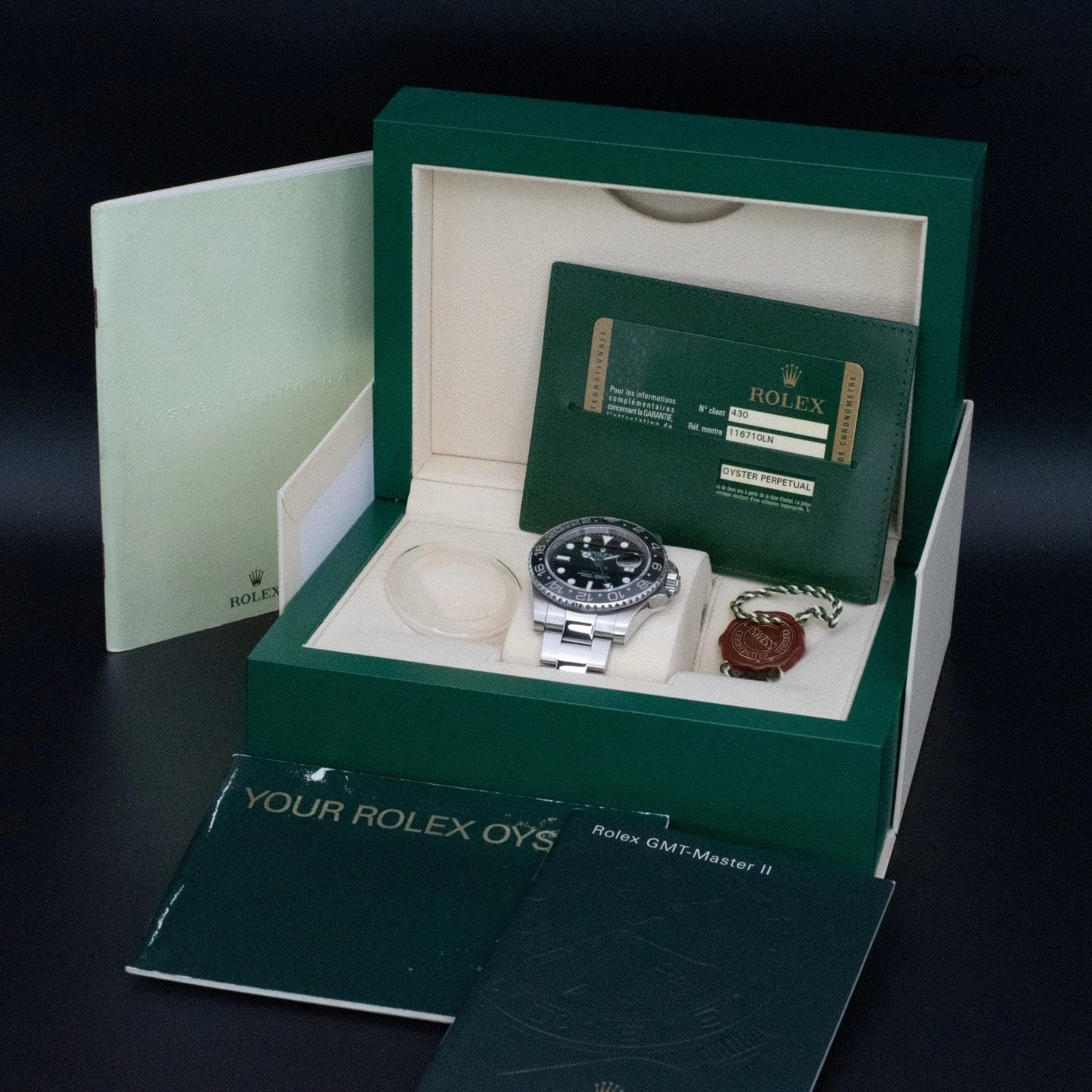 Contents: Rolex box, booklets, bezel protector, red hang tag and 2009 warranty card.