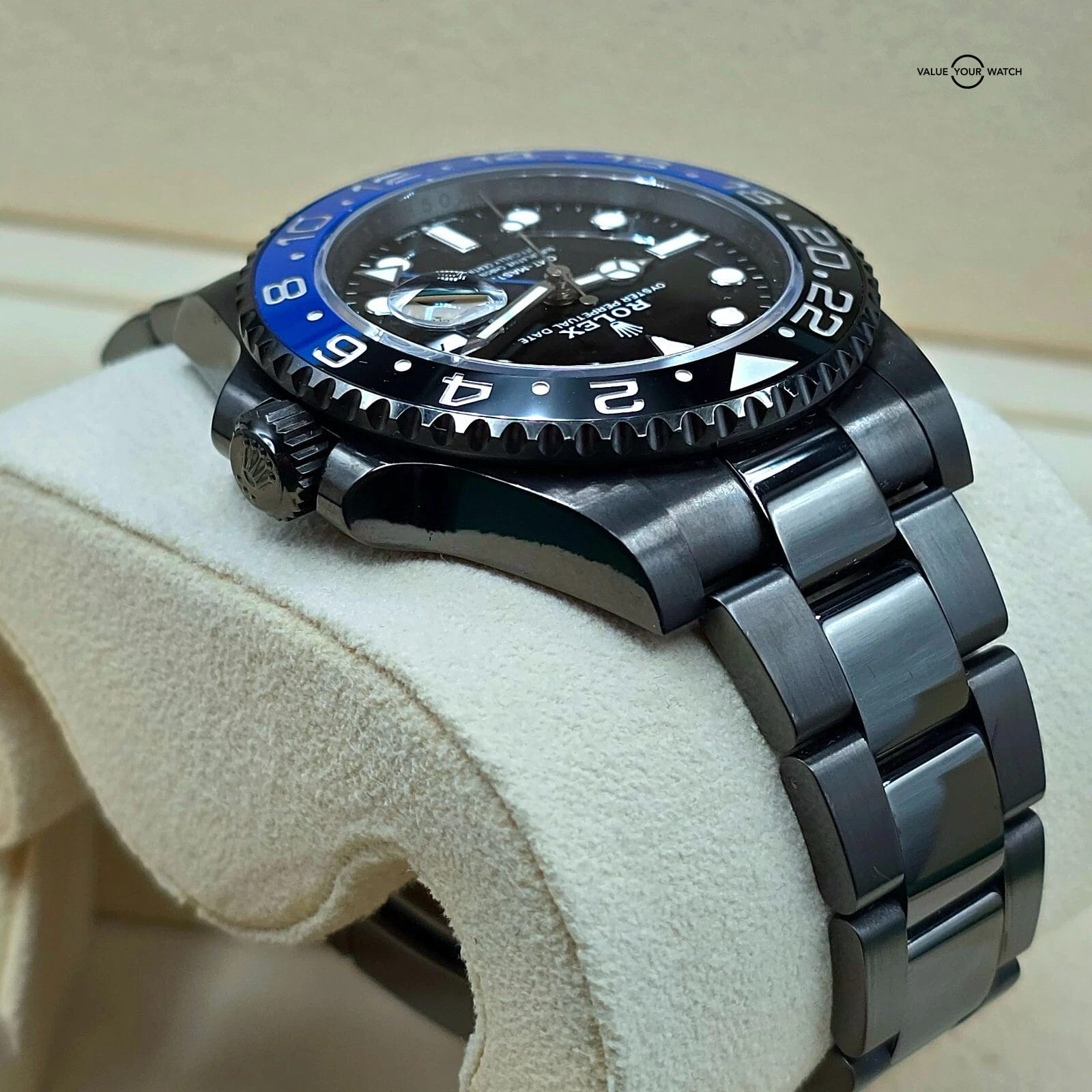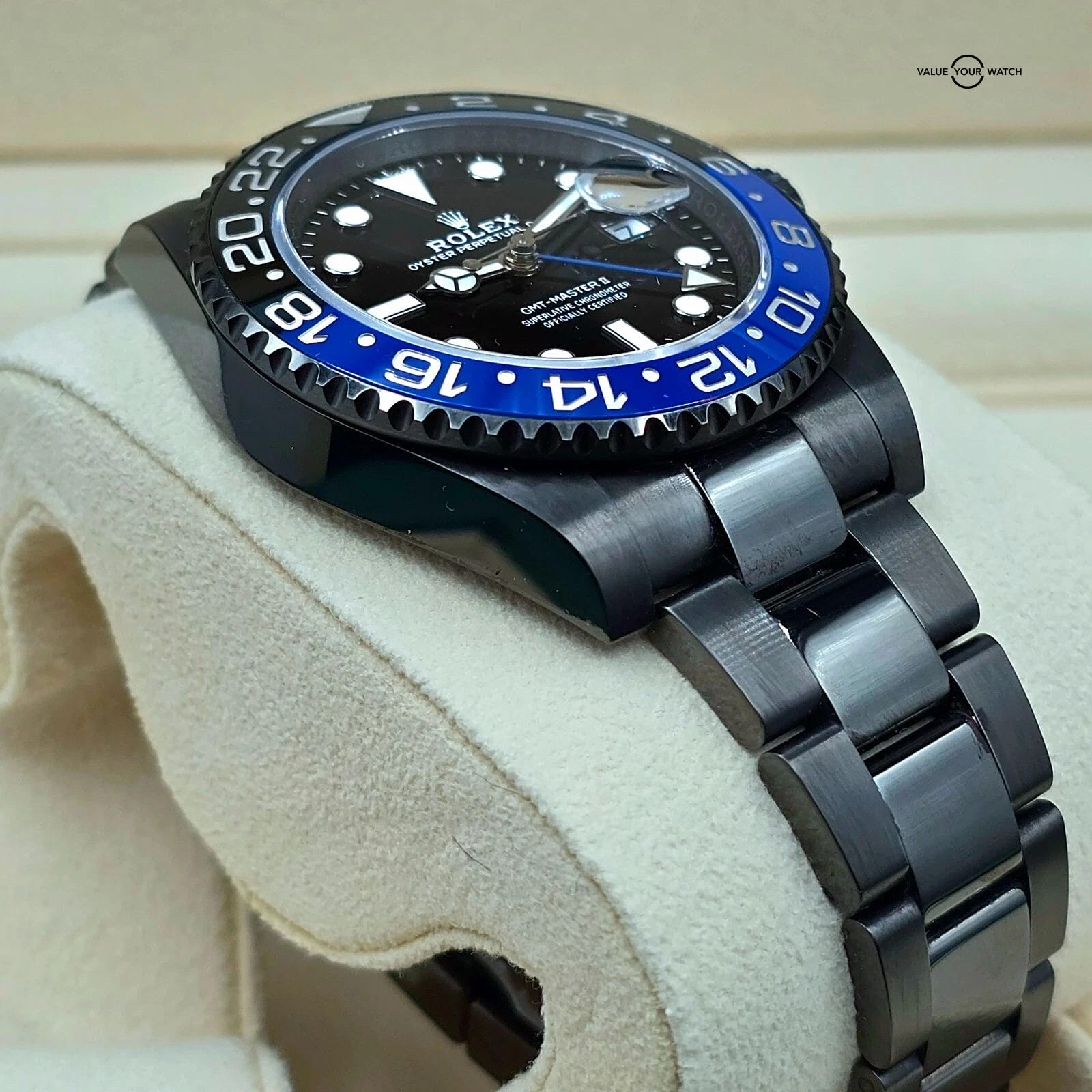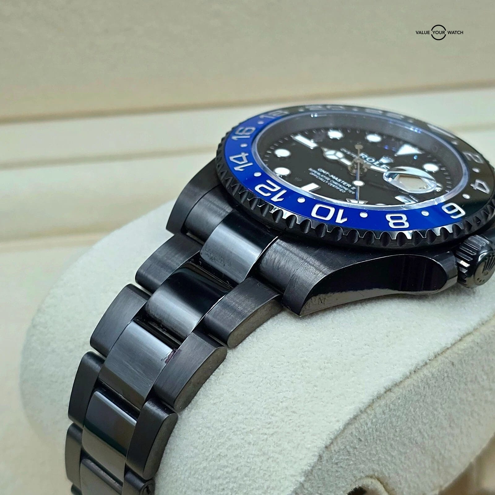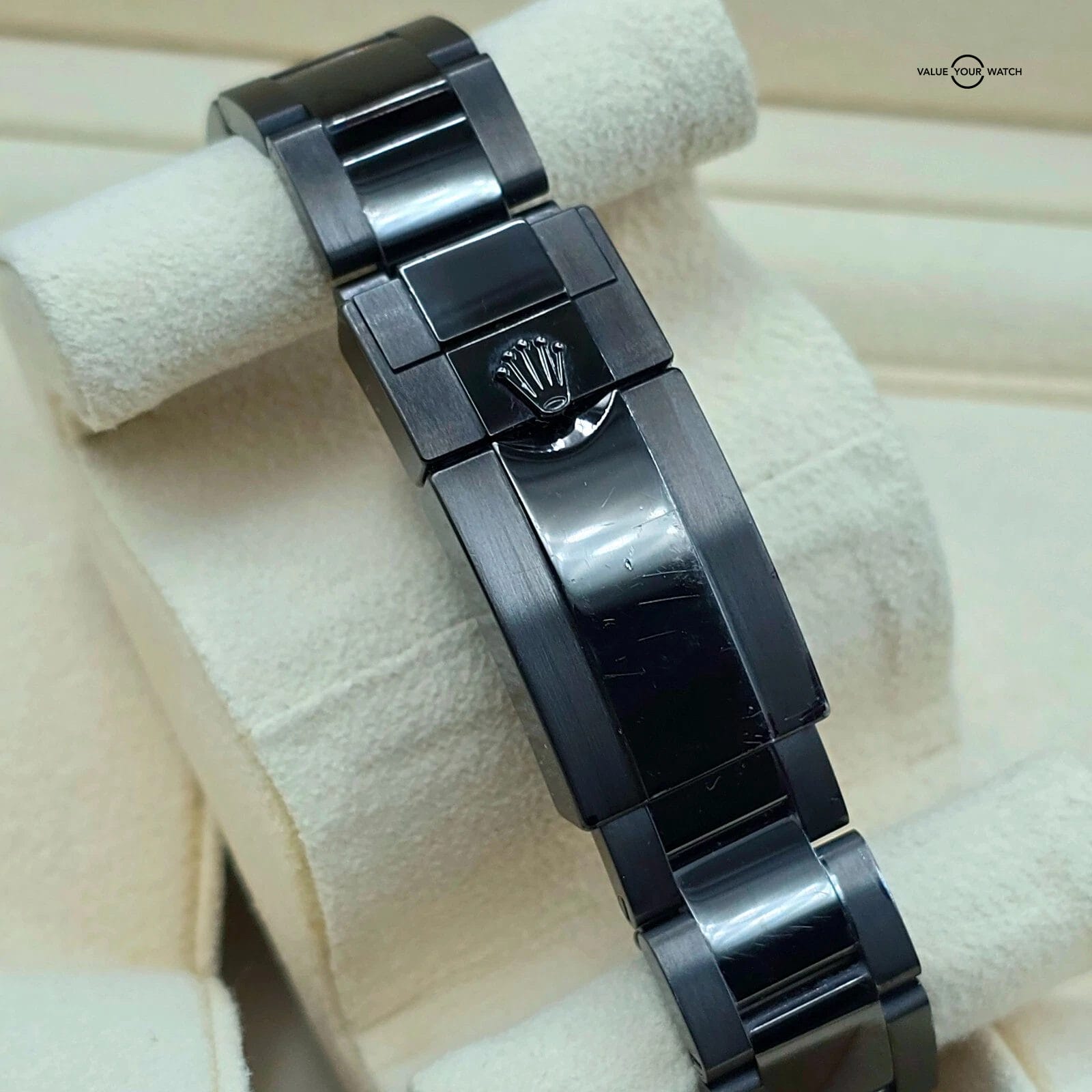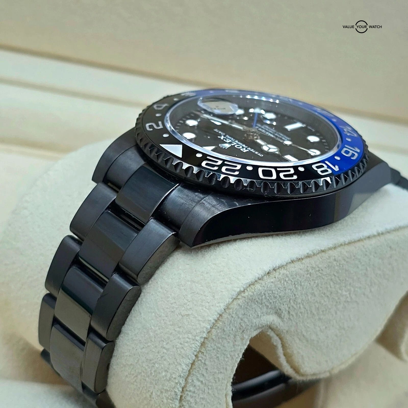 One of the better ideas for customization of a modern Rolex that I’ve seen- it’s simple, not at all common, and yet still carries all the greatness of the regular Batman.The watch has been worn, and the PVD coating is not perfect. “High traffic” areas like the clasp do have some marks.