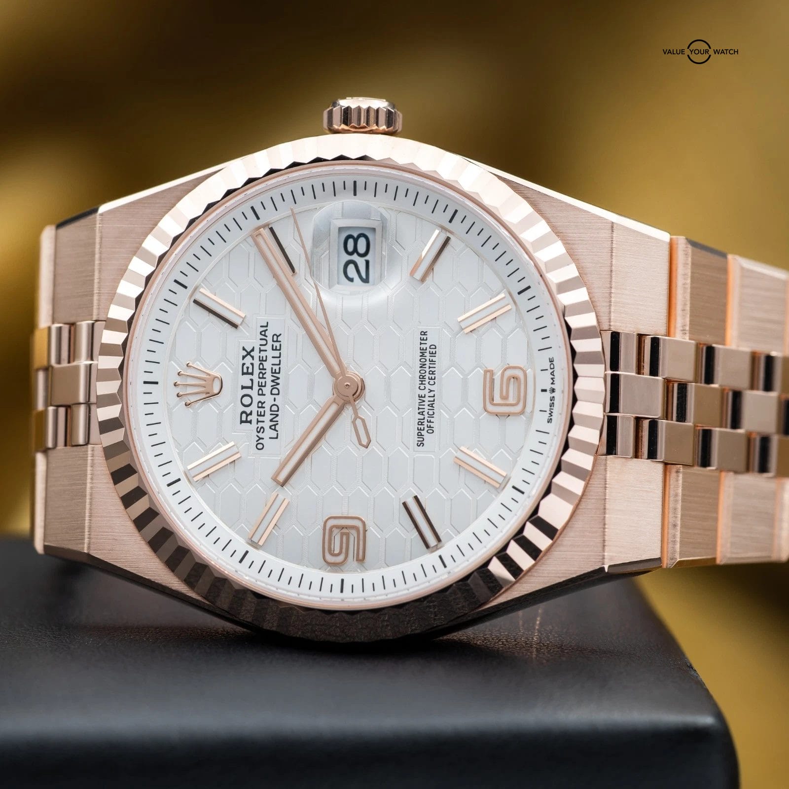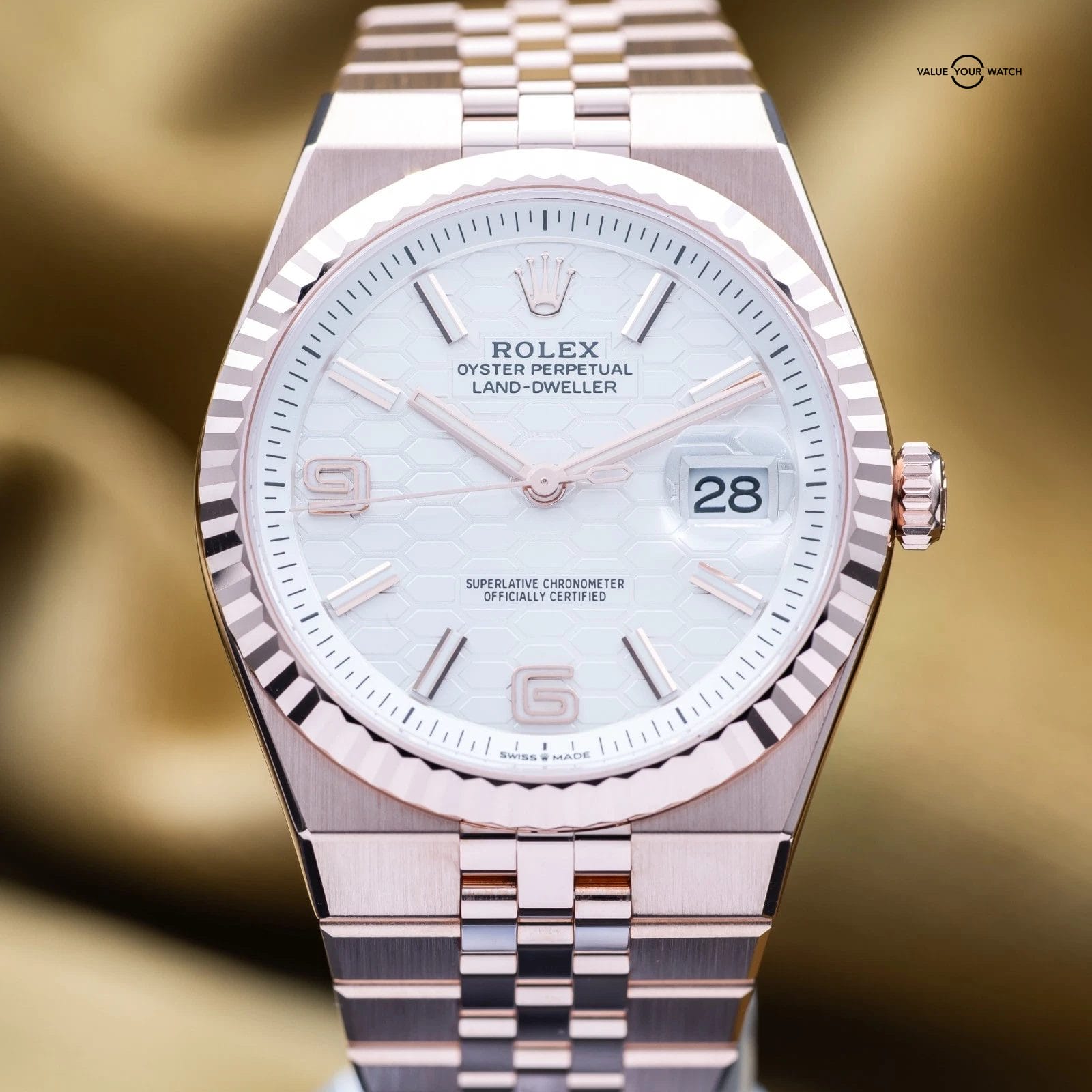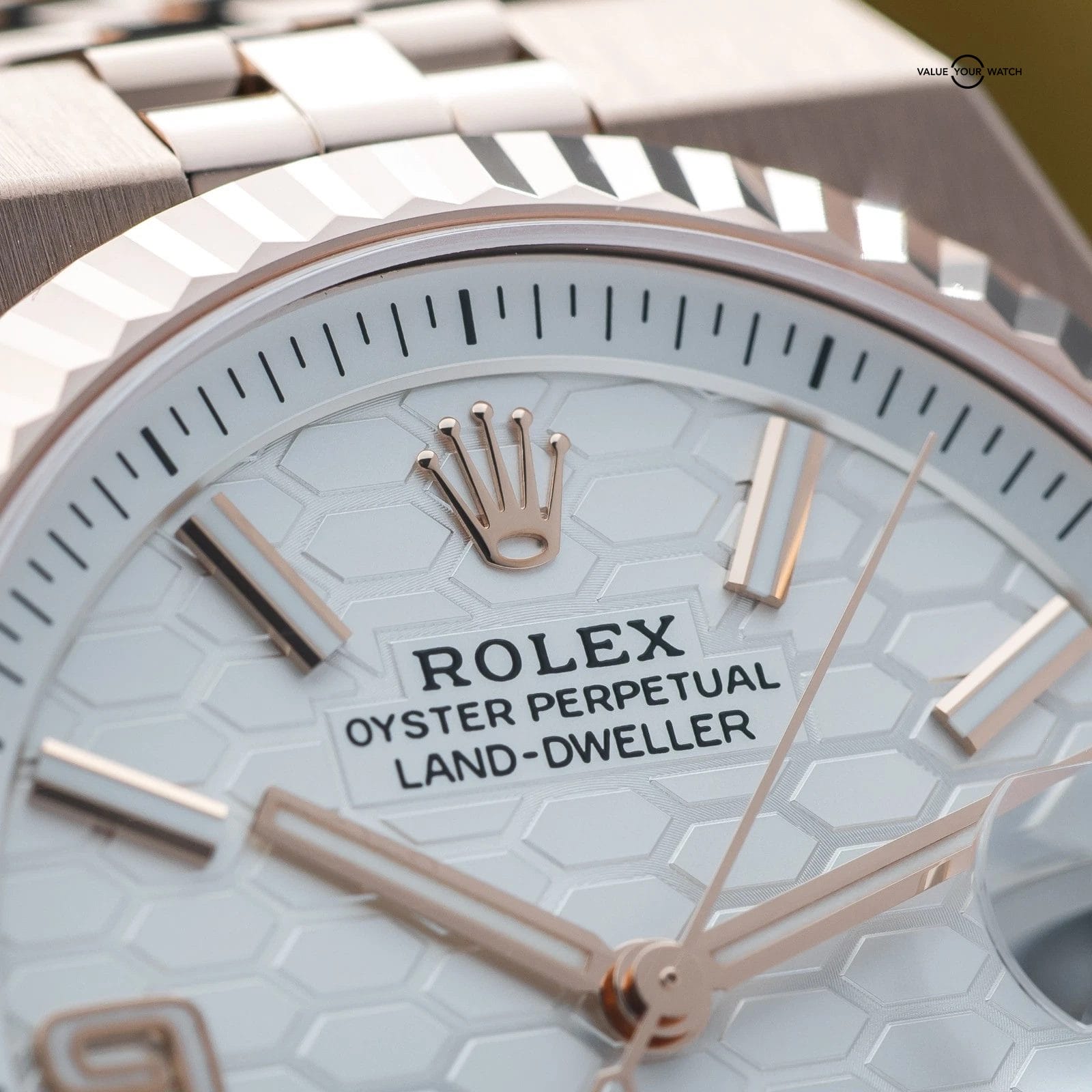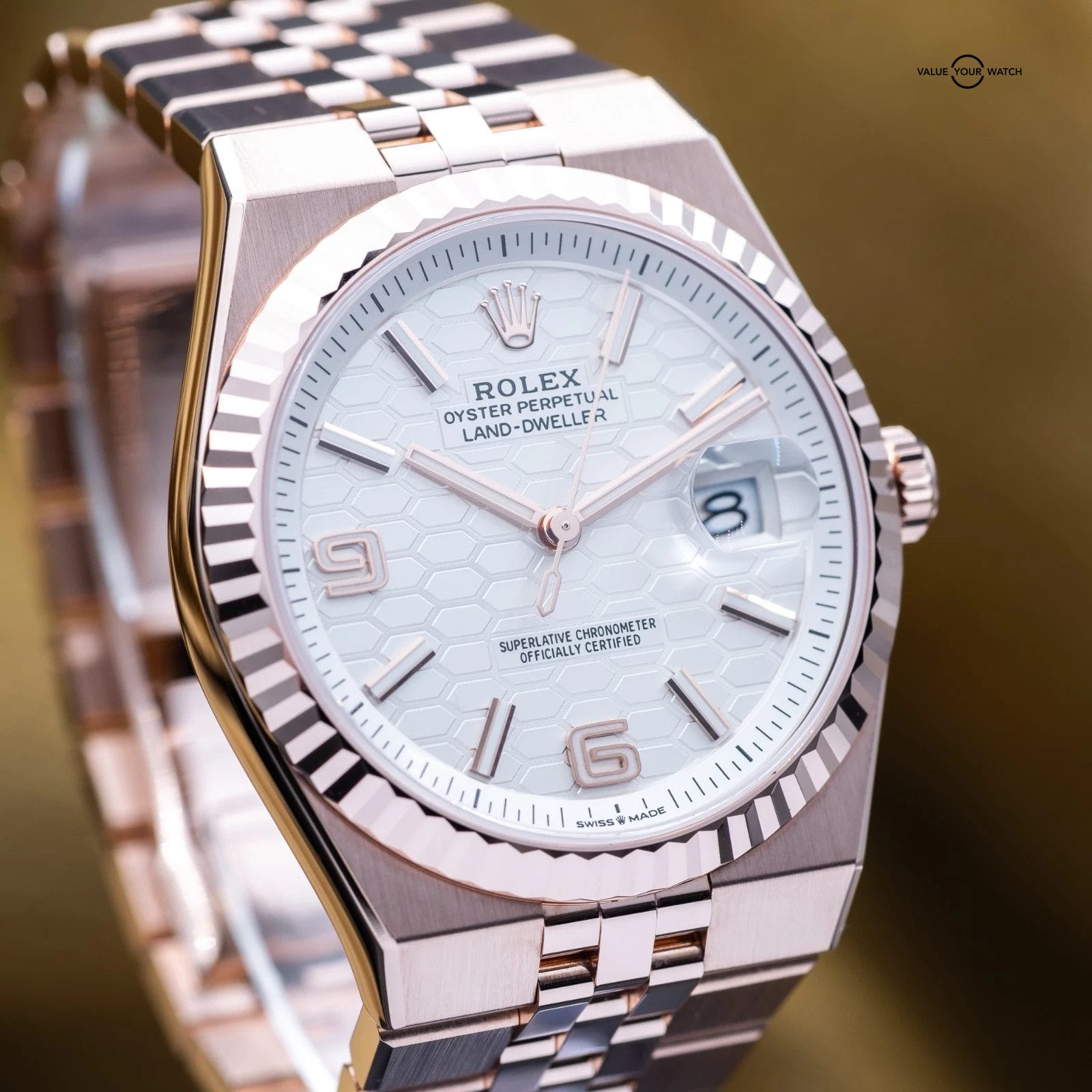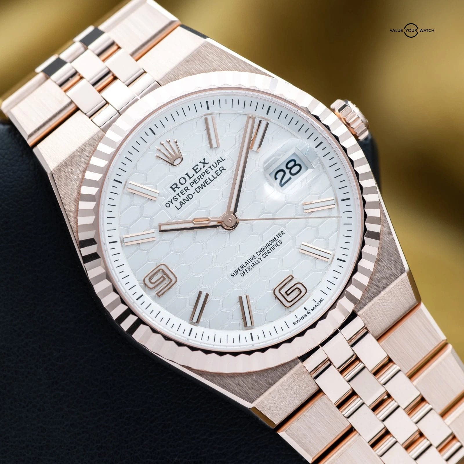 The Land‑Dweller is one of Rolex’s most talked-about recent releases, representing a fresh chapter for the brand. This brand new piece from January 2026 has a 40mm full Everose case with a fluted bezel and a striking white honeycomb dial that gives it a fresh, modern look. The new Flat Jubilee bracelet sits super comfortably and makes the watch feel sleek on the wrist, something a bit more contemporary. Inside, it’s powered by Rolex’s new-generation movement, so it’s every bit as solid and precise as you’d expect. The Land-Dweller stands out in Rolex’s lineup for its unique design cues and fresh energy, making it a great choice if you want something a bit different but unmistakably Rolex.