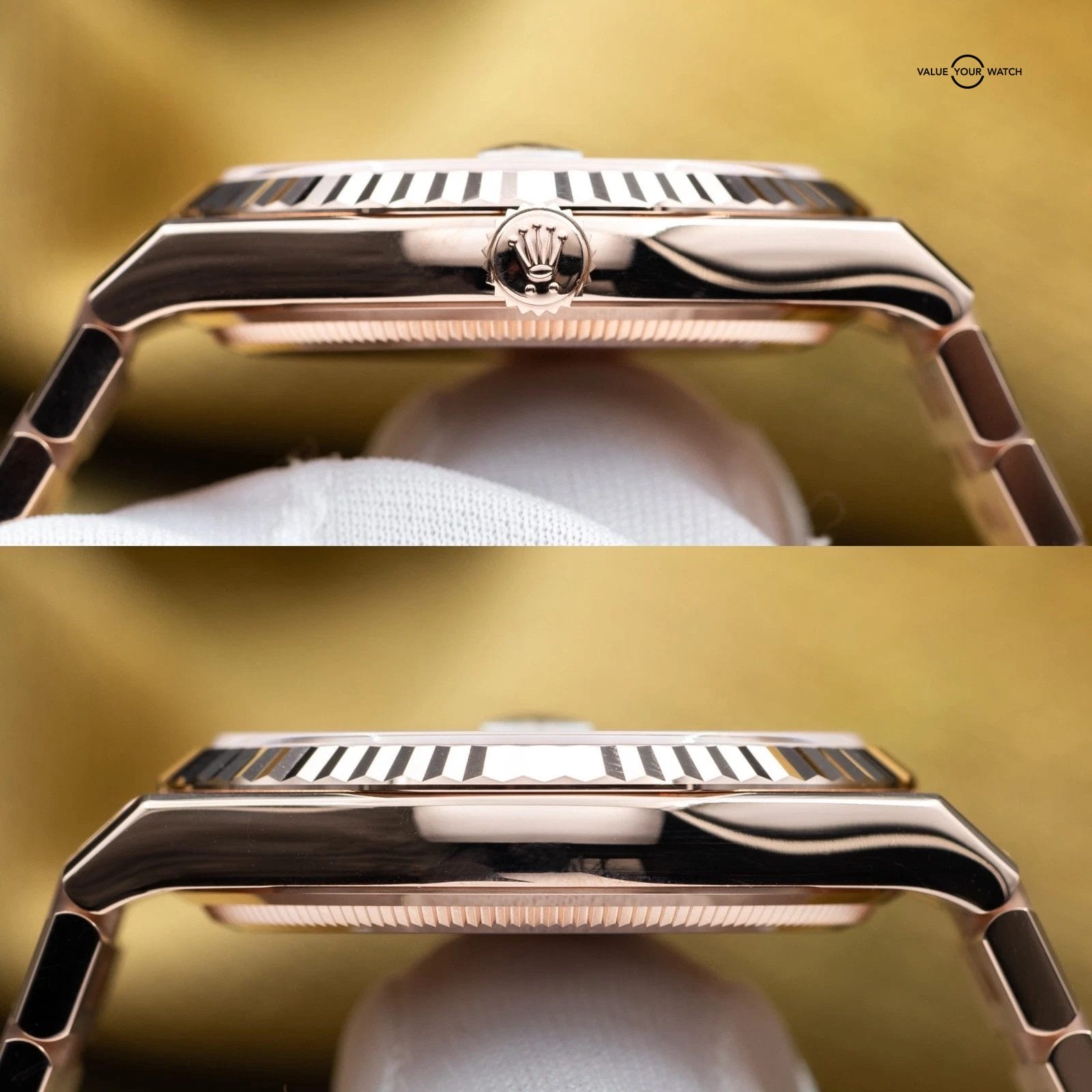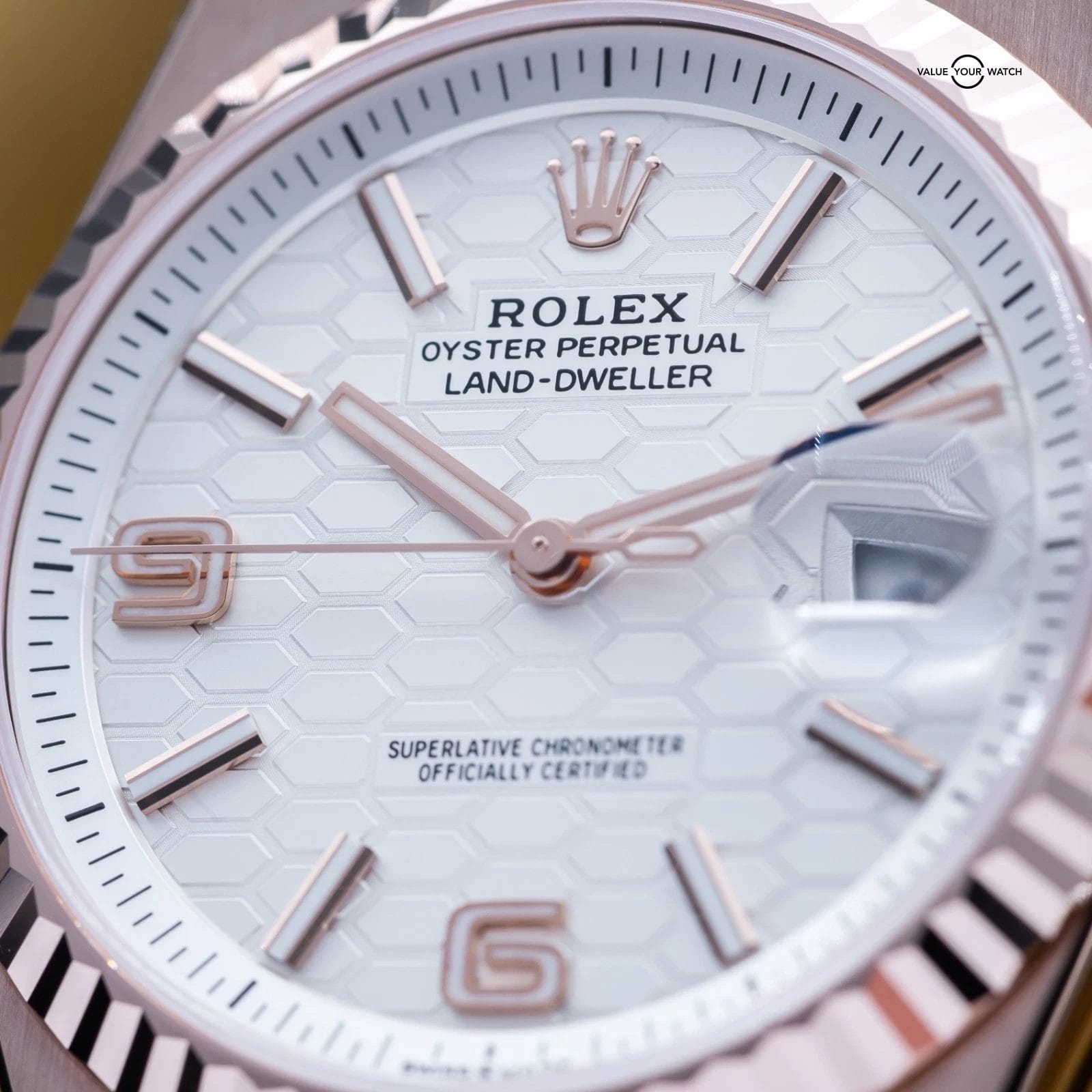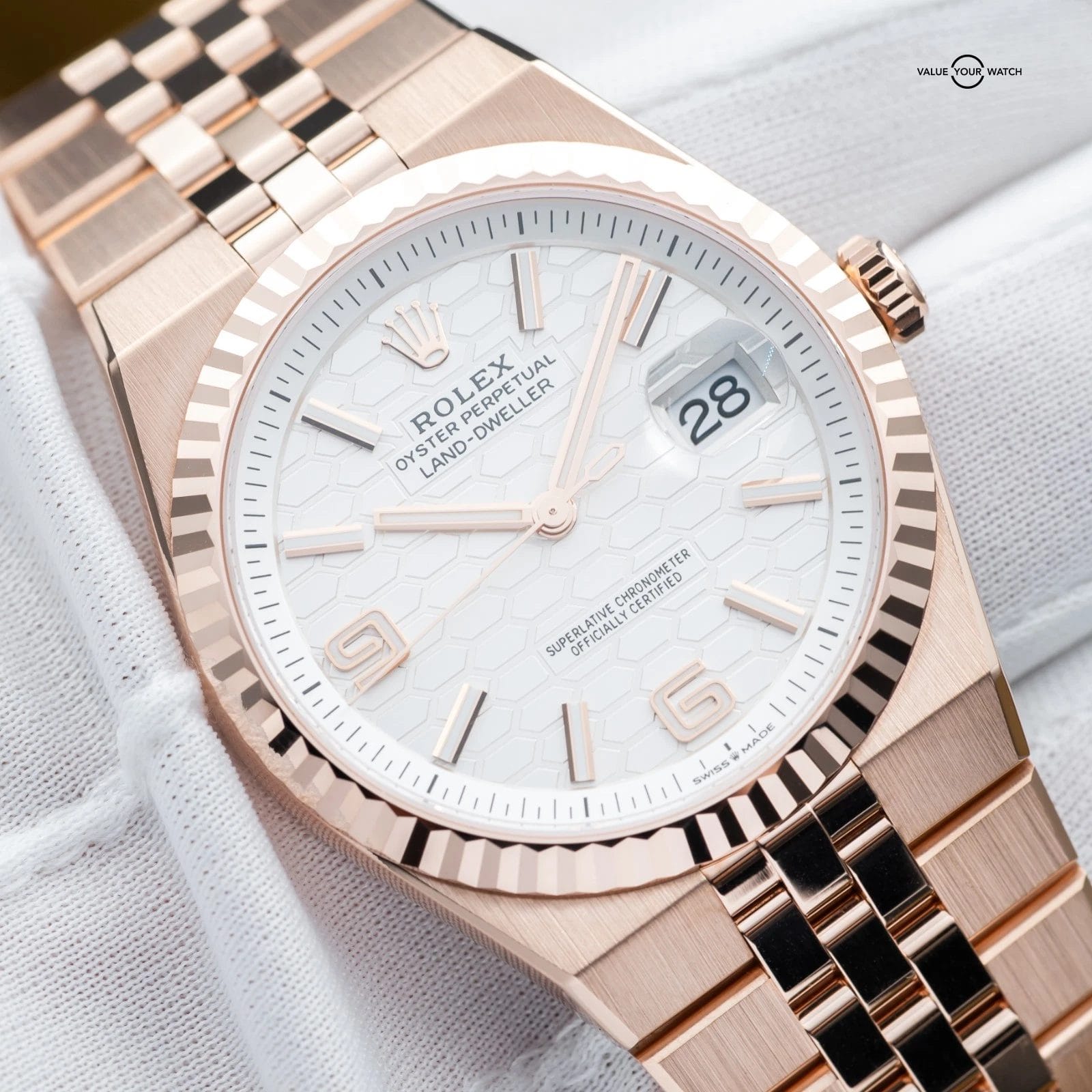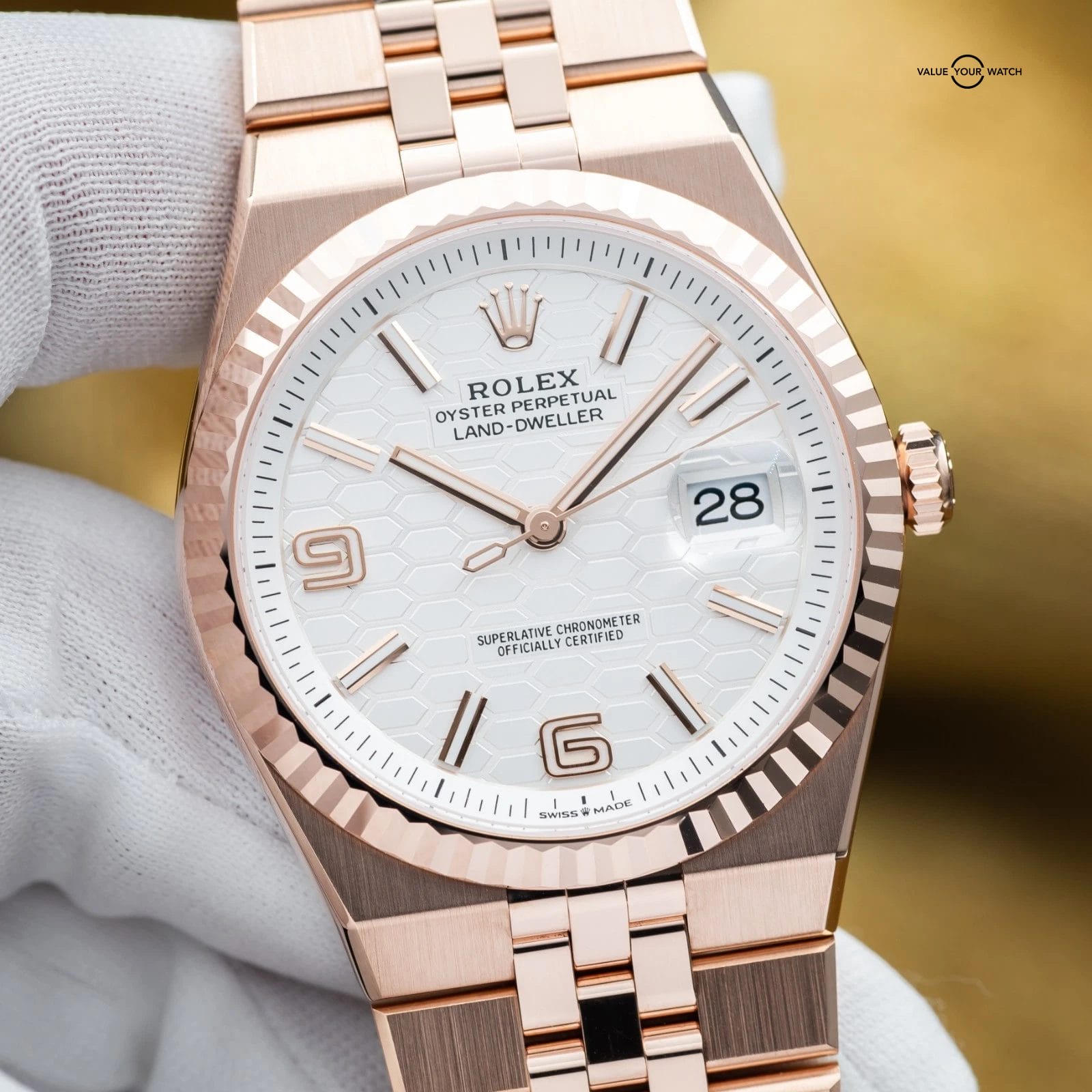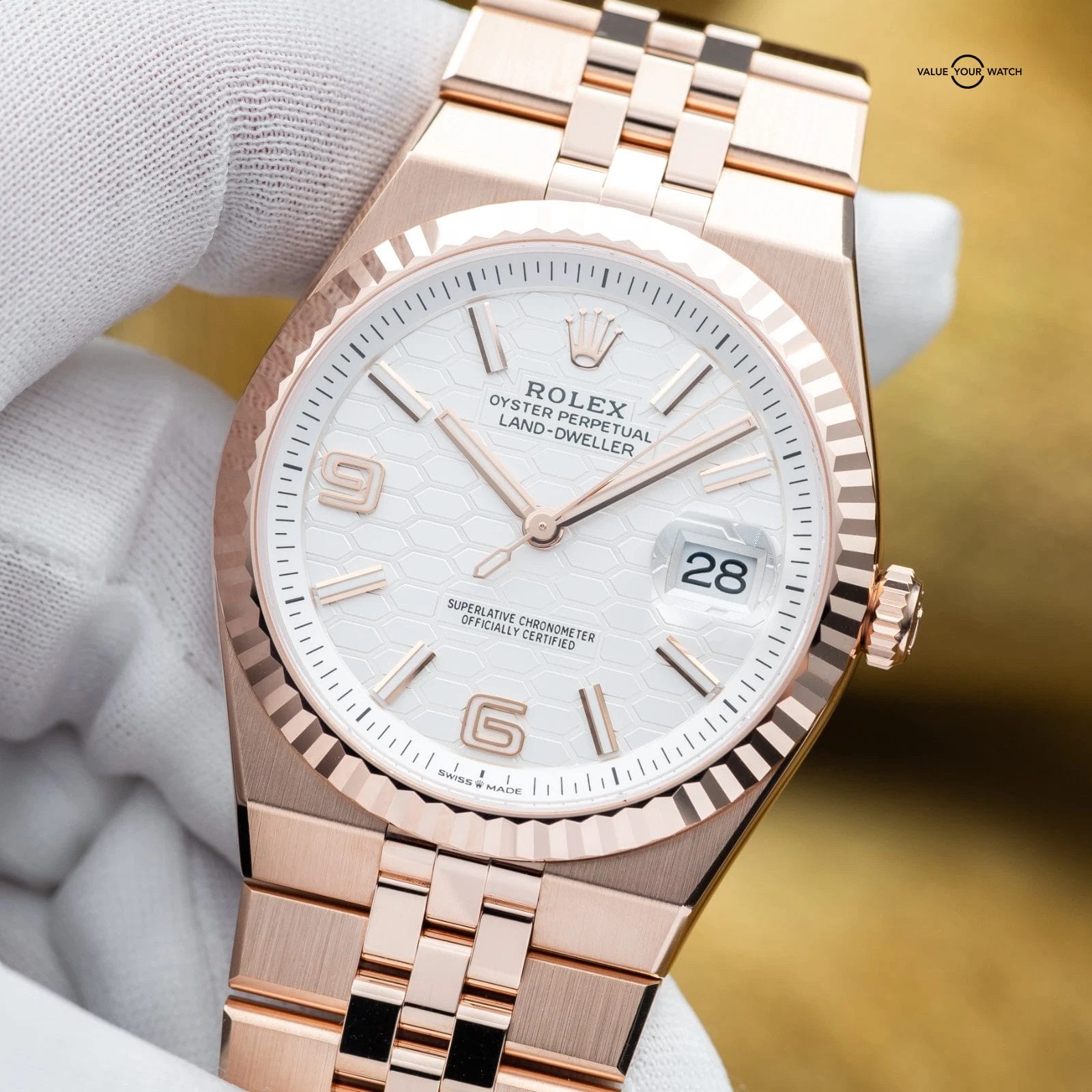 The Land‑Dweller is one of Rolex’s most talked-about recent releases, representing a fresh chapter for the brand. This brand new piece from January 2026 has a 40mm full Everose case with a fluted bezel and a striking white honeycomb dial that gives it a fresh, modern look. The new Flat Jubilee bracelet sits super comfortably and makes the watch feel sleek on the wrist, something a bit more contemporary. Inside, it’s powered by Rolex’s new-generation movement, so it’s every bit as solid and precise as you’d expect. The Land-Dweller stands out in Rolex’s lineup for its unique design cues and fresh energy, making it a great choice if you want something a bit different but unmistakably Rolex.