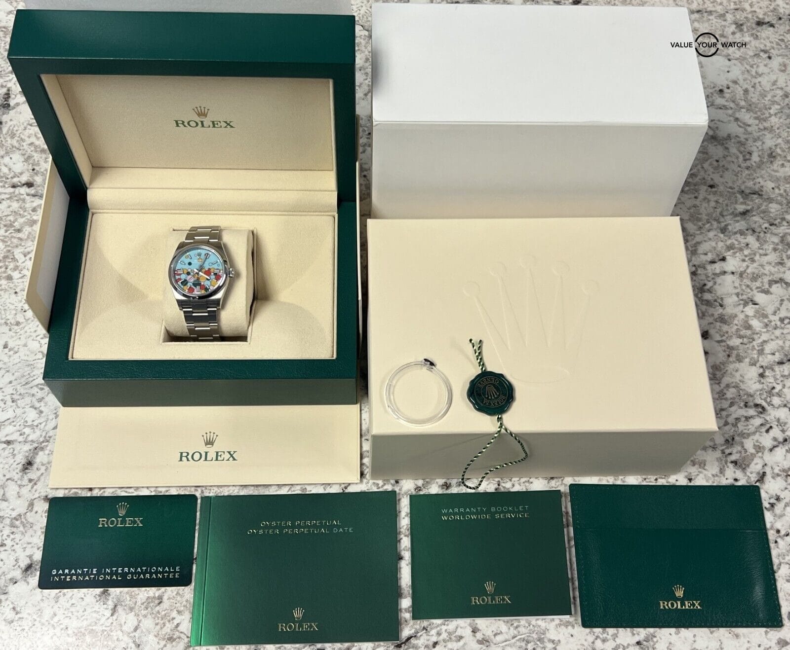 This set comes complete with the outer white sleeve, outer cream box, inner green wave box, all booklets, all links, bezel cover, green hangtag, and original warranty card (Dated in February 2022). The timepiece is in excellent pre-owned condition with just typical light cosmetic wear. If you are reading this AD you know the rarity of this piece. Pay close attention to the pictures as they accurately describe the condition. Mechanically the watch is functioning as it should. Serial numbers and names are blurred in photos only for privacy reasons.