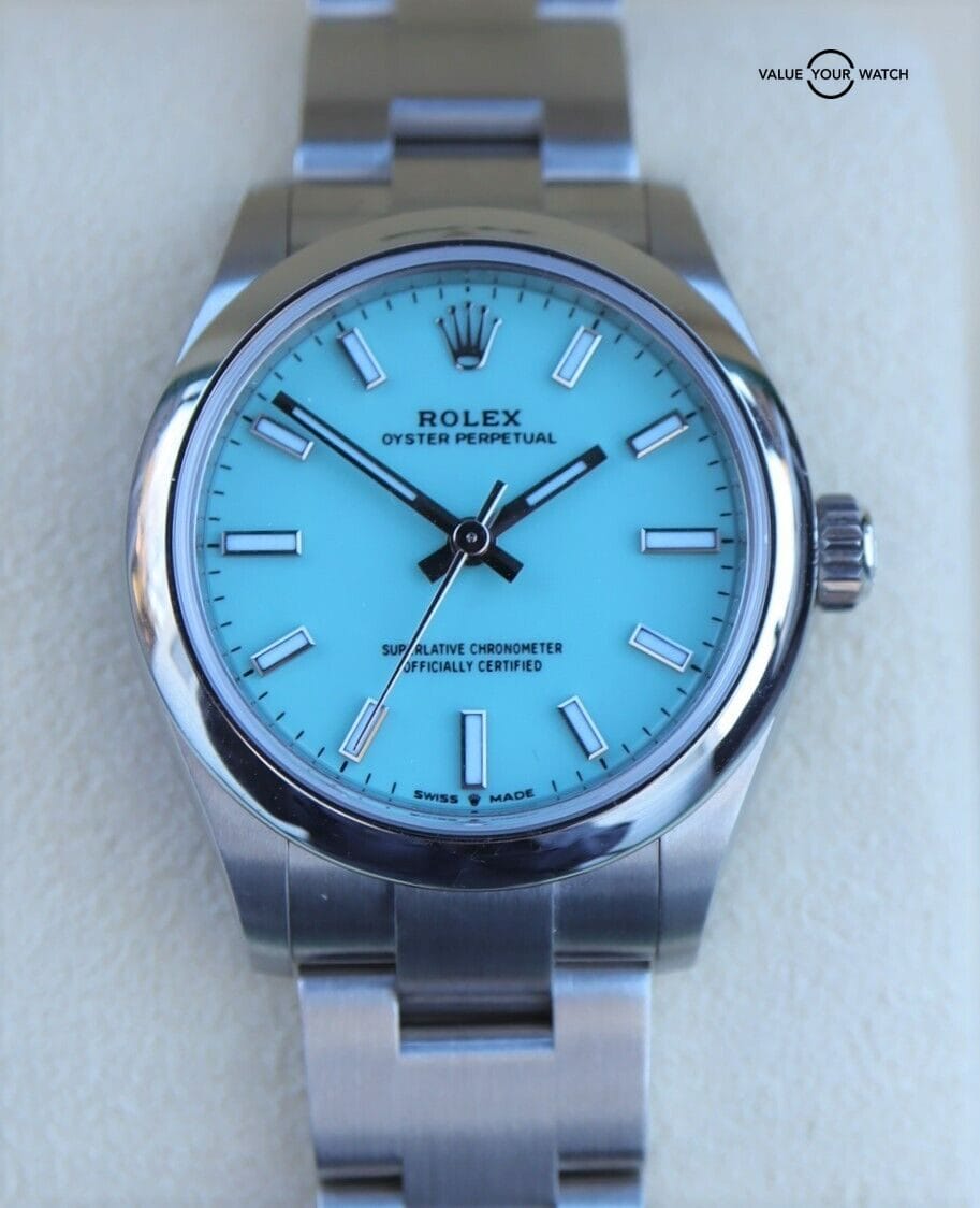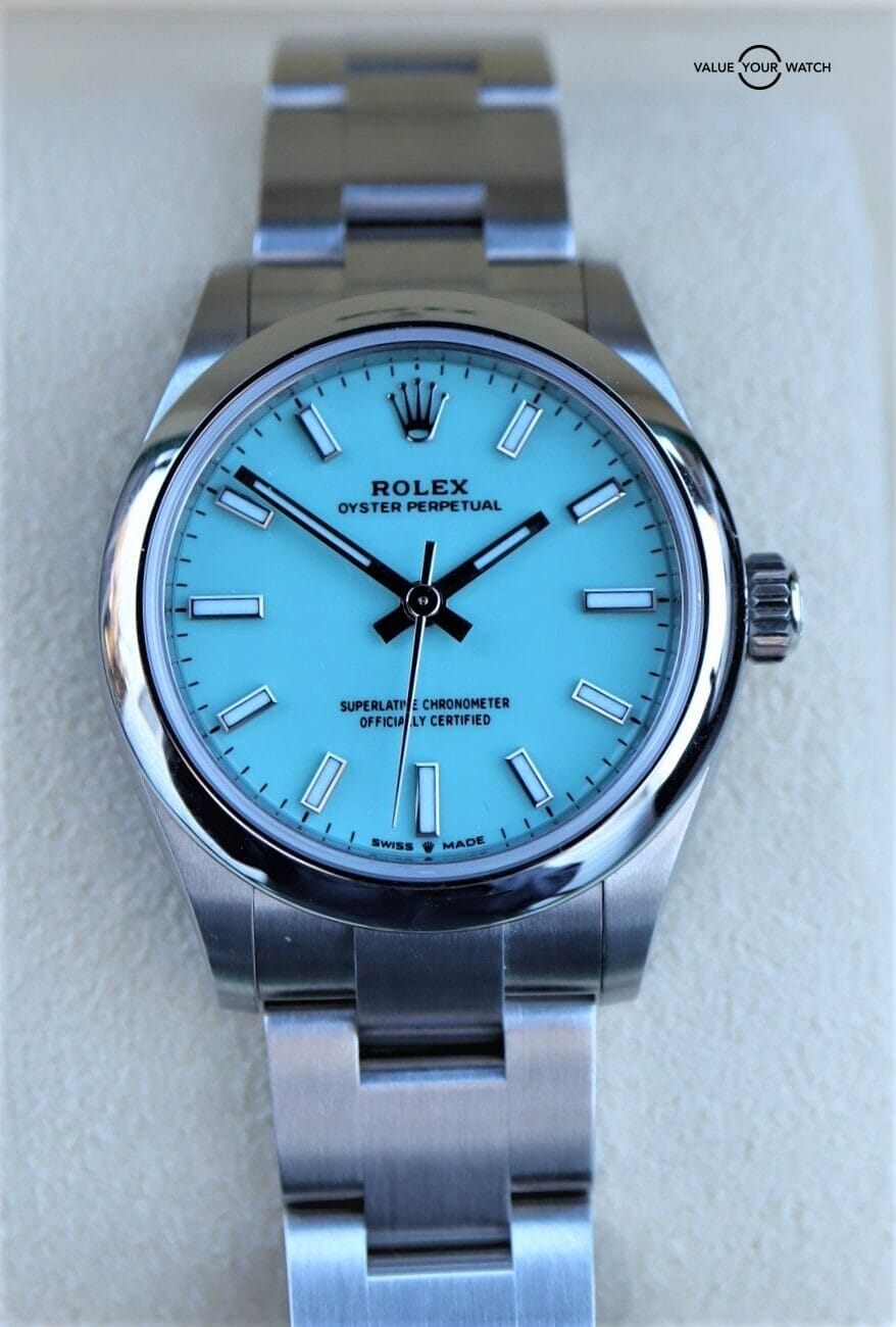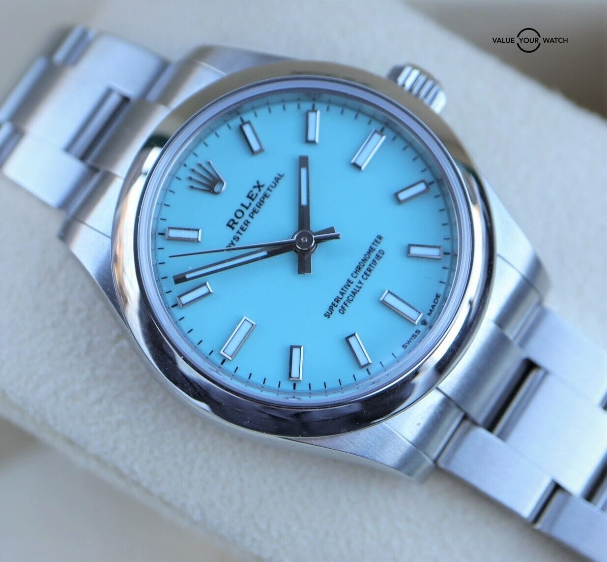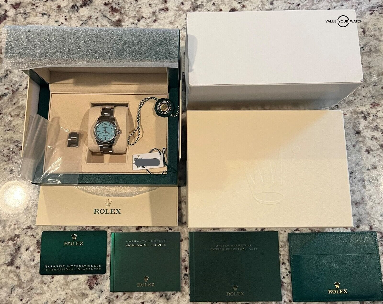 NEW Rolex 277200 31mm Tiffany Blue Dial 2022 BOXES/PAPERS This timepiece comes brand new. Comes with the outer white sleeve, outer cream box, and the inner green wave box, instruction manuals, warranty manuals, warranty card (Dated January 2021) and green and white serial hangtag. The watch was sized at the time of purchase. It comes with the beautiful Turquoise blue (AKA Tiffany) dial. Mechanically the watch is functioning as it should. Serial numbers & names are blurred in photos only for privacy reasons. I am happy to answer all questions about the watch. Just reach out to me via messages. I have many references in the watch world and am happy to provide as many as needed. Feel free to search my username “thegolferguy” in the Rolex Forums under the “Who’s Who” section and see ample feedback.