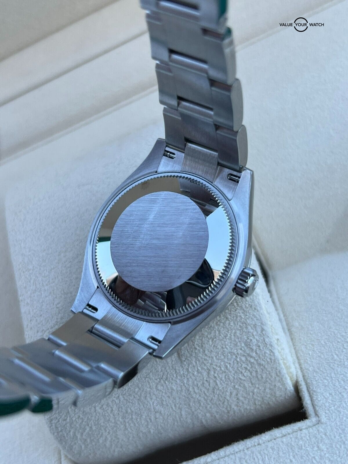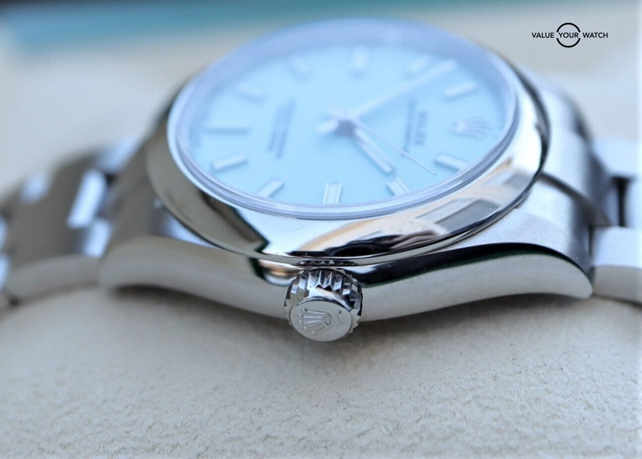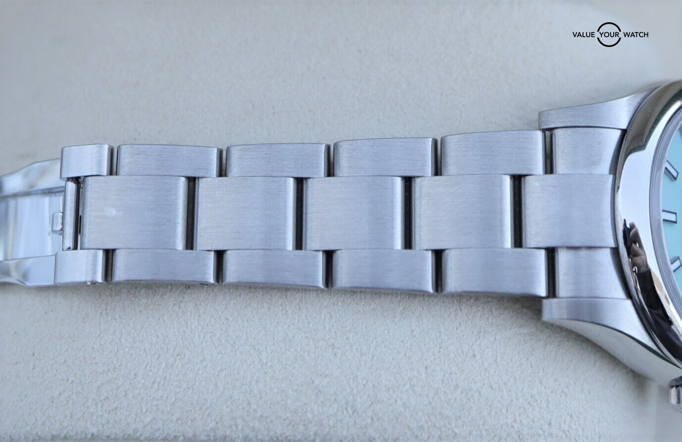 NEW Rolex 277200 31mm Tiffany Blue Dial 2022 BOXES/PAPERS This timepiece comes brand new. Comes with the outer white sleeve, outer cream box, and the inner green wave box, instruction manuals, warranty manuals, warranty card (Dated January 2021) and green and white serial hangtag. The watch was sized at the time of purchase. It comes with the beautiful Turquoise blue (AKA Tiffany) dial. Mechanically the watch is functioning as it should. Serial numbers & names are blurred in photos only for privacy reasons. I am happy to answer all questions about the watch. Just reach out to me via messages. I have many references in the watch world and am happy to provide as many as needed. Feel free to search my username “thegolferguy” in the Rolex Forums under the “Who’s Who” section and see ample feedback.