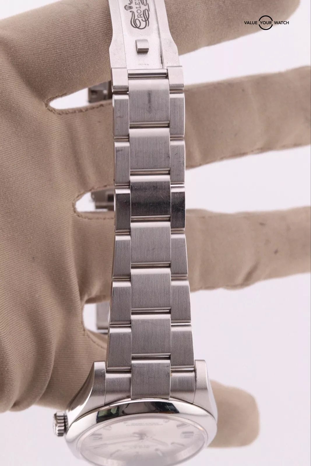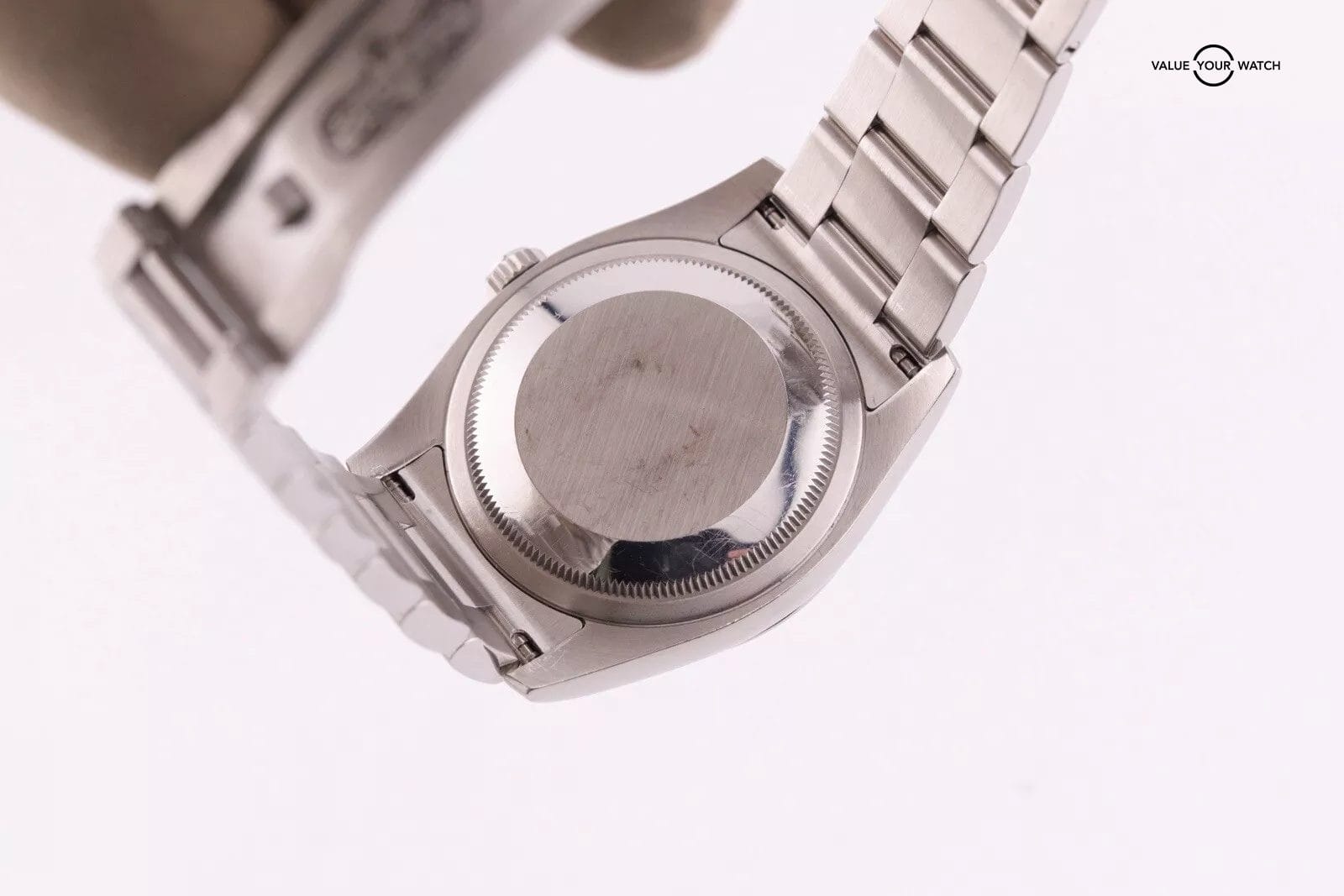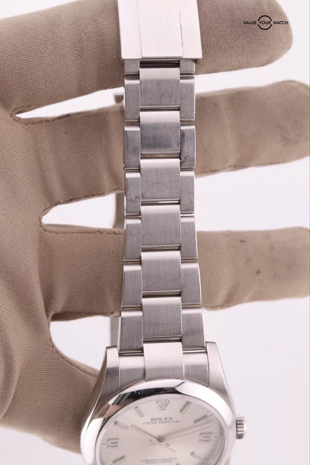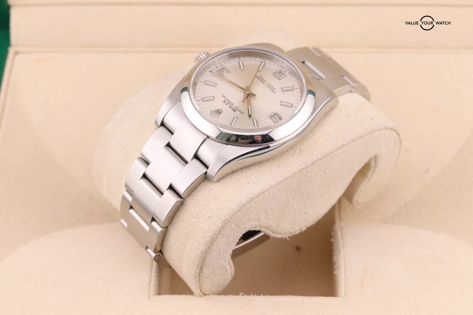 This example has a silver dial with lumed hour markers. The dial is clean from any damage. The crystal has a couple of hairline scratches that are hard to make out against the starburst dial. The case/bracelet are in overall great preowned condition with no major flaws that wouldn’t polish out. One of the links in the bracelet has a more polished finish that is a bit more obvious in photos than in person. Can easily be fixed with refinishing.