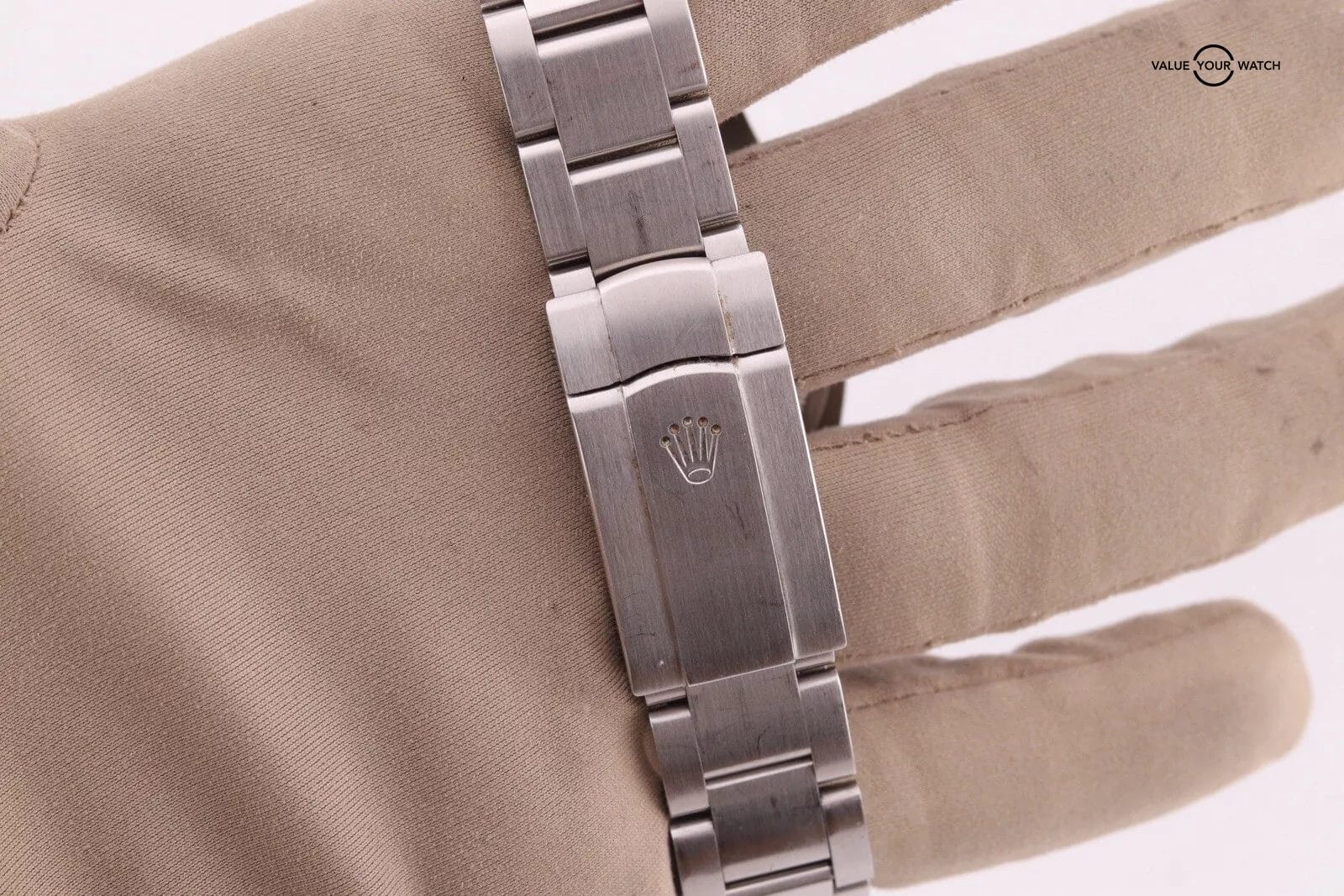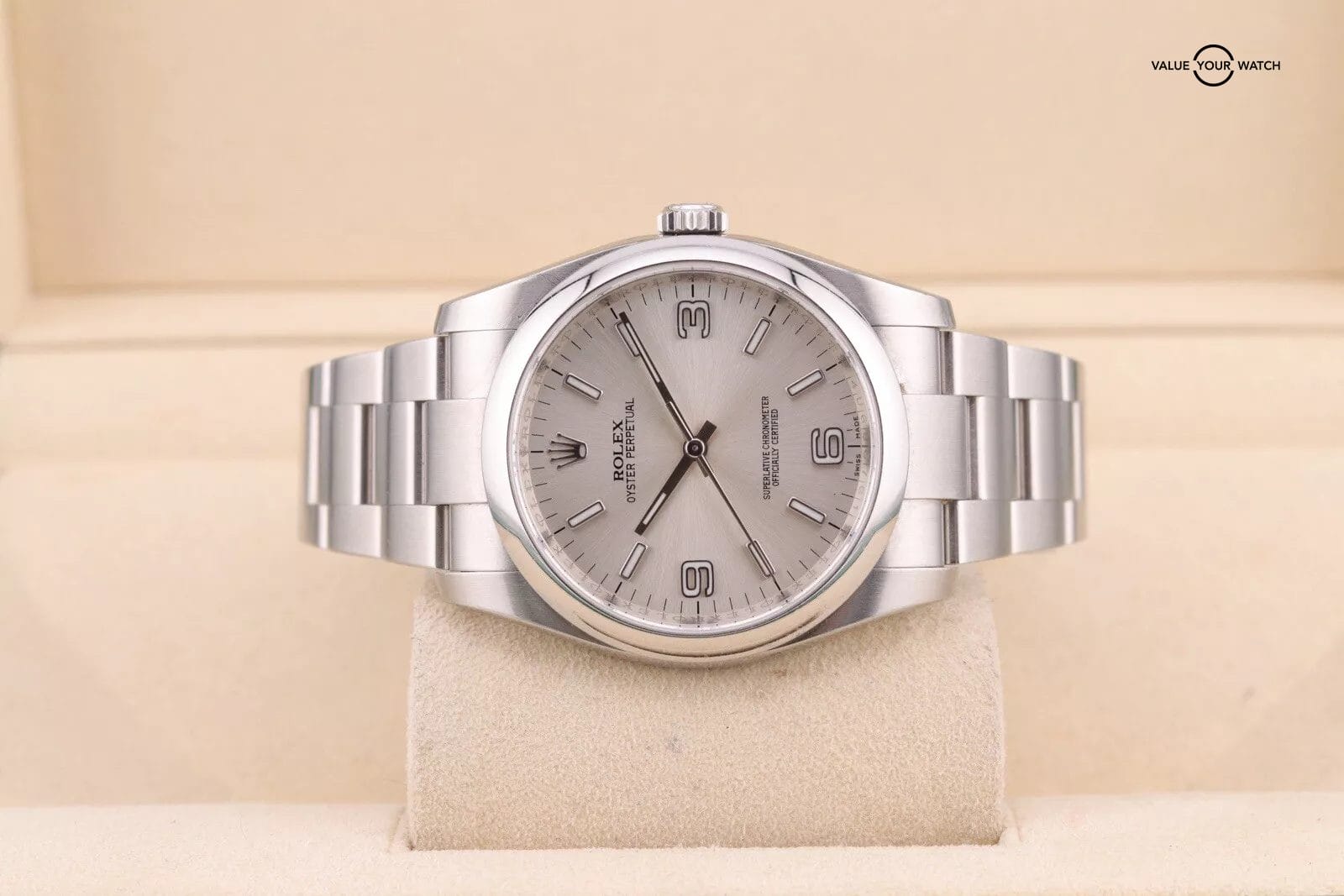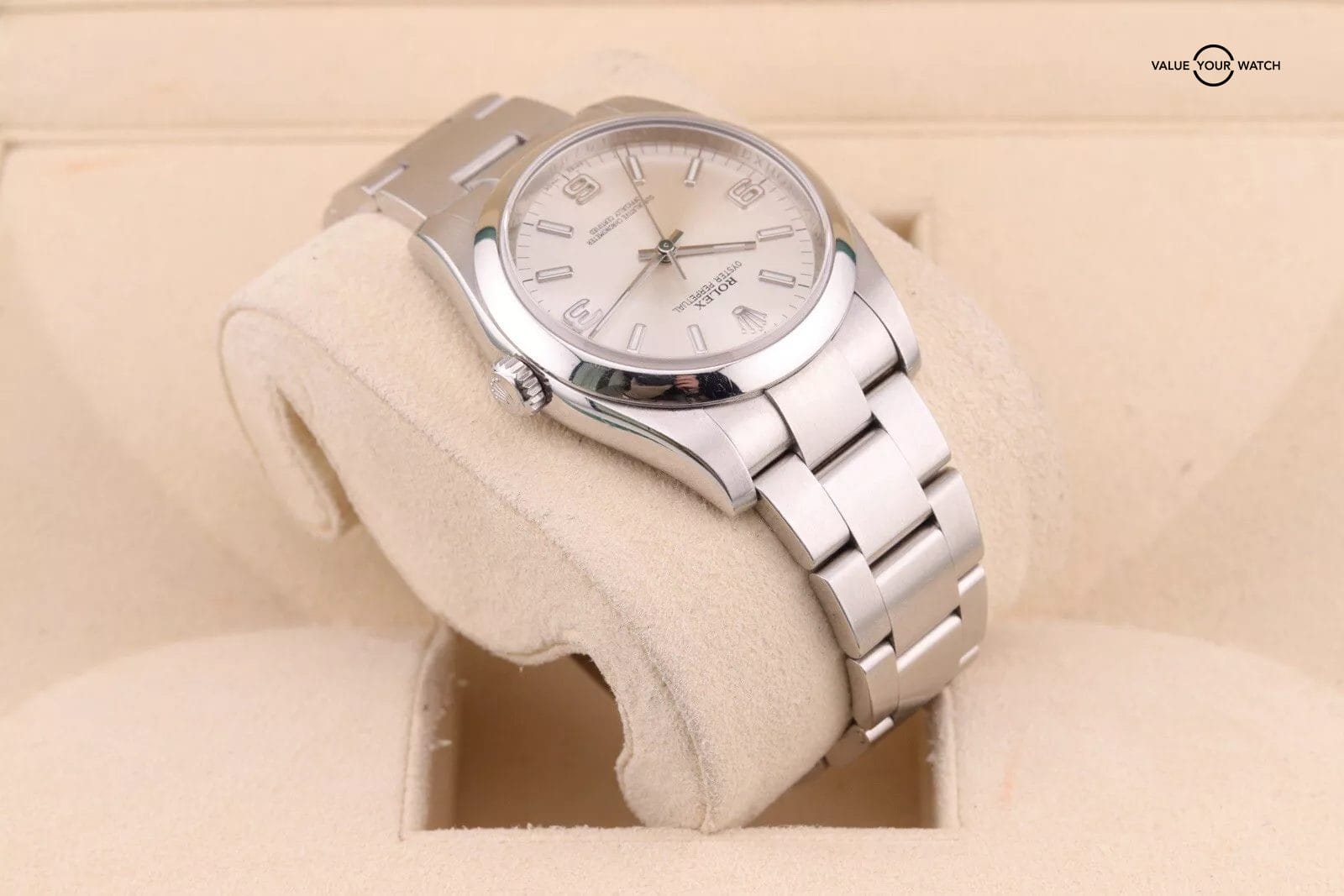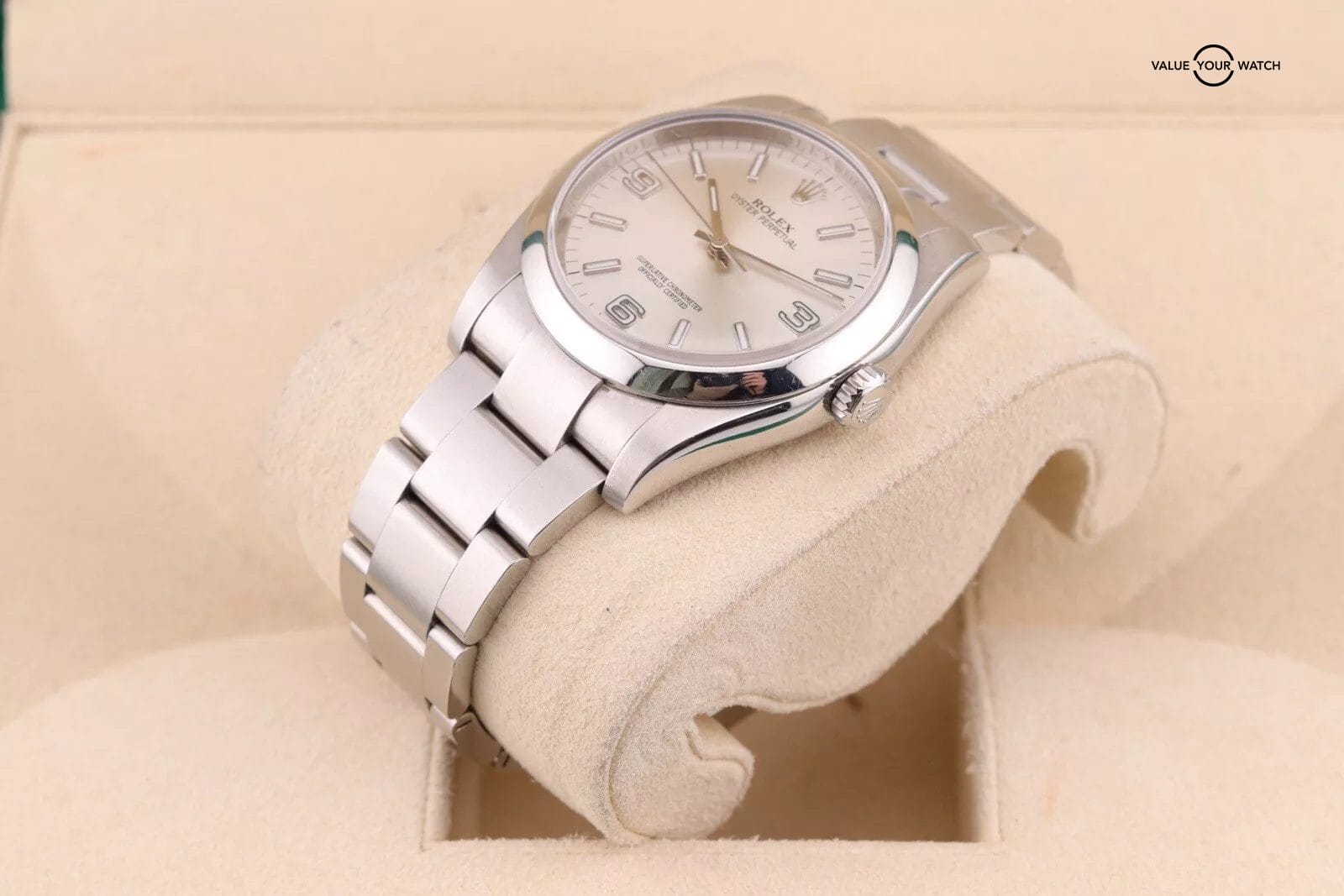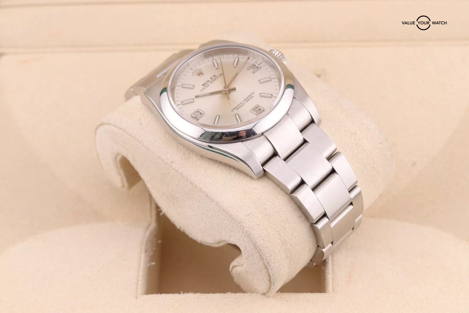 This example has a silver dial with lumed hour markers. The dial is clean from any damage. The crystal has a couple of hairline scratches that are hard to make out against the starburst dial. The case/bracelet are in overall great preowned condition with no major flaws that wouldn’t polish out. One of the links in the bracelet has a more polished finish that is a bit more obvious in photos than in person. Can easily be fixed with refinishing.