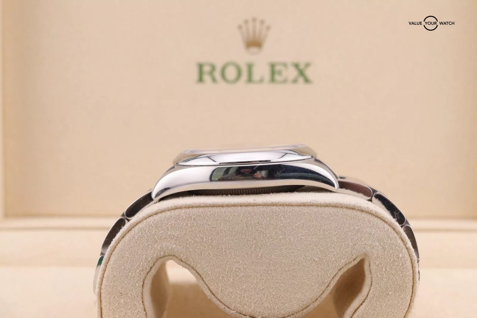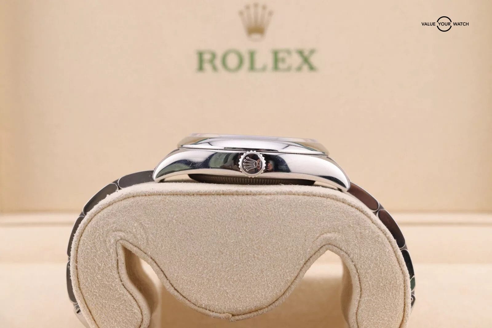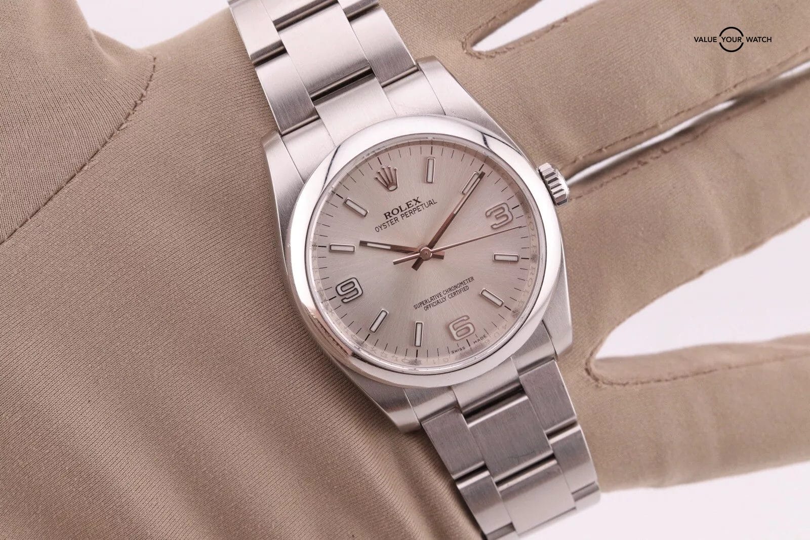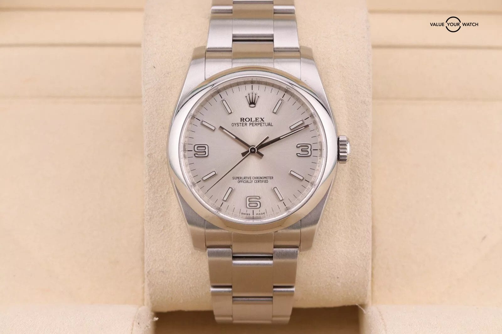 This example has a silver dial with lumed hour markers. The dial is clean from any damage. The crystal has a couple of hairline scratches that are hard to make out against the starburst dial. The case/bracelet are in overall great preowned condition with no major flaws that wouldn’t polish out. One of the links in the bracelet has a more polished finish that is a bit more obvious in photos than in person. Can easily be fixed with refinishing.